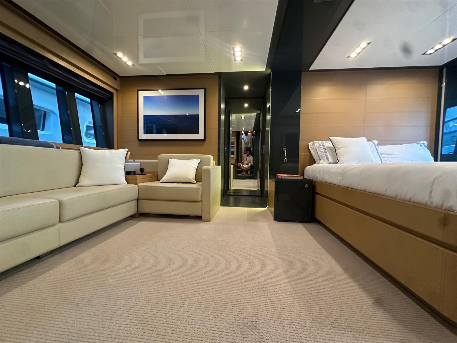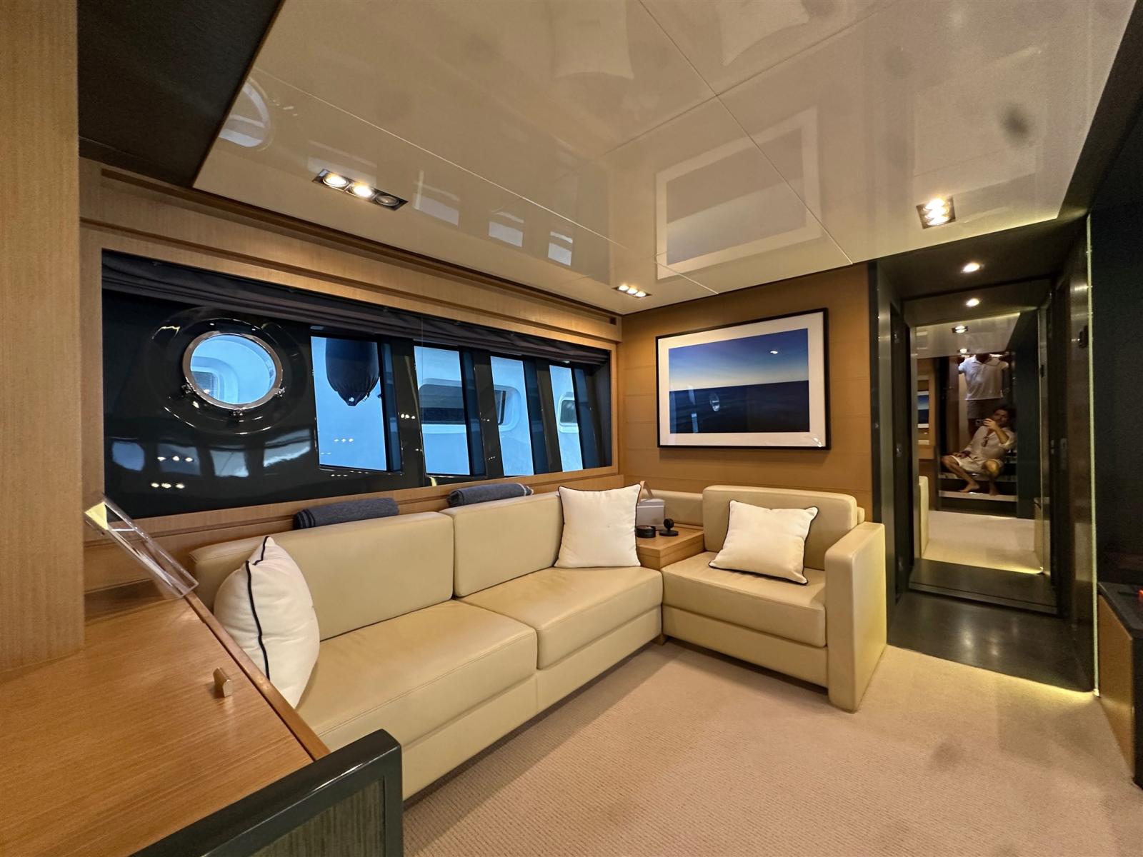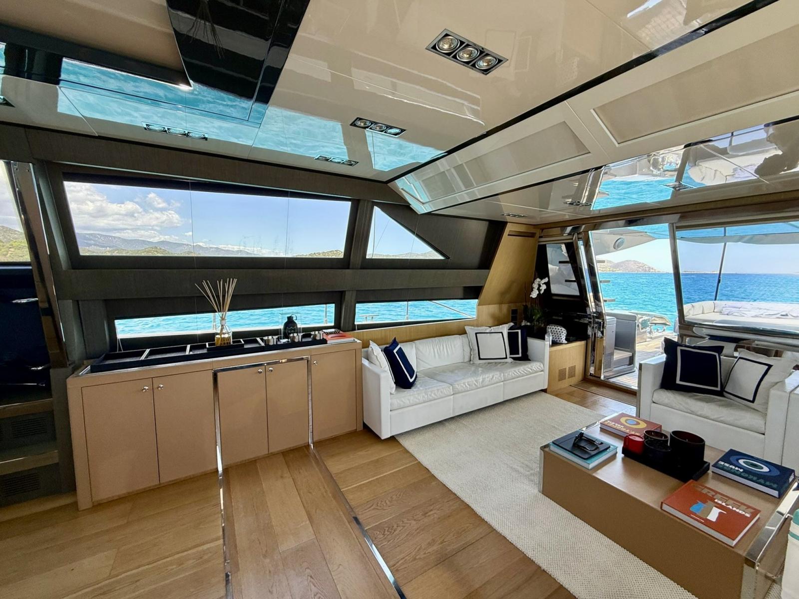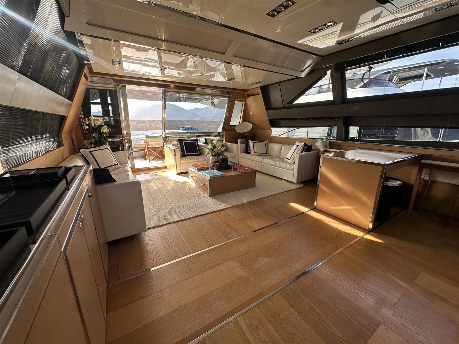 Les intérieurs, lumineux et élégants, sont aménagés de bois clair en noyer Canalletto, de cuir brun chocolat et de laques blanches, pour une atmosphère chaleureuse et sophistiquée. Le grand espace ouvert qui combine la salle supérieure et la salle à manger est séparé de la zone de contrôle par un grand écran TV, une solution qui garantit l’intimité tout en laissant passer une lumière naturelle splendide à travers les grandes vitres latérales et le pare-brise.