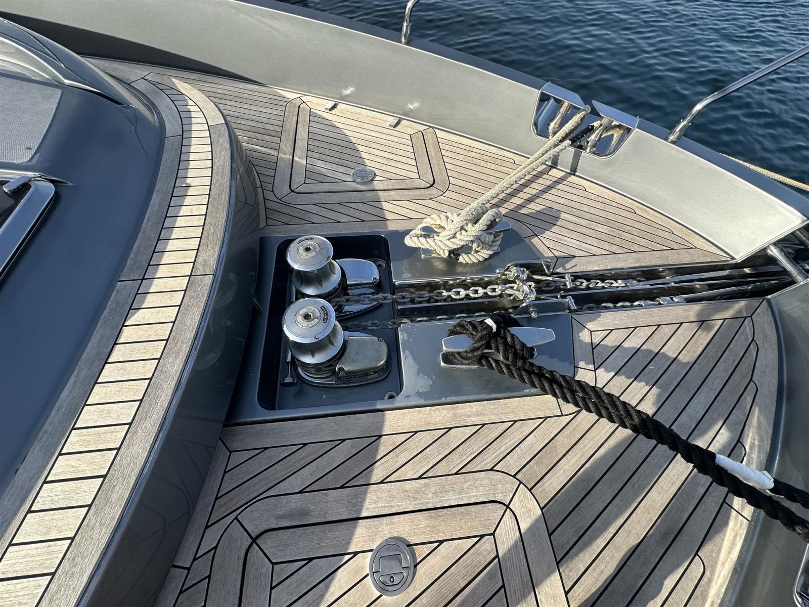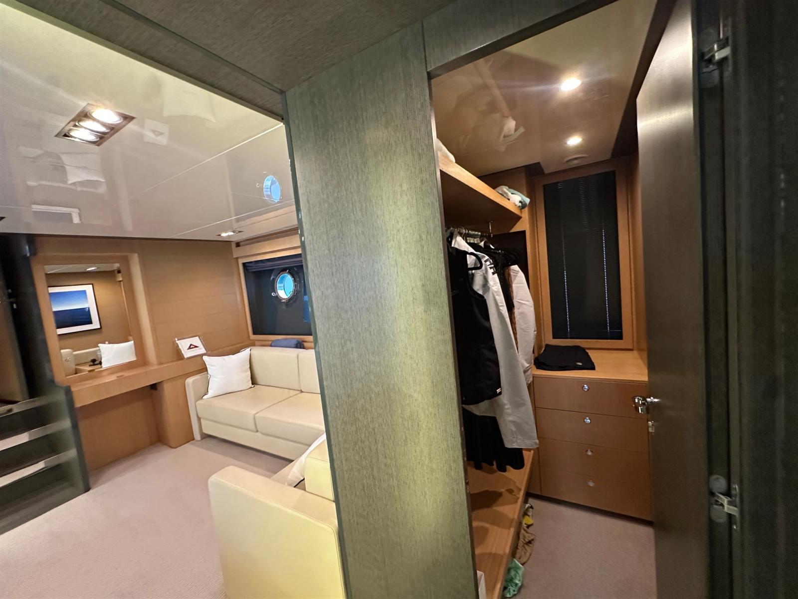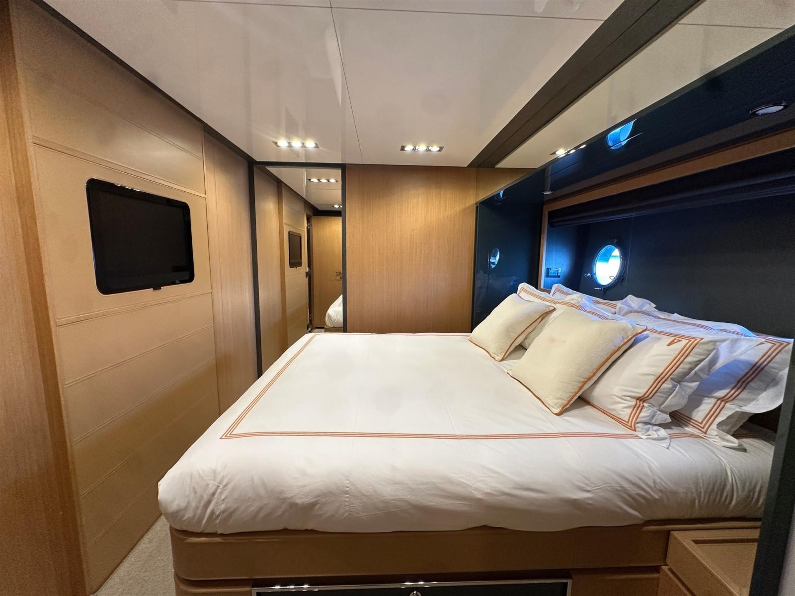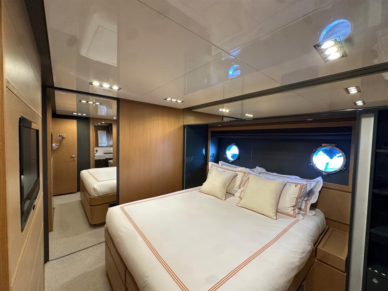 Les intérieurs, lumineux et élégants, sont aménagés de bois clair en noyer Canalletto, de cuir brun chocolat et de laques blanches, pour une atmosphère chaleureuse et sophistiquée. Le grand espace ouvert qui combine la salle supérieure et la salle à manger est séparé de la zone de contrôle par un grand écran TV, une solution qui garantit l’intimité tout en laissant passer une lumière naturelle splendide à travers les grandes vitres latérales et le pare-brise.