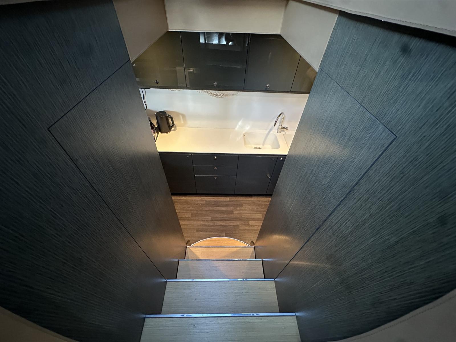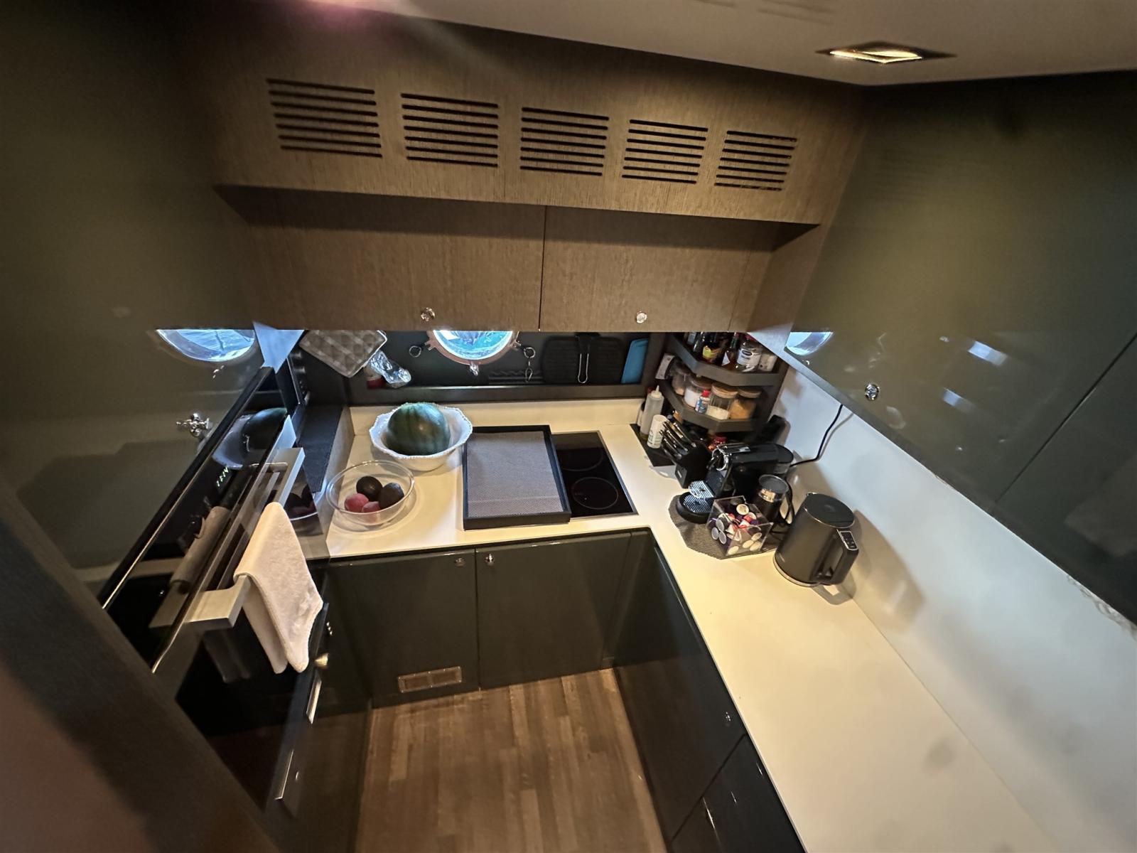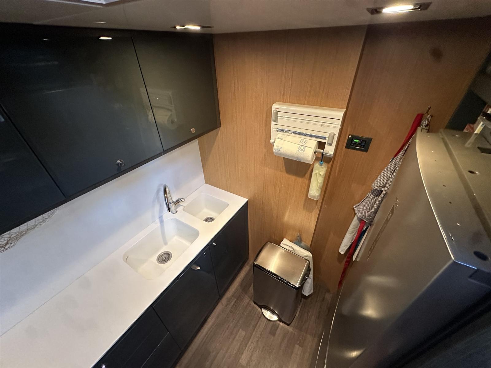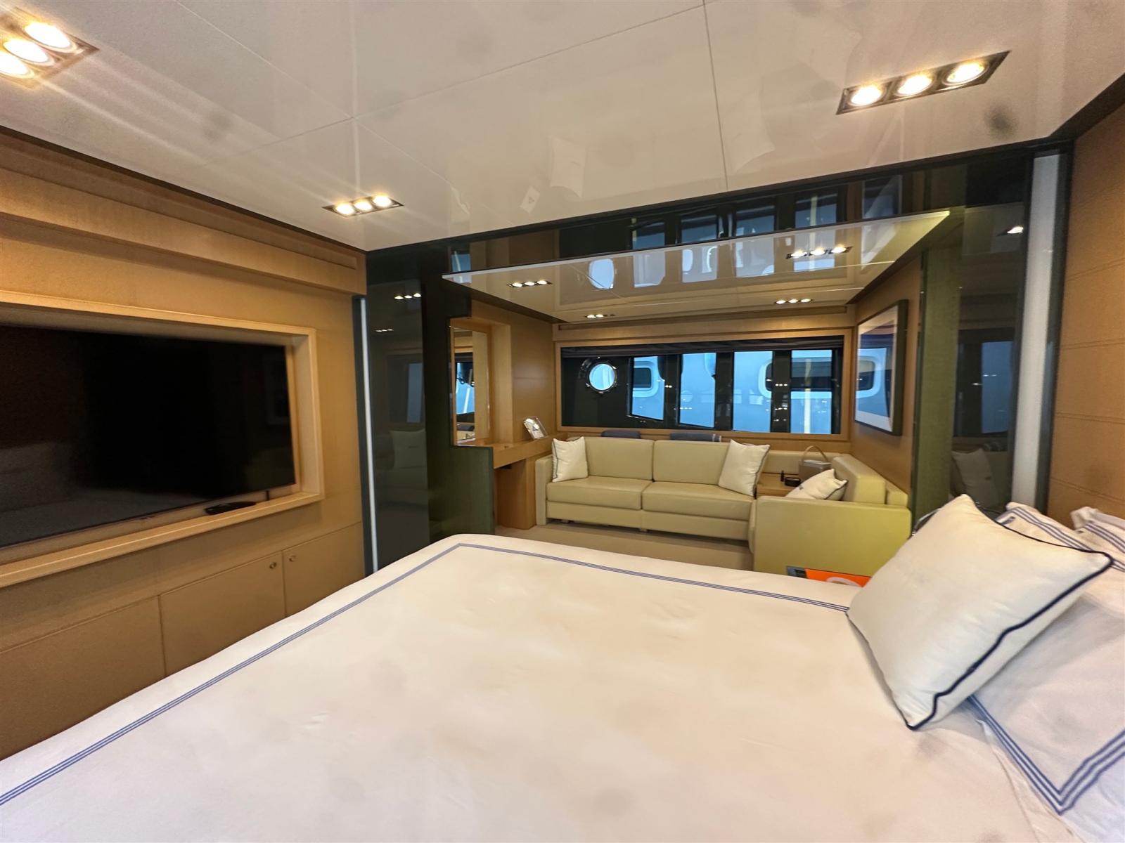 Les intérieurs, lumineux et élégants, sont aménagés de bois clair en noyer Canalletto, de cuir brun chocolat et de laques blanches, pour une atmosphère chaleureuse et sophistiquée. Le grand espace ouvert qui combine la salle supérieure et la salle à manger est séparé de la zone de contrôle par un grand écran TV, une solution qui garantit l’intimité tout en laissant passer une lumière naturelle splendide à travers les grandes vitres latérales et le pare-brise.