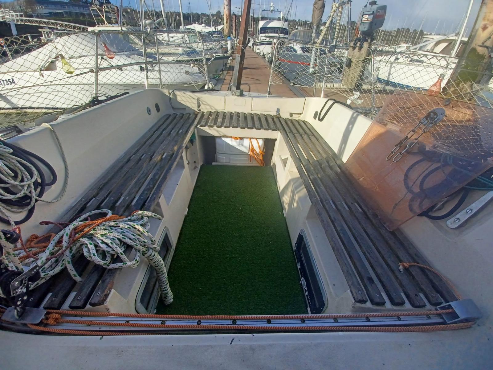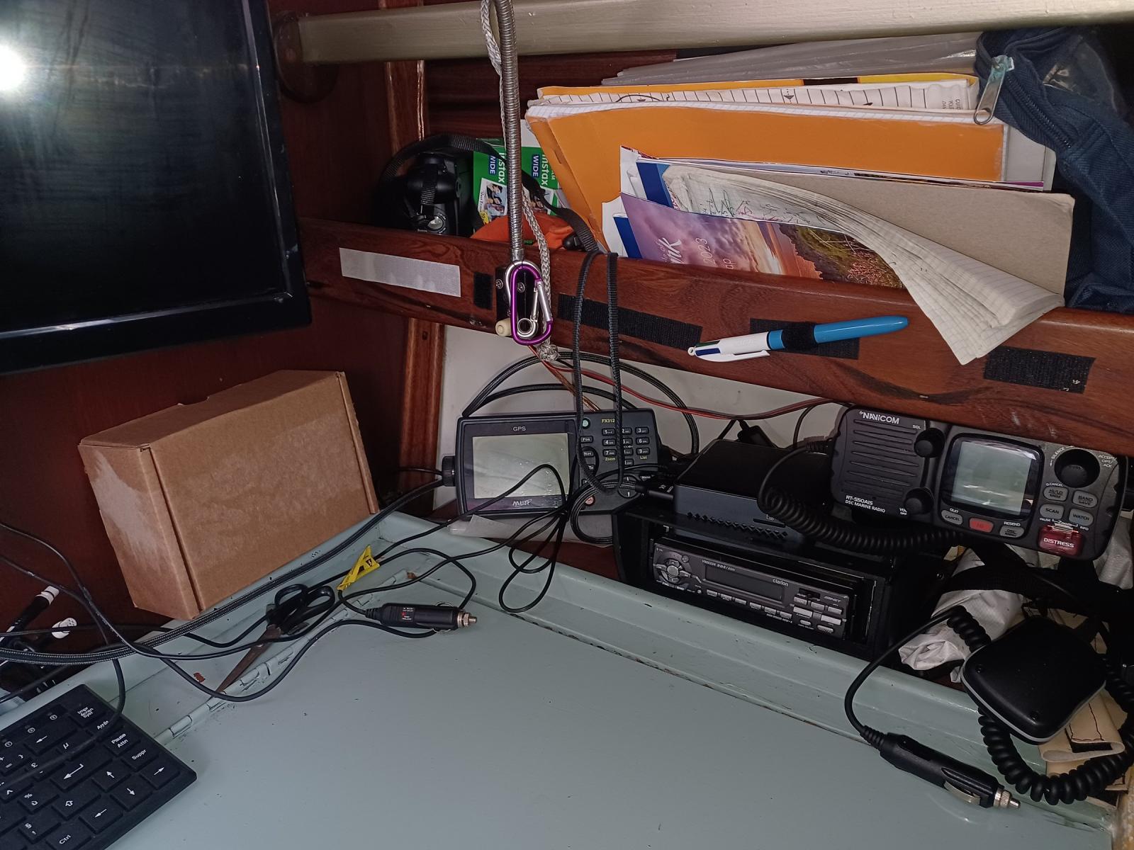 ÉLECTRONIQUE : Micro-ordinateur avec écran fixe/Linux, GPS MLR FX312 couplé NMEA à la VHF Navicom RT550 AIS de 2022, sondeur NASA, téléphone satellite Garmin Inreach encore dans son emballage, pilote auto Raymarine EV100 de 2023, girouette/anémo neuve à poser. 2 compas de route Contest récents.