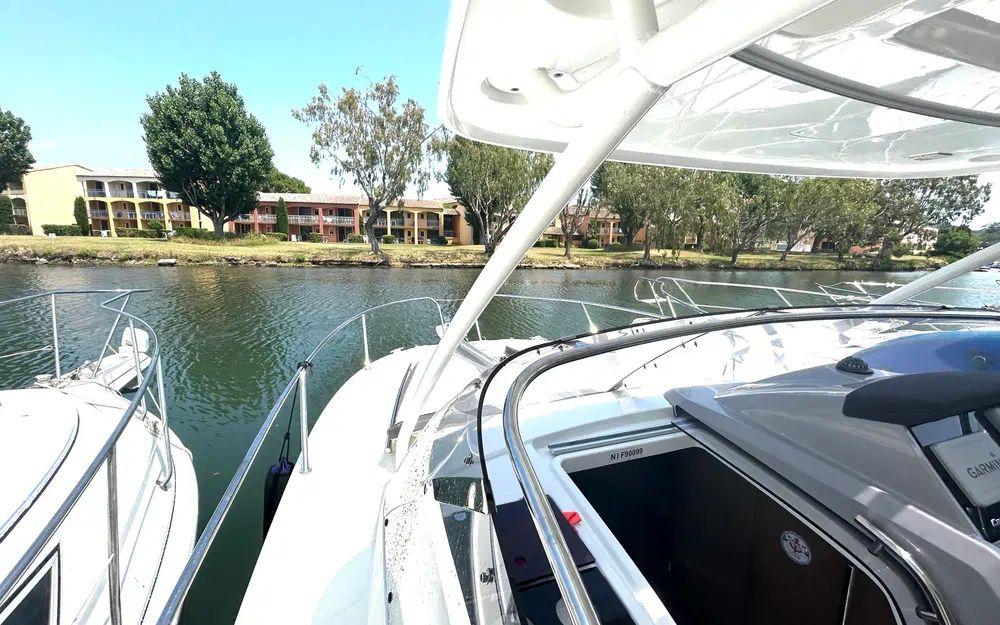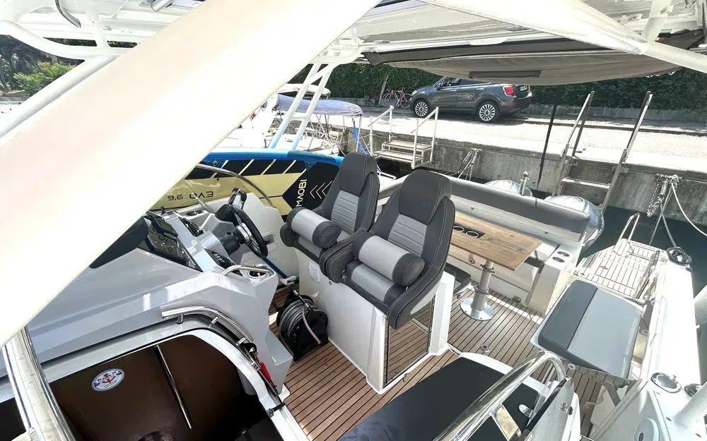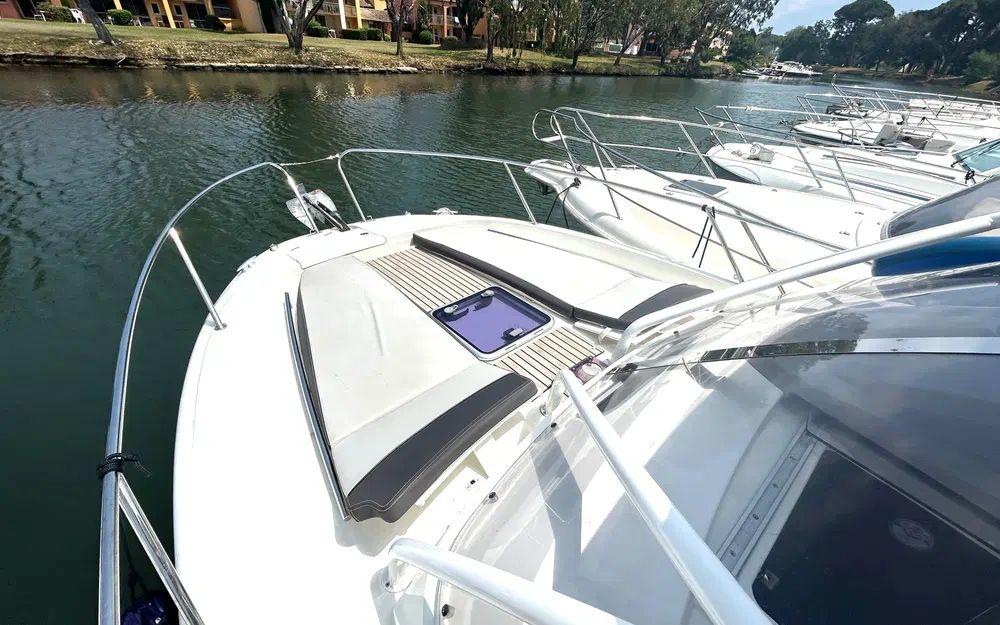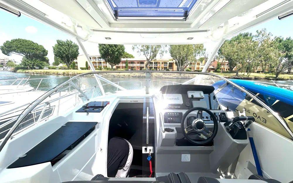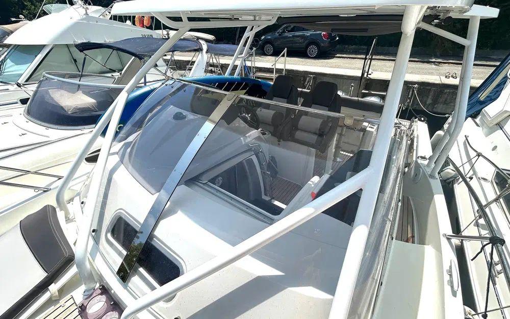 Il dispose d’un pont en teck, d’une électronique complète pour la navigation, d’une sellerie propre et soignée ainsi que de nombreux rangements. La version hard-top apporte un confort appréciable en toutes saisons, avec une protection efficace tout en conservant une excellente visibilité.