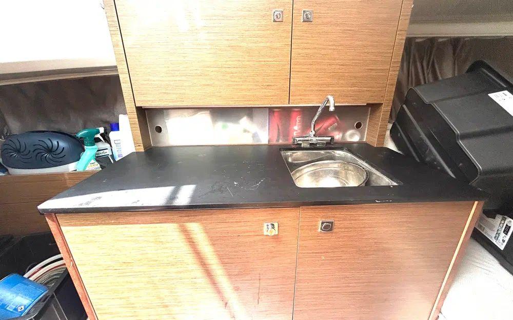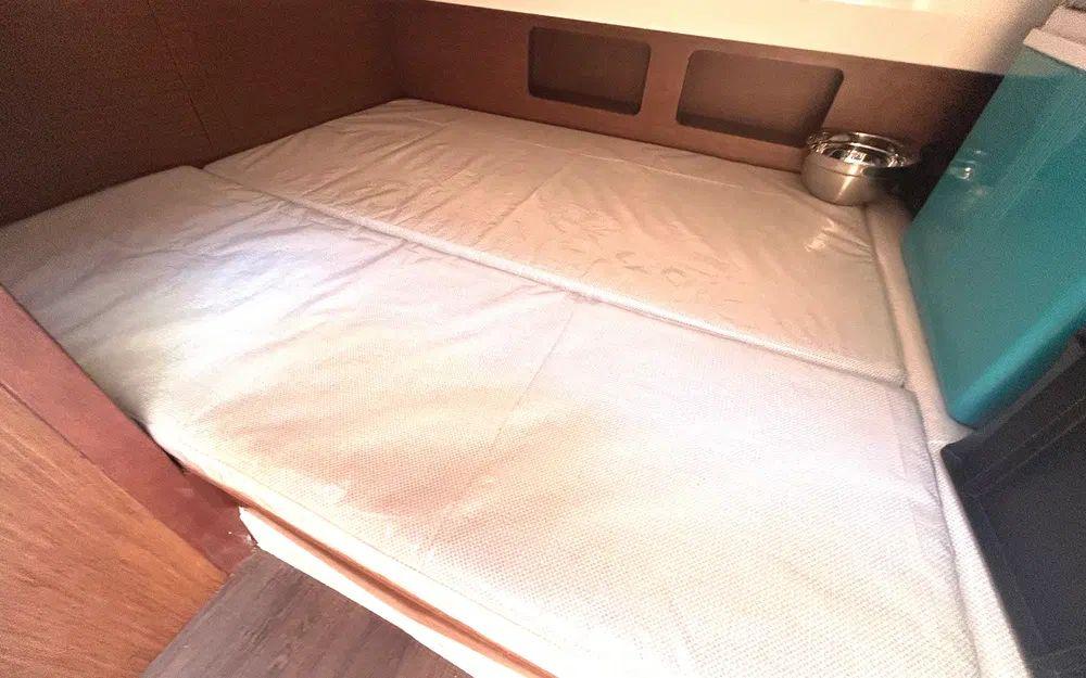 L’intérieur est chaleureux et fonctionnel, avec une configuration permettant 4 couchages : un espace nuit double et un carré convertible. Le tout est en très bon état, prêt à accueillir une famille ou un couple pour des nuits au mouillage.