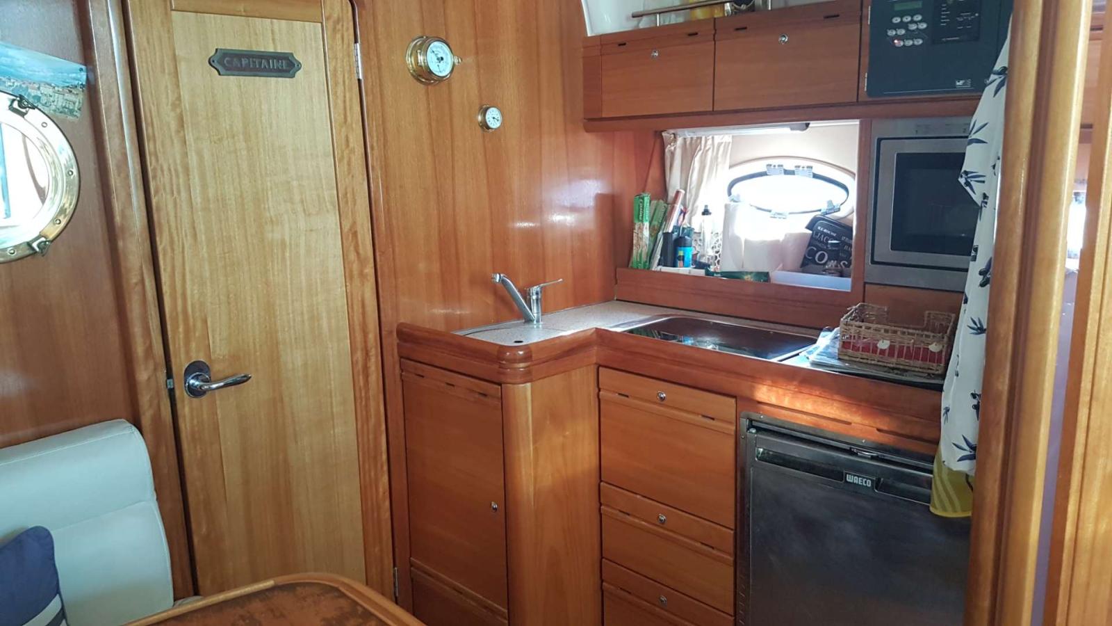 L’intérieur offre un confort appréciable pour plusieurs jours à bord, grâce à la climatisation réversible, une TV, radio Bluetooth récente et un coin repas convivial. La cuisine est équipée d’une plaque gaz, d’un frigo, d’un micro-ondes et de nombreux rangements. La salle d’eau dispose d’un WC électrique et d’une douche séparée. Deux cabines sont présentes : une cabine propriétaire avec rangements et penderies ainsi qu’une cabine invités modulable en lit double ou deux simples.