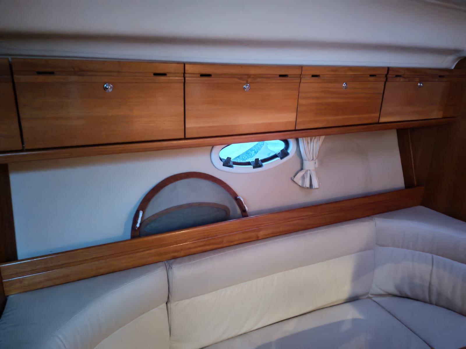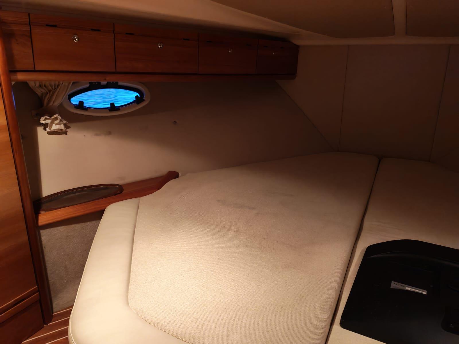 Il est motorisé par deux Volvo Penta essence de 320 ch, totalisant seulement 360 heures. Les collecteurs ont été remplacés en 2025 et l’ensemble de la mécanique est suivi avec rigueur. Trim électrique, propulseur d’étrave et guindeau électrique facilitent toutes les manœuvres, aussi bien au port qu’en navigation.
