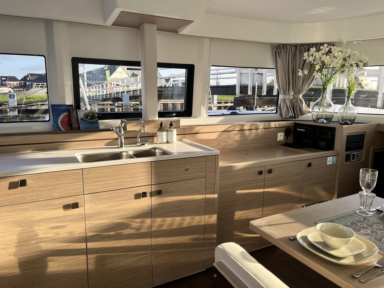 Congélateur (80 liter), Cuisine, 4 Cuisinière (Gas), Four (Force 10), Réfrigérateur extérieur (Cockpitlade met 2 koellades á 144 liter), Réfrigérateur intérieur (Frontlade van 154 liter & schuiflade van 64 liter).