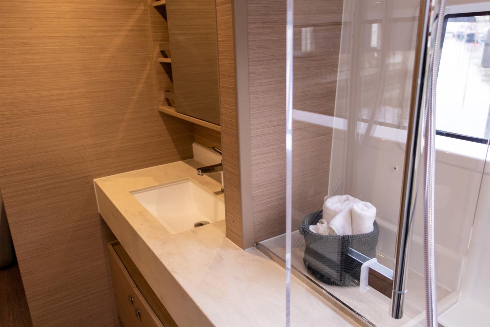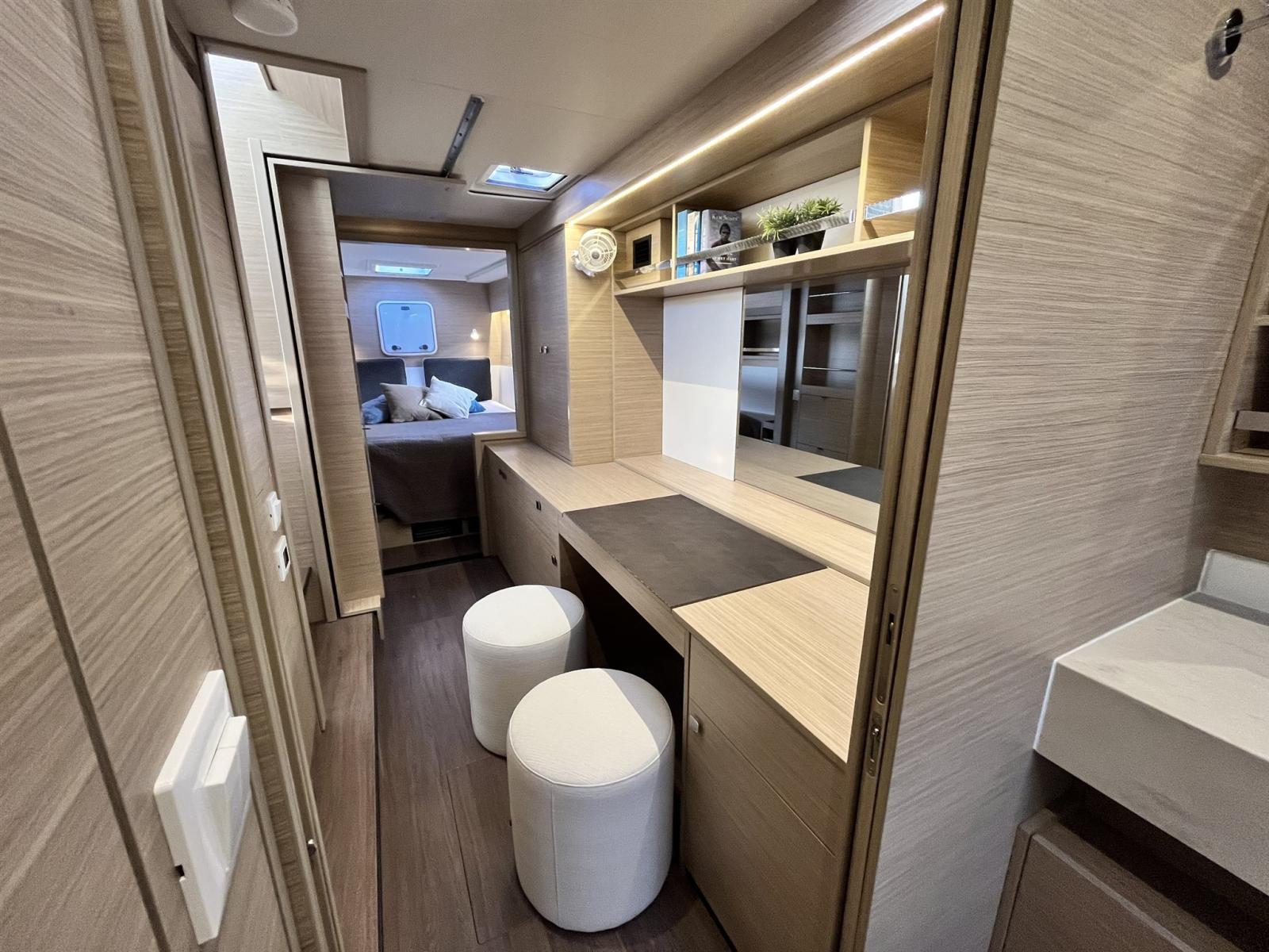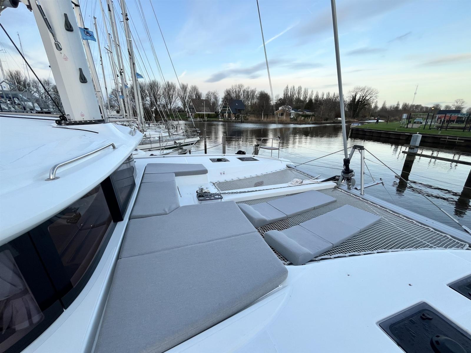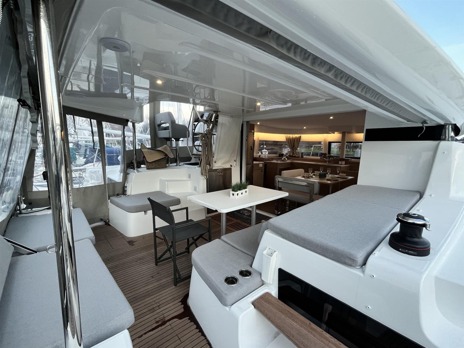 Alternateur, Ancre (bevestiging: Ketting), Eau sous pression (dockwater inlet voor direct drinkwater vanaf de wal. In de kombuis is een elektronische zuiveraar geïnstalleerd), 3 Batteries (95 Ah per battery), Douche de cockpit (deck), Bossoirs (Davits), Éclairage de courtoisie (Ambiance), Spots sous-marins (Blue), Panneau solaire, Plateforme arrière, Pompe de cale manuelle, Cockpit en teck, Prise de quai, Guindeau électrique, Echelle de coupée, Echelle de bain, table de cockpit, Filières avec sortie latèrale, 2 Winch électrique, 2 Winch hydraulique.