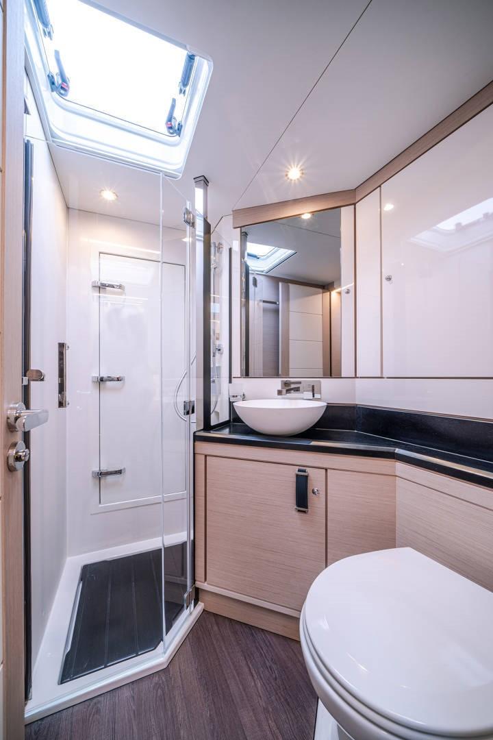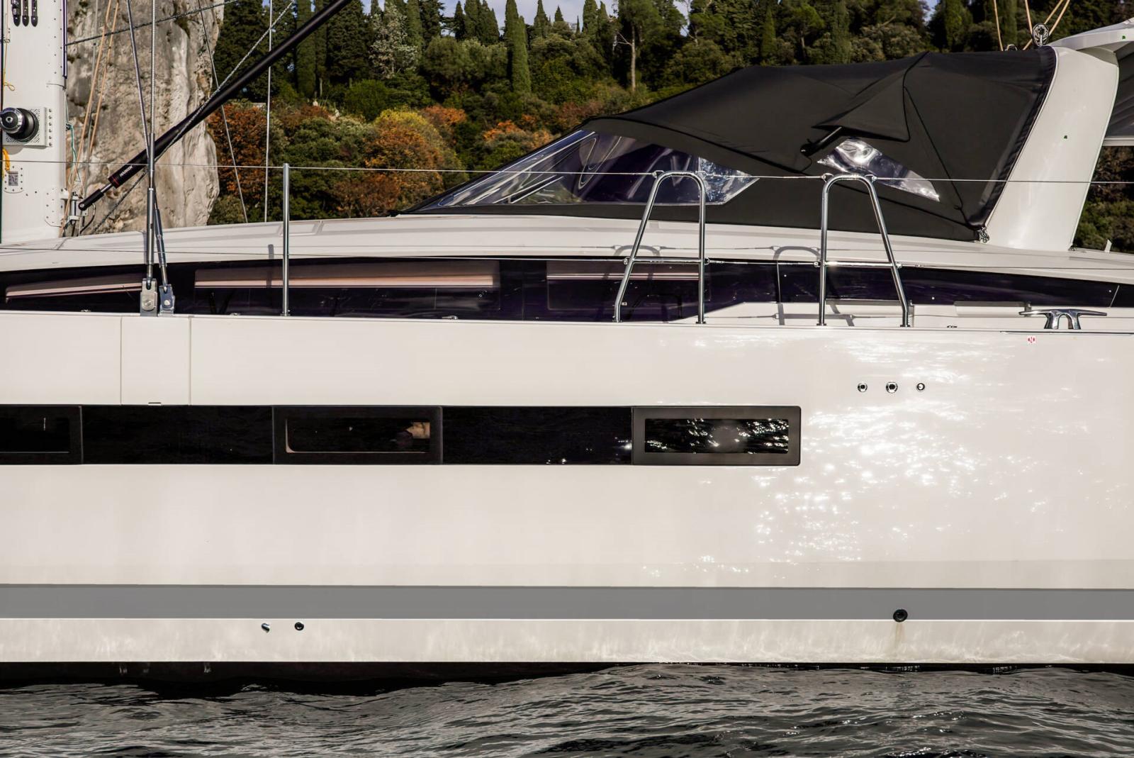 Alternateur, remorque, Double barre à roue, Éolienne, Bossoirs, Bossoirs pour annexe, Panneau solaire, Plateforme arrière, Pompe de cale manuelle, Pont en teck, Prise de quai, Echelle de bain, Stabilisateurs, table de cockpit, Annexe, Winch hydraulique.