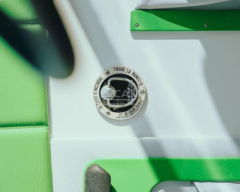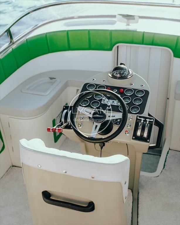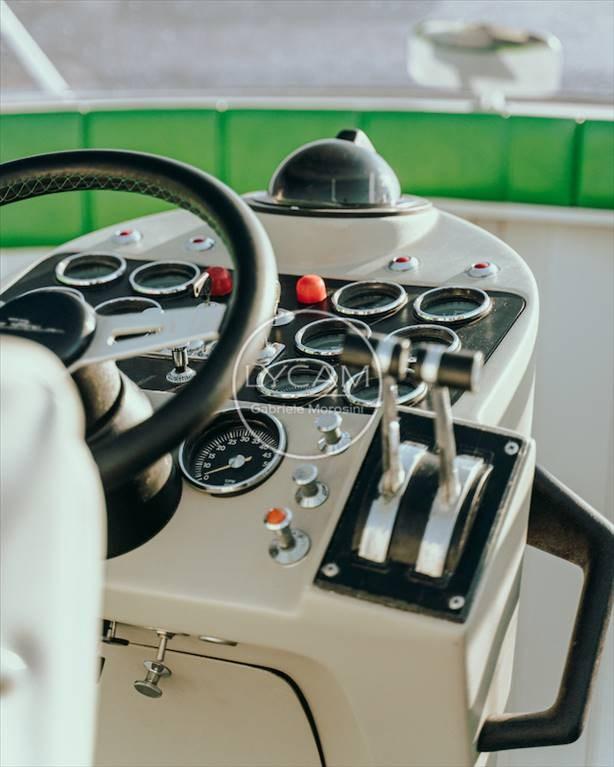Le cockpit du bateau à moteur est de type classique, avec un grand pont ouvrier arrière et un siège de pilote central et enveloppant, à la proue une cabine avec deux couchettes, le tout aménagé avec une grande attention aux détails.