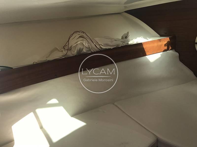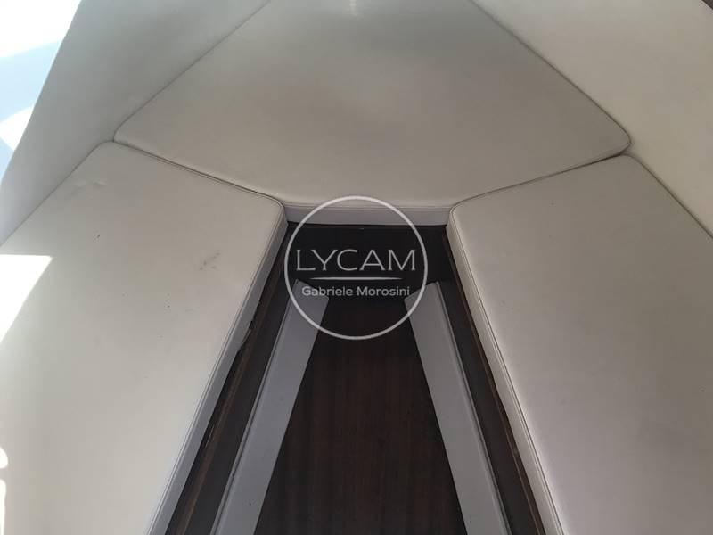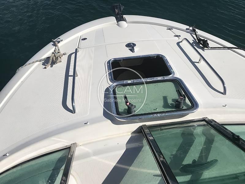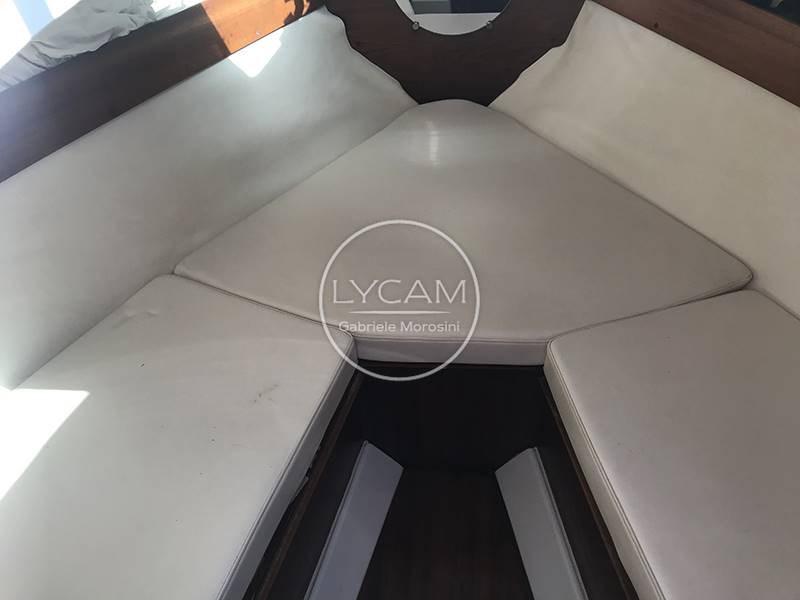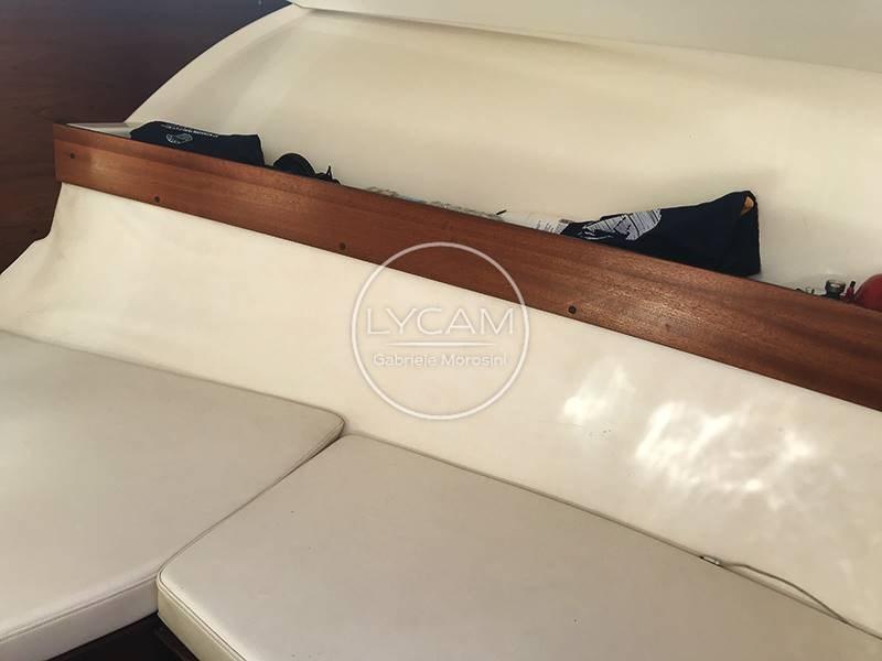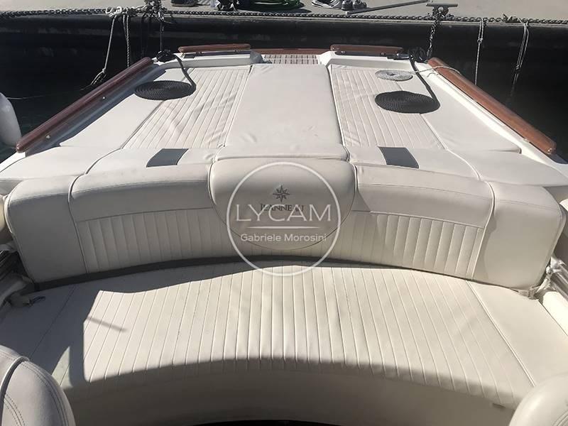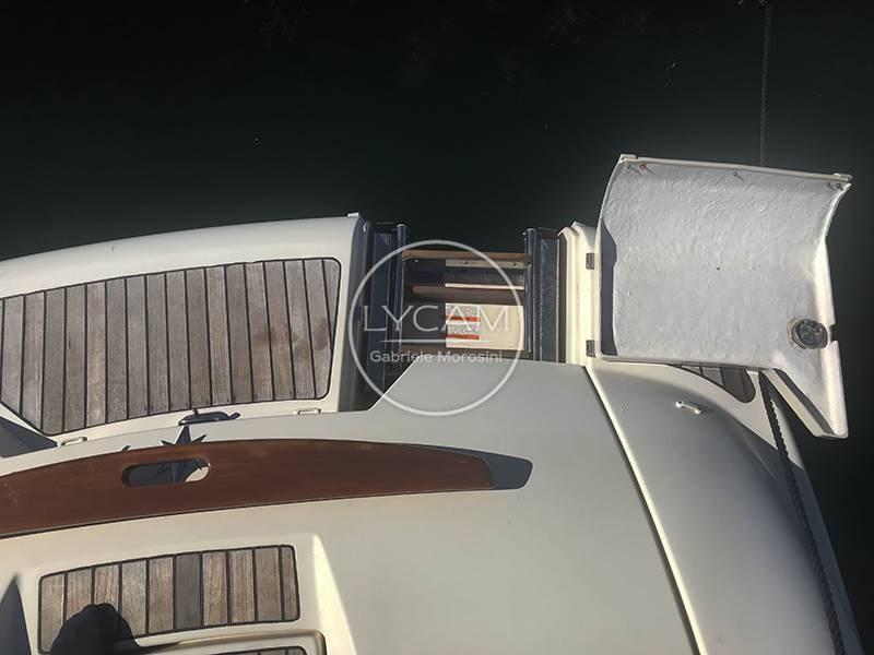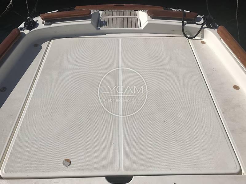 La plateforme arrière intégrée à la coque permet un accès facile au cockpit. Il s’agit d’un confortable balcon à l’avant, dont se trouve un canapé servi par une table rétractable. La timonerie est située du côté tribord tandis que de l’autre côté se trouve le siège du copilote. Le pare-brise enveloppant peut être ouvert pour permettre un accès sécurisé à la zone avant du pont. Entre les deux séances de pilotage, il y a la passerelle pour la descente sous le pont. Ici, une petite salle à manger en forme de V a été créée et peut être transformée en lit double.