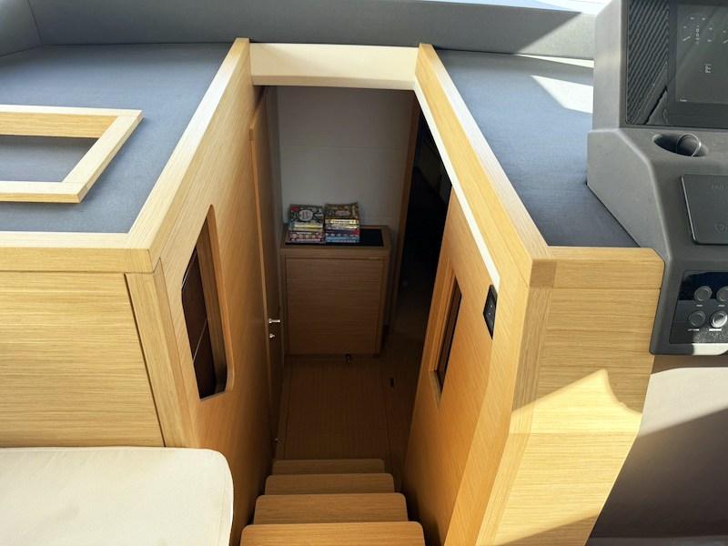 La plateforme arrière mène au cockpit, caractérisé par un canapé en forme de U confortable qui se transforme en pont d’exposition. La grande fenêtre sépare l’espace extérieur convivial de la salle à manger intérieure. Il s’agit d’un canapé en forme de C à gauche tandis que de l’autre côté se trouve la cuisine. En direction de la proue, se trouve la timonerie avec des sièges pour le pilote et le copilote sur tribord, l’accès à la cabine de l’équipage sur la gauche.