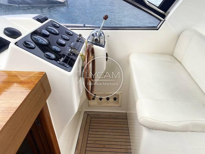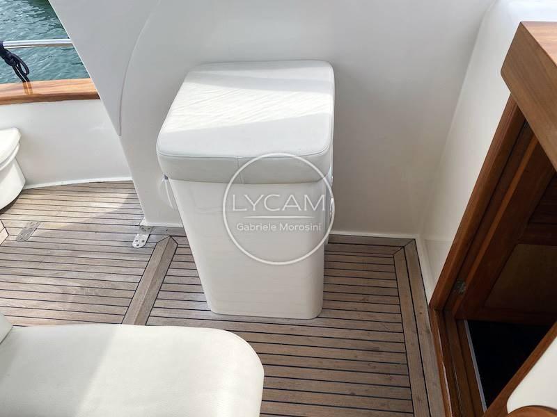 Grâce à la plateforme en bois confortable, on peut accéder au cockpit caractérisé par deux sièges placés le long du rétroviseur arrière. En direction de la proue, la station de pilotage est du côté tribord et le siège du copilote du côté bâbord.