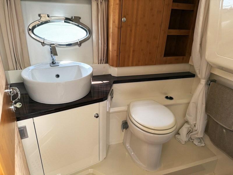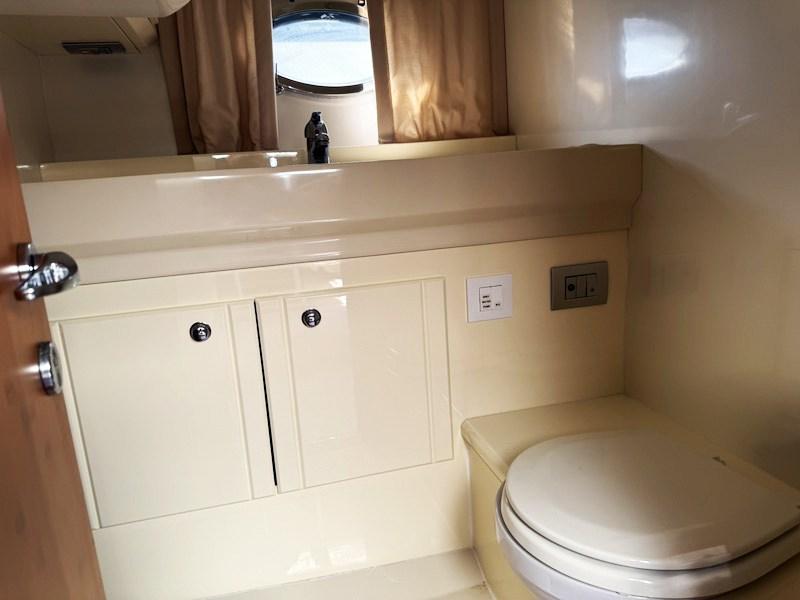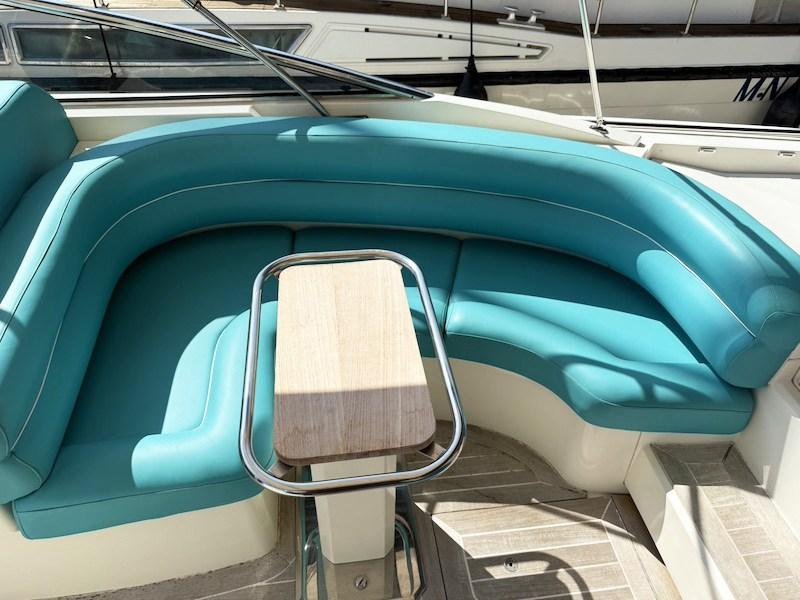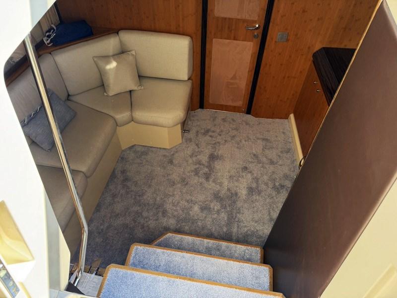 Depuis la poupe, une élégante plateforme recouverte de teck mène, à travers trois grêlons confortables, au cockpit. Cela se caractérise par la grande terrasse de soleil et deux canapés en forme de C placés de chaque côté. En continuant vers la proue, il y a la station de barre sur tribord et une grande passerelle afin de rendre l’espace intérieur plus aéré. Descendent sous le pont la salle à manger et la cuisine. À la proue, il y a une grande suite propriétaire confortable desservie par une salle de bain avec une grande douche. À l’arrière, sous le cockpit, se trouve une cabine d’amis avec deux chambres avec salle de bain dédiée