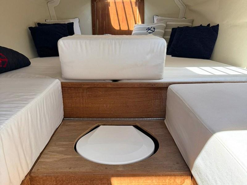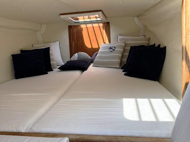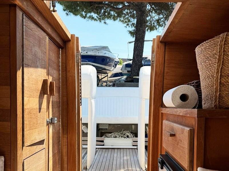 La passerelle en bois relie la zone sous le pont, équipée d’un lit avant en V et d’une toilette marine rétractable. À gauche de l’escalier de descente se trouve un placard avec un réfrigérateur intérieur.