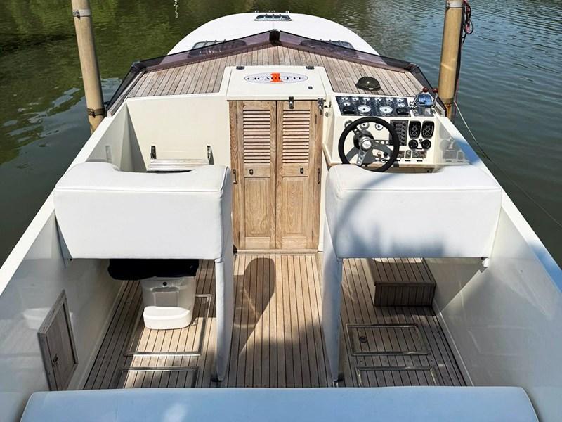 La plateforme en teck mène au pont ouvrant arrière qui dissimule le coffre moteur. Le cockpit est équipé d’un canapé sur le côté, le siège du pilote sur tribord et celui du copilote de l’autre côté.