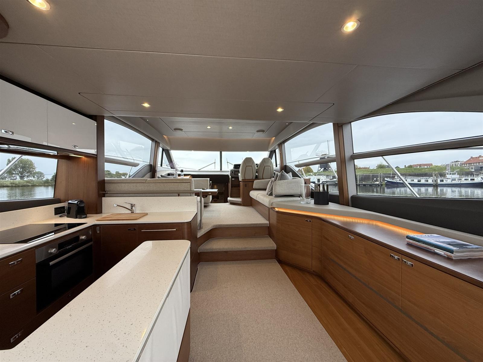 • Bandes lumineuses d’accentuation de bas niveau sous le bar et la console du flybridge, spots d’accentuation (3) sur le tableau arrière, 7 lumières de pont supplémentaires sur le pont latéral et le pont avant (13 au total), lanternes escamotables dans la dînette avant du flybridge (2)