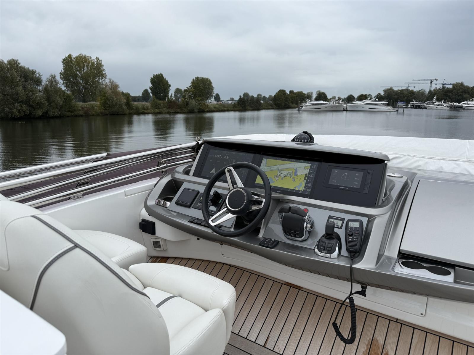 • Commande par joystick Volvo (double station) avec manœuvres à basse vitesse en « mode d’amarrage » et direction à n’importe quelle vitesse en « mode conduite ». Fait fonctionner les moteurs, la direction et le(s) propulseur(s), y compris le propulseur de poupe (propulseur d’étrave amélioré à 210 KgF avec vitesse variable)