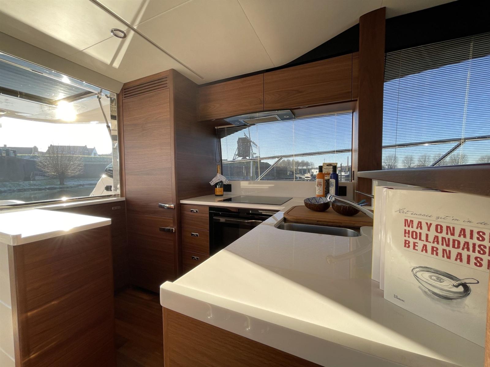 En plus de son extérieur enchanteur, elle est aussi très élégante à l’intérieur. Sa cuisine confortable à l’arrière, avec une salle à manger ouverte en face, possède des portes coulissantes et une fenêtre électrique s’ouvrant complètement qui mène au cockpit pour créer un bar en plein air. Sous le pont, huit invités peuvent être logés dans quatre cabines, dont trois avec salle de bain attenante.