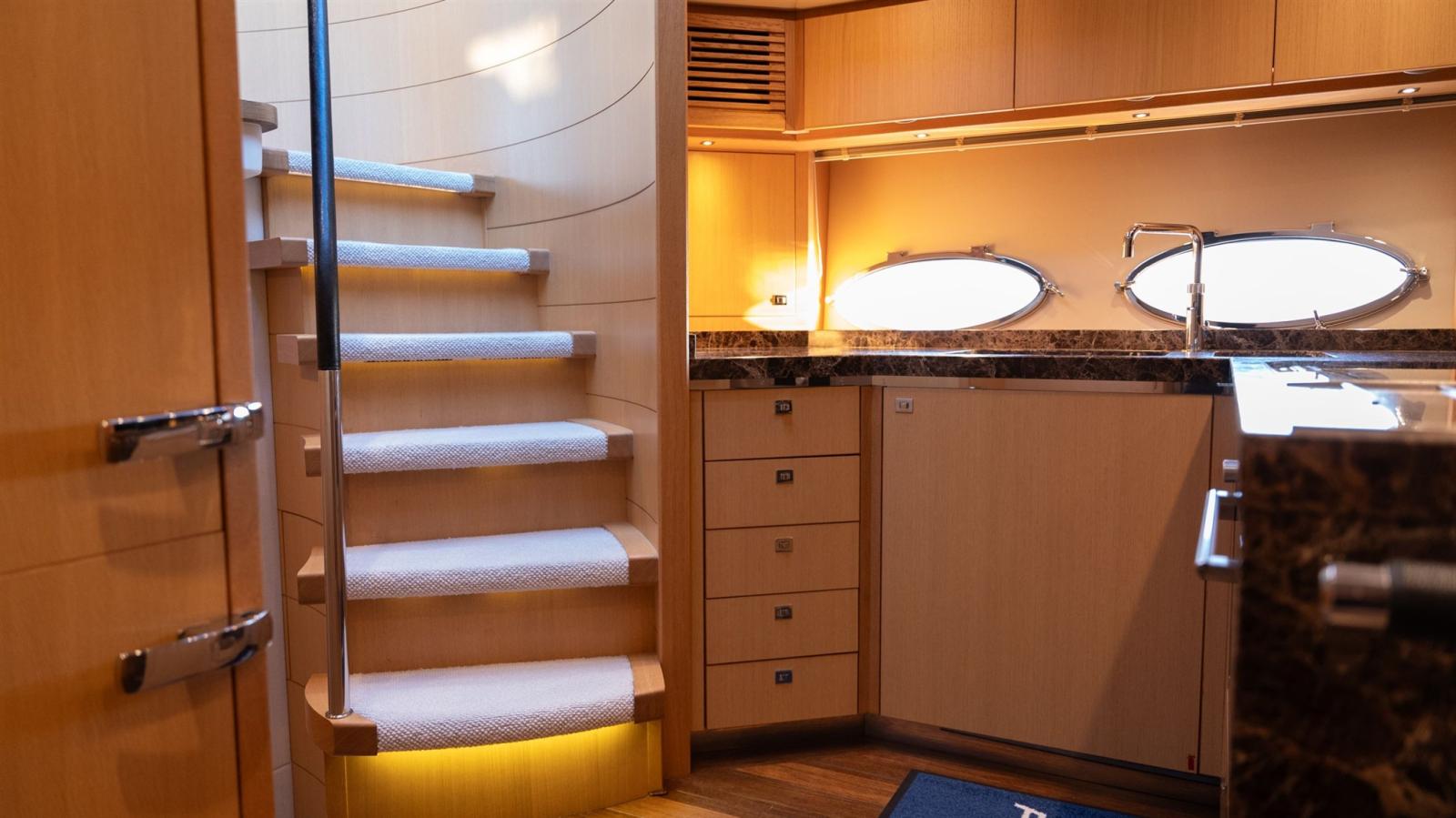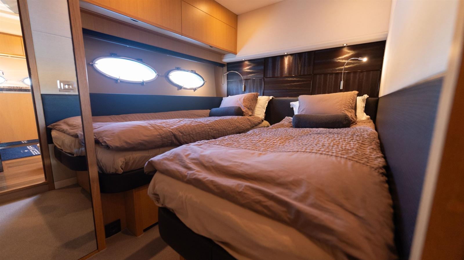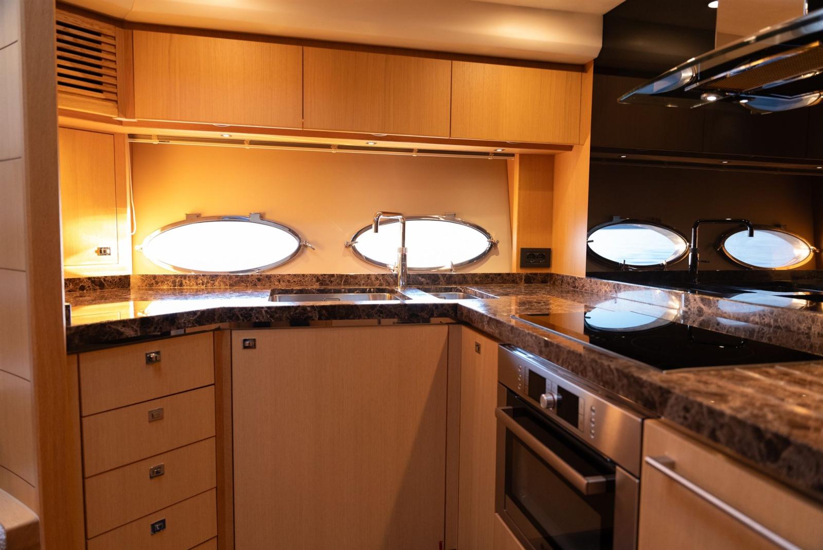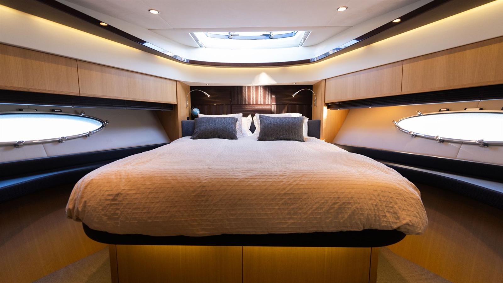 Le cockpit est spacieux et dispose d’un système unique de tireuse à bière entièrement refroidie. De plus, le bateau est entièrement équipé, entre autres, d’un propulseur hydraulique d’étrave et de poupe, d’un système de stabilisation des ailerons et d’un système de stockage automatique des câbles d’alimentation à quai.