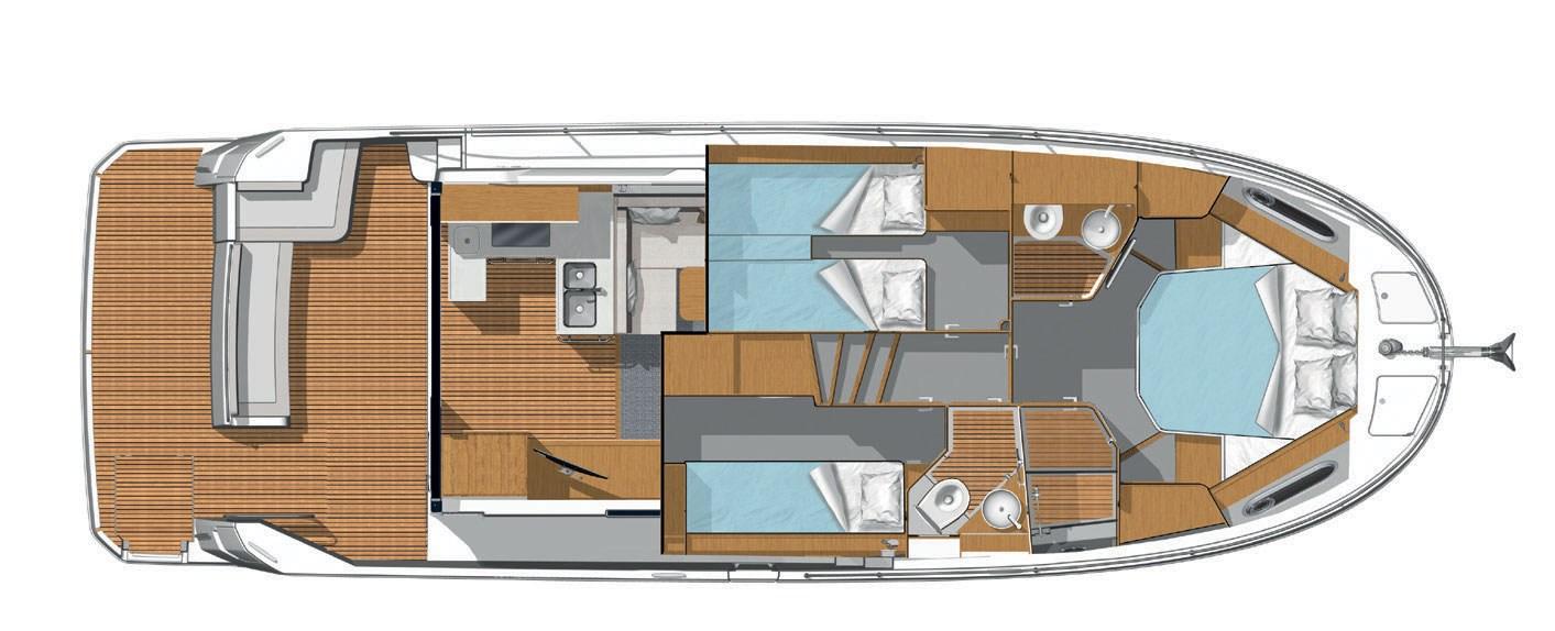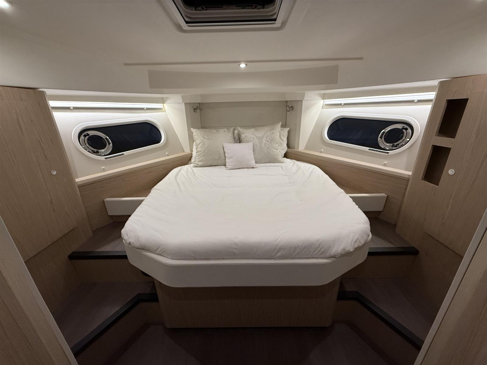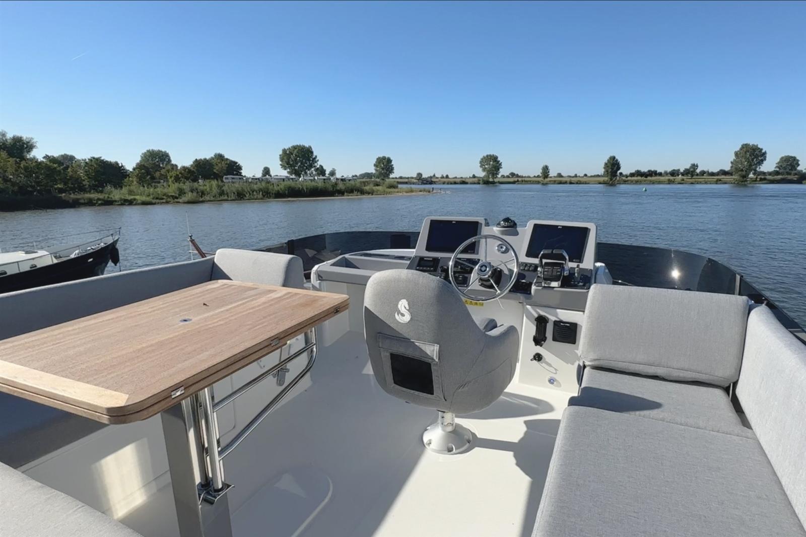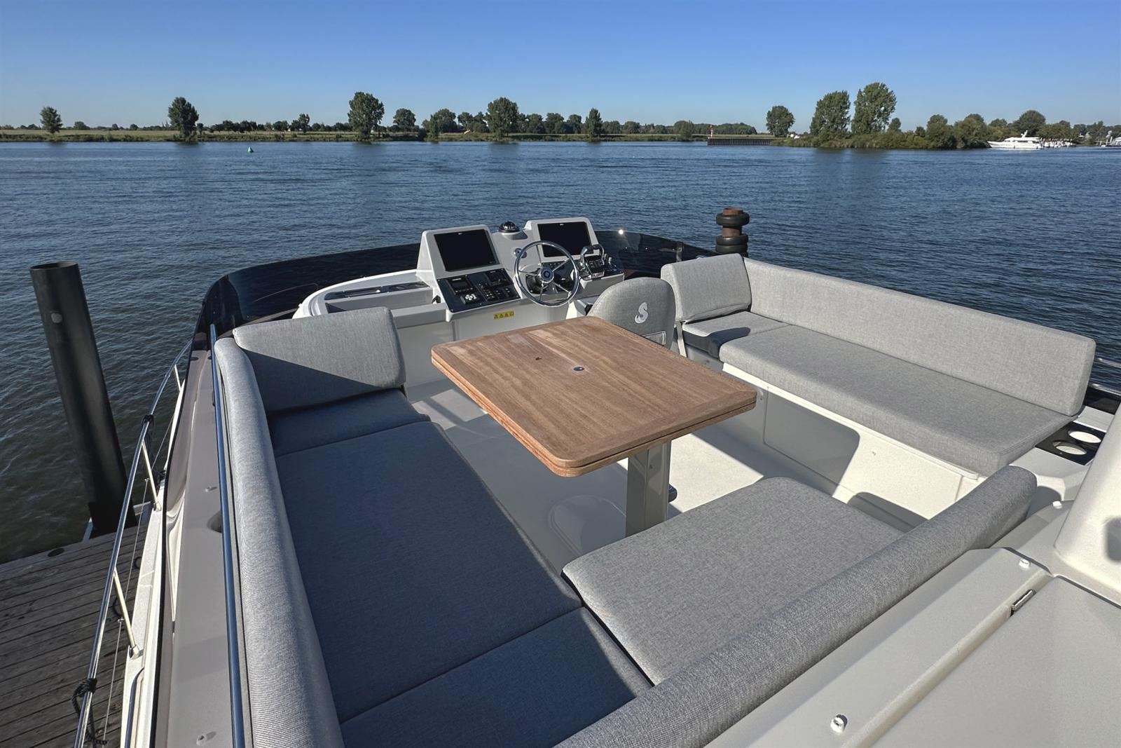 La disposition intelligente offre 3 cabines confortables avec 2 salles de bain intégrales et un salon qui se transforme en 2 couchettes supplémentaires en un rien de temps. Le flybridge est le plus grand de sa catégorie et offre un siège spacieux ainsi qu’une seconde position de direction complète avec une vue panoramique. La passerelle large, basse et asymétrique, la porte latérale généreuse à la position de direction et la porte supplémentaire donnant sur le quai rendent l’amarrage facile et sûr. Le navire est très richement équipé et dispose des options suivantes, notamment : chauffage Webasto, propulseur à la proue et à la poupe, traceur Raymarine, caméra de recul, radar, onduleur.