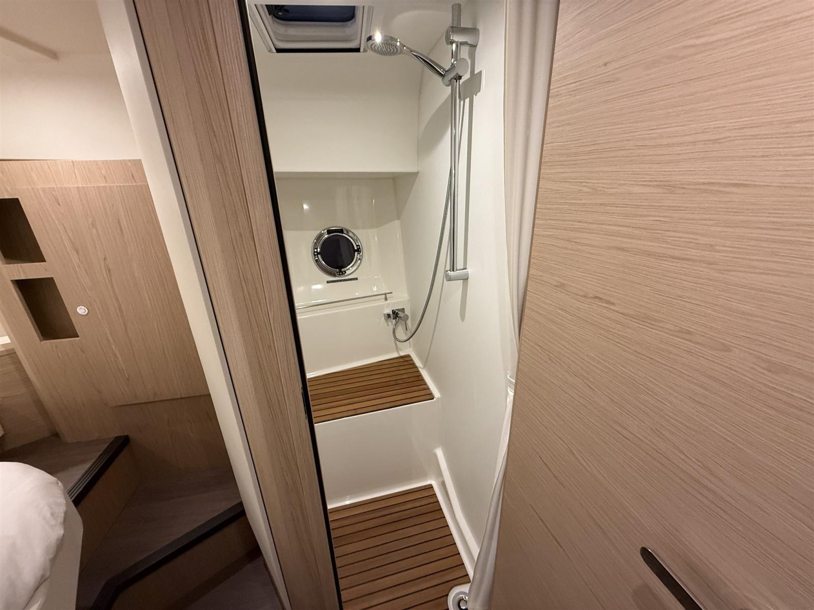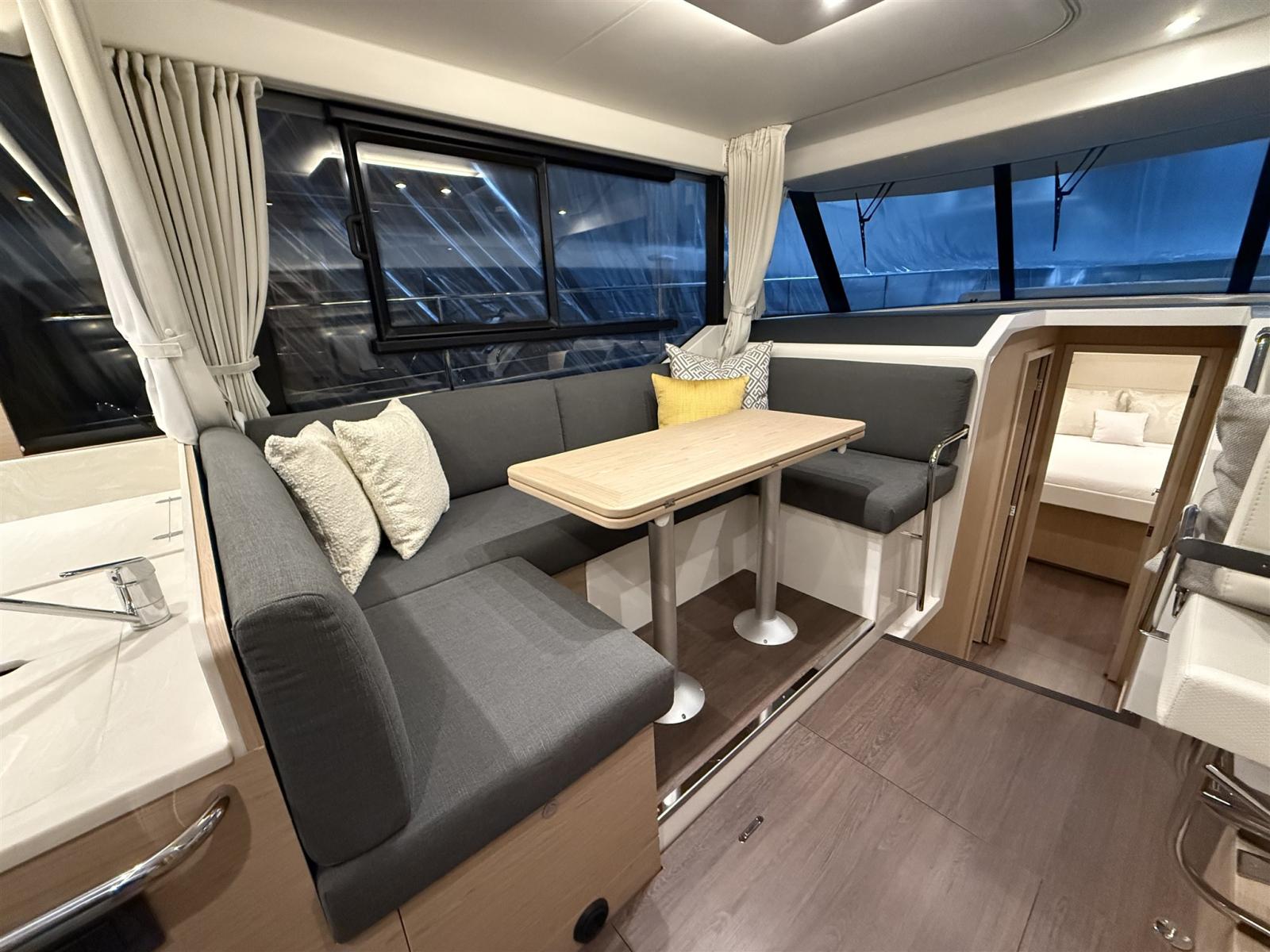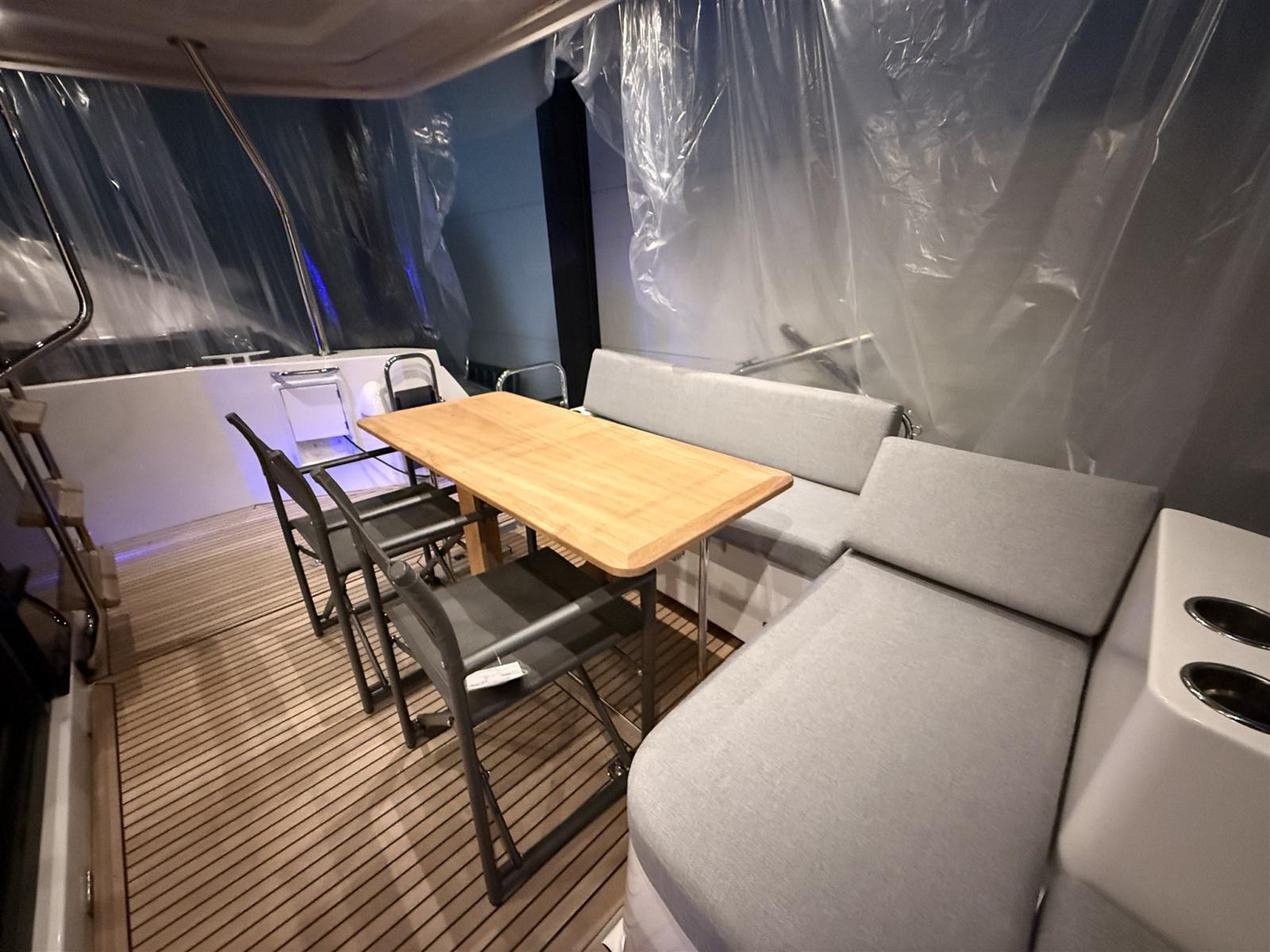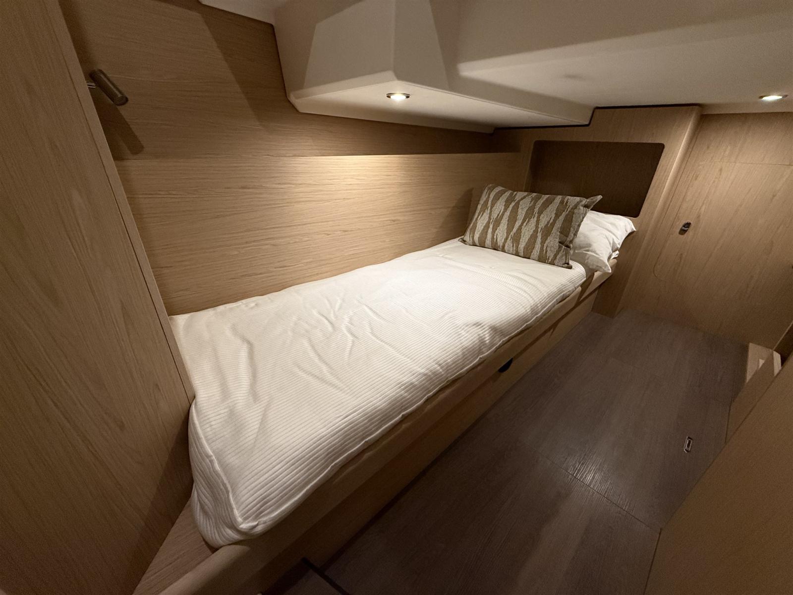 La disposition intelligente offre 3 cabines confortables avec 2 salles de bain intégrales et un salon qui se transforme en 2 couchettes supplémentaires en un rien de temps. Le flybridge est le plus grand de sa catégorie et offre un siège spacieux ainsi qu’une seconde position de direction complète avec une vue panoramique. La passerelle large, basse et asymétrique, la porte latérale généreuse à la position de direction et la porte supplémentaire donnant sur le quai rendent l’amarrage facile et sûr. Le navire est très richement équipé et dispose des options suivantes, notamment : chauffage Webasto, propulseur à la proue et à la poupe, traceur Raymarine, caméra de recul, radar, onduleur.