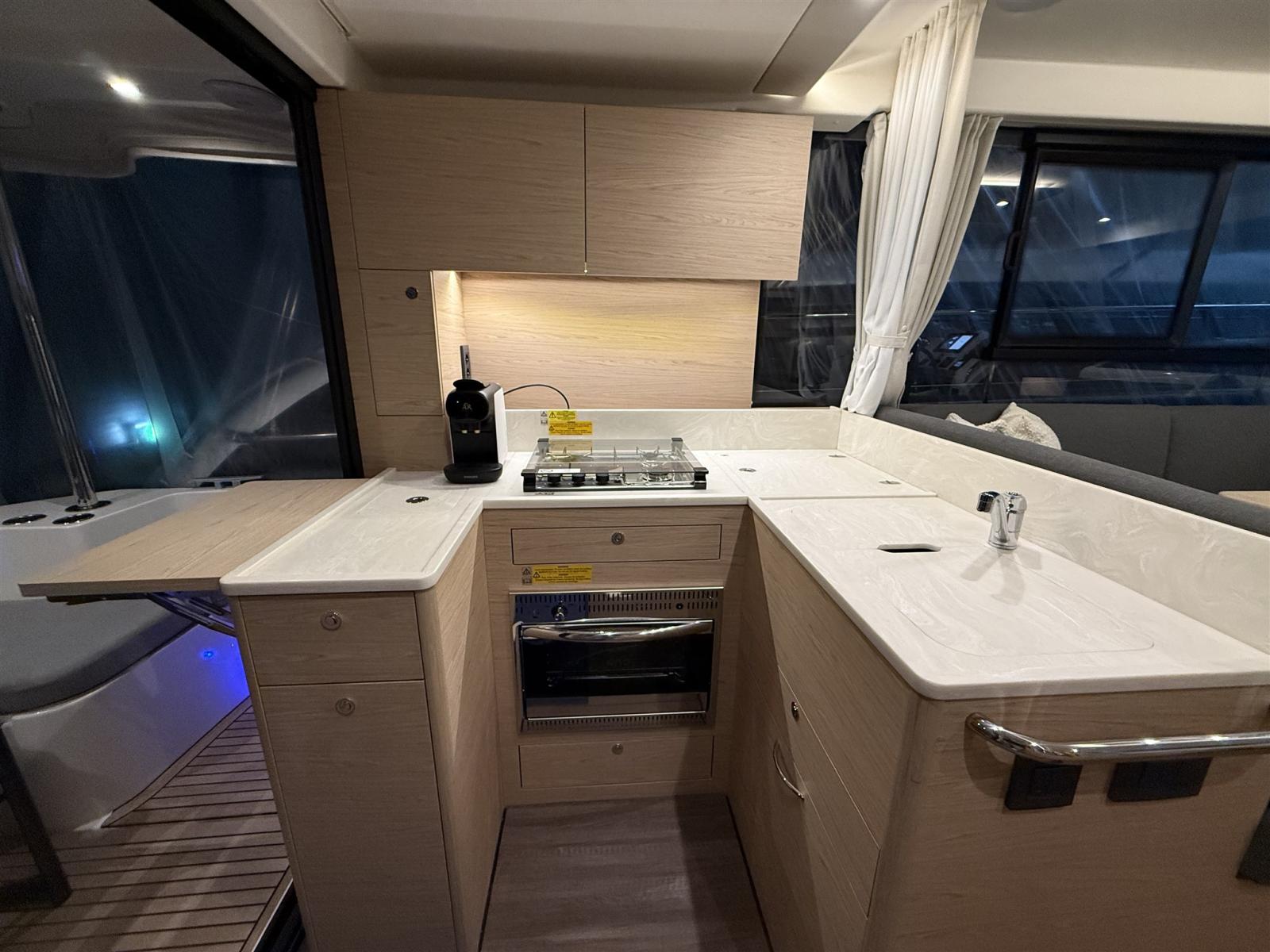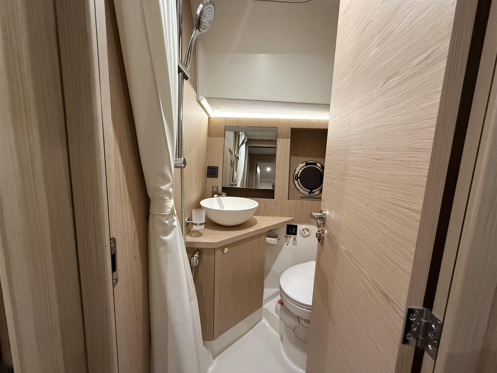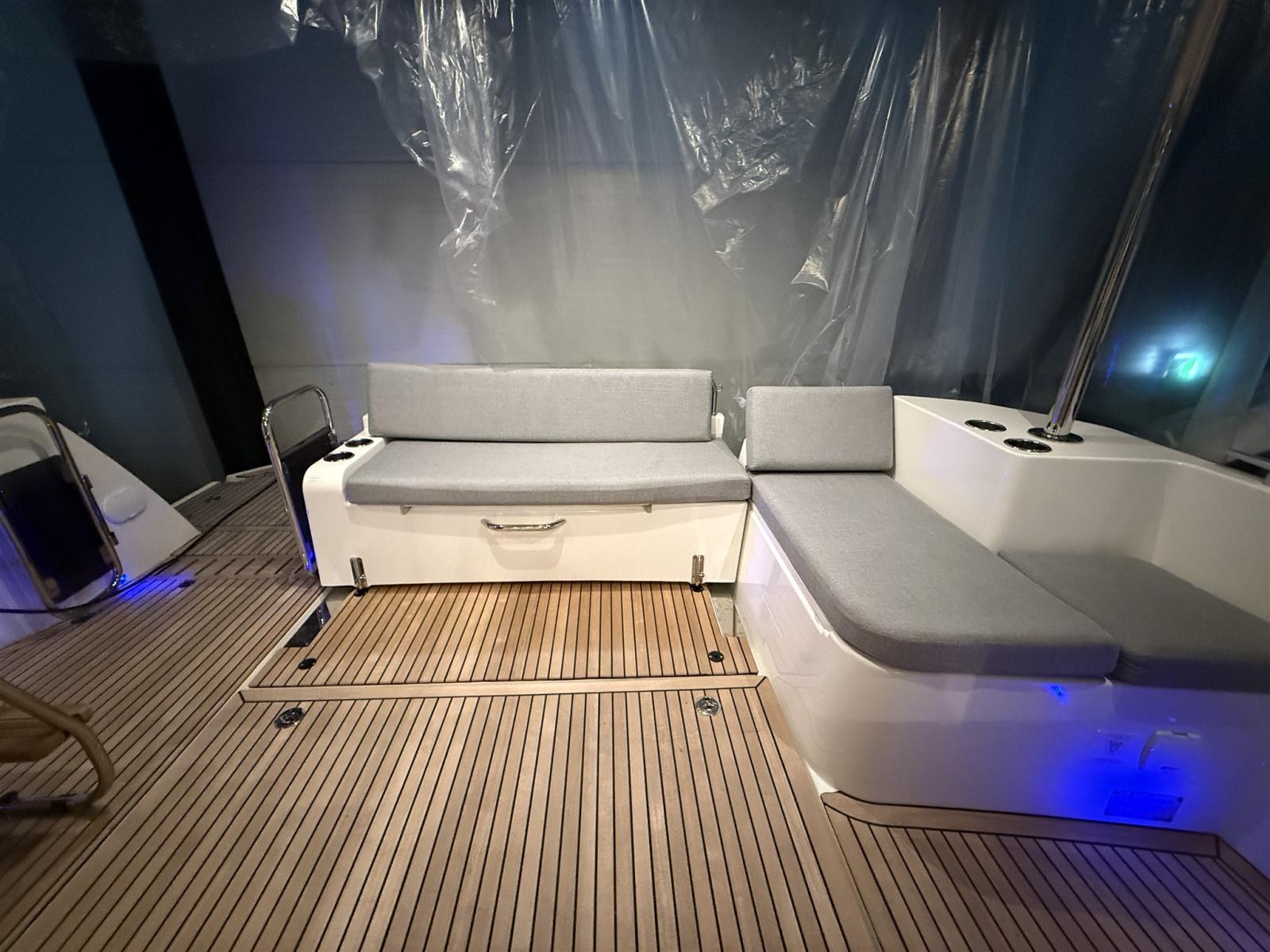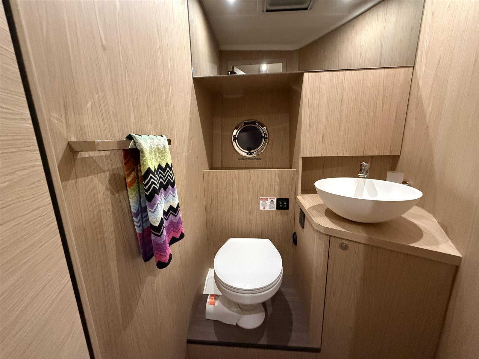 La disposition intelligente offre 3 cabines confortables avec 2 salles de bain intégrales et un salon qui se transforme en 2 couchettes supplémentaires en un rien de temps. Le flybridge est le plus grand de sa catégorie et offre un siège spacieux ainsi qu’une seconde position de direction complète avec une vue panoramique. La passerelle large, basse et asymétrique, la porte latérale généreuse à la position de direction et la porte supplémentaire donnant sur le quai rendent l’amarrage facile et sûr. Le navire est très richement équipé et dispose des options suivantes, notamment : chauffage Webasto, propulseur à la proue et à la poupe, traceur Raymarine, caméra de recul, radar, onduleur.
