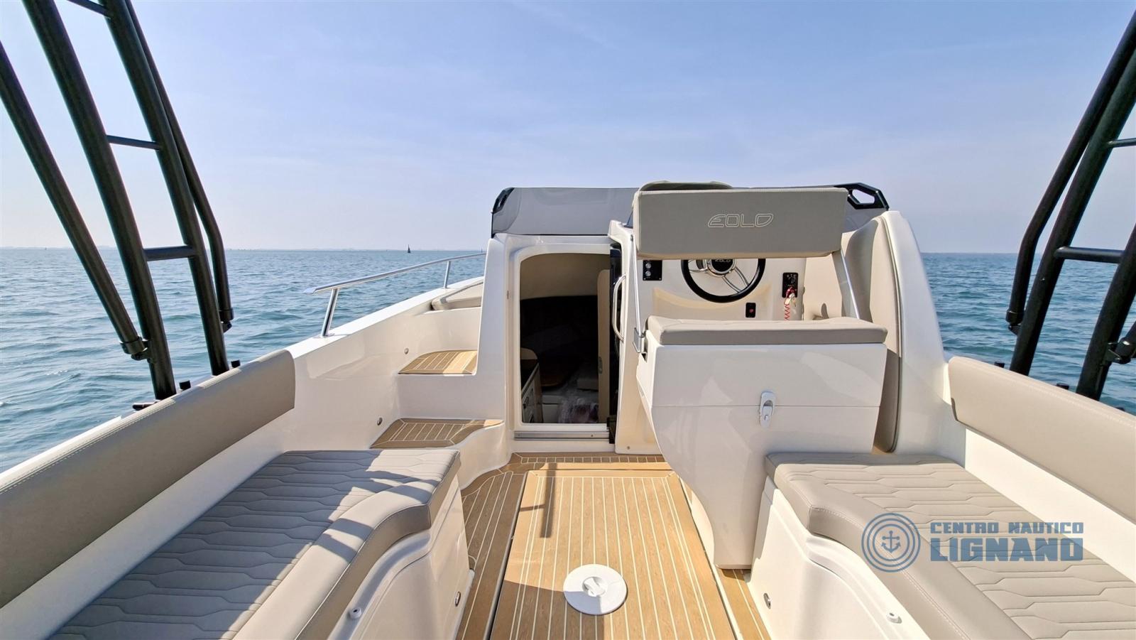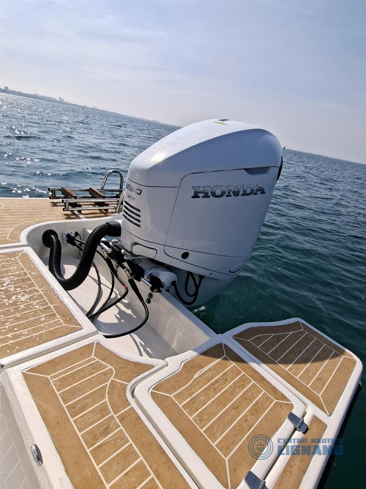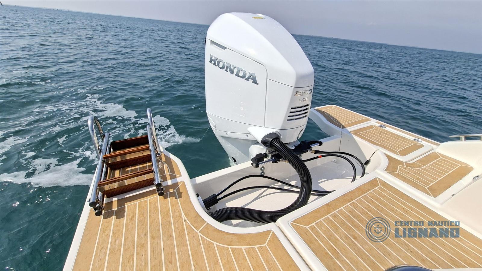 Toute nouvelle Eolo Marine 7.9EL 2026, prête à être livrée et visible à notre siège central Centre Nautico Lignano, équipée d’un moteur Honda Marine BF250AK1 2026 Total White. Une combinaison gagnante avec un fort impact esthétique.