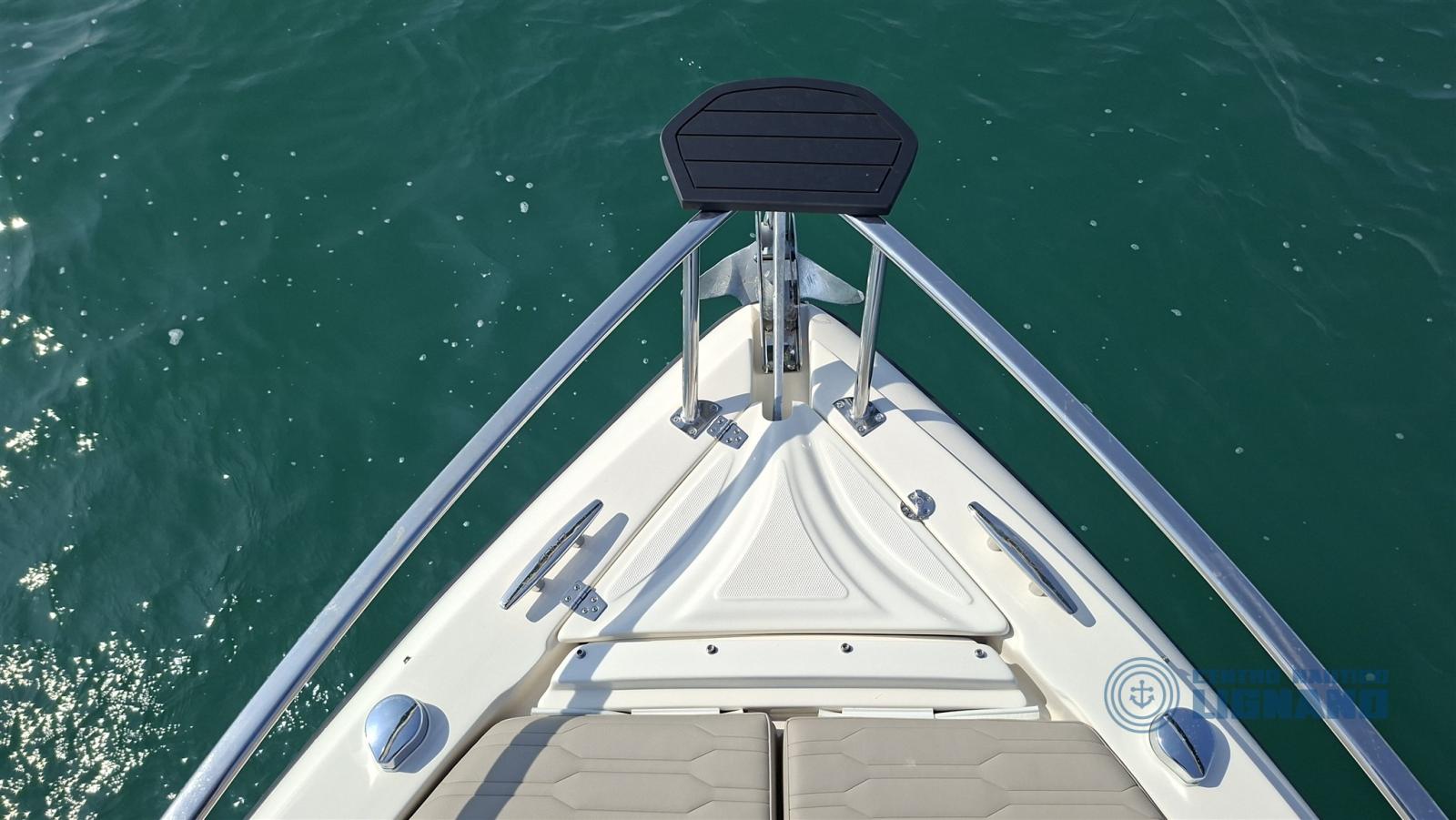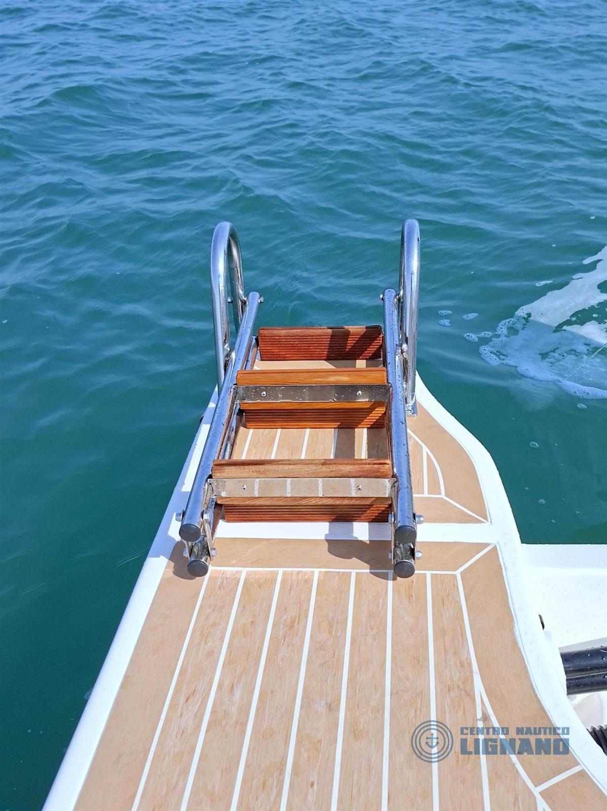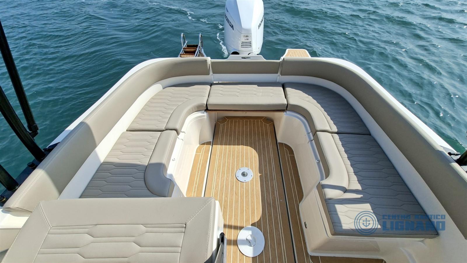 Toute nouvelle Eolo Marine 7.9EL 2026, prête à être livrée et visible à notre siège central Centre Nautico Lignano, équipée d’un moteur Honda Marine BF250AK1 2026 Total White. Une combinaison gagnante avec un fort impact esthétique.