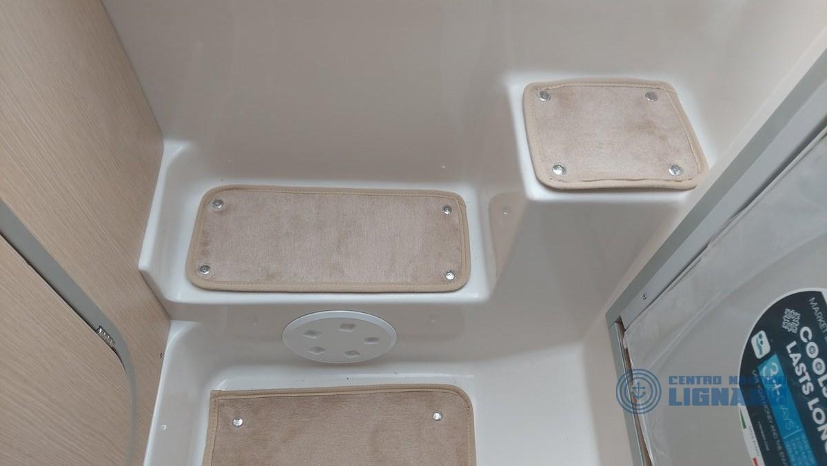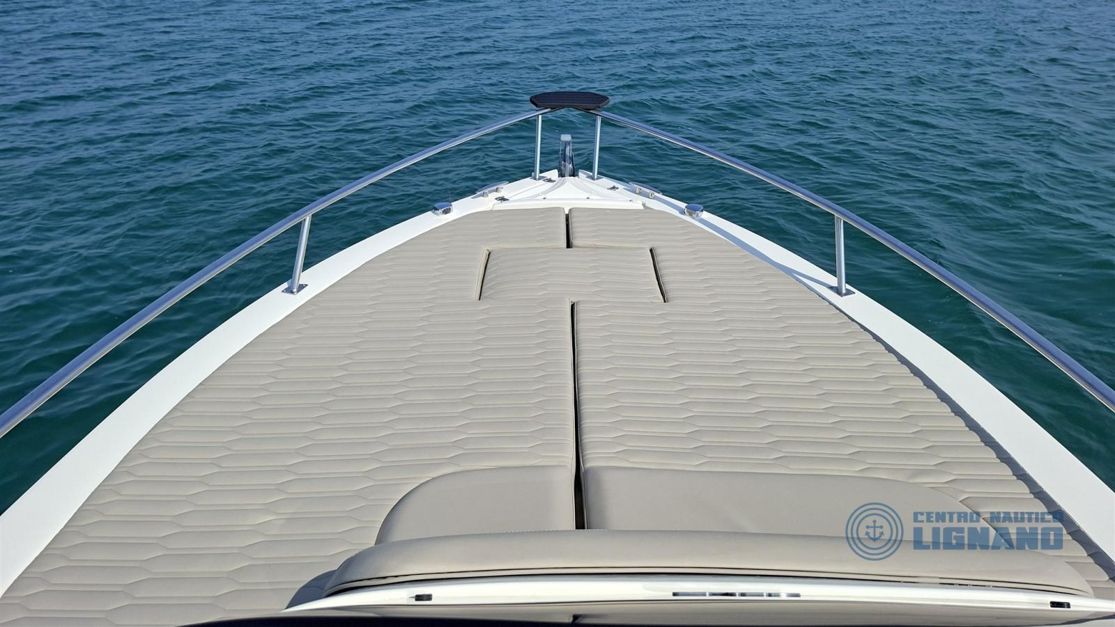 Les accessoires inclus sont : coque blanche, coussins beiges avec texture Lamborghini, barre de sécurité en acier inoxydable satin noir avec auvent, console peinte en noir, cockpit et marches en teck synthétique, treuil électrique avec ancre et chaîne, système d’eau noire et toilettes marines électriques, trappe, hublot, fenêtres en plexiglas, réfrigérateur, pont de soleil d’étrave, rampe d’étrave, rouleau d’étrave, bornes, crochets de traction, table avec pied, rallonge de bain de soleil arrière, échelle de bain en acier inoxydable, système de carburant 270 lits, système d’eau et de douche 67 litres, système électrique complet avec compas à corne, feux de navigation, feux de courtoisie, lumière à 360°, prise électrique 12 V, pompe de cale, dériveur de batterie, plateformes arrière avec revêtement en teck synthétique.