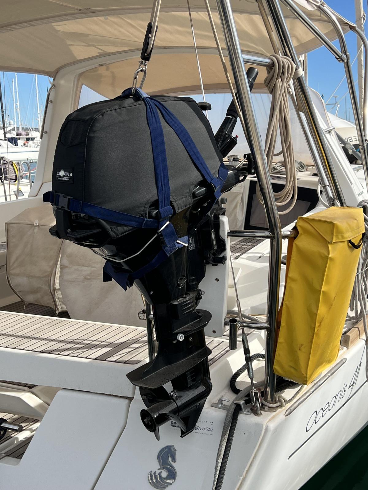 Un inmense cockpit avec deux barres à roue, un bimini neuf et une capote de descente entièrement fermée, des coussins de cockpit et d'étrave neufs, une douche de pont, une échelle de bain, une table de cockpit, une double barre à roue, un bimini, une bouée de sauvetage, une étrave rigide et une annexe Federlight Aluminum 315 Black (2023) avec un moteur hors-bord Suzuki 15 CV (2023) en excellent état.