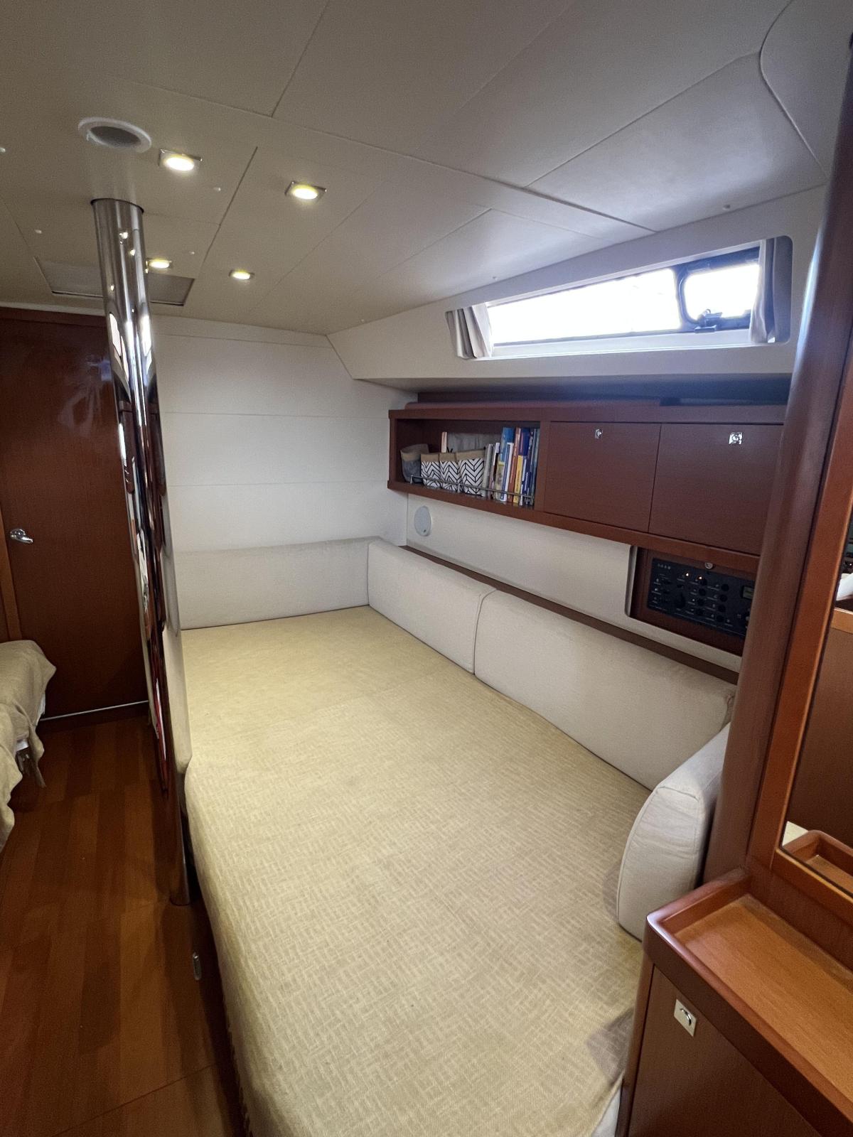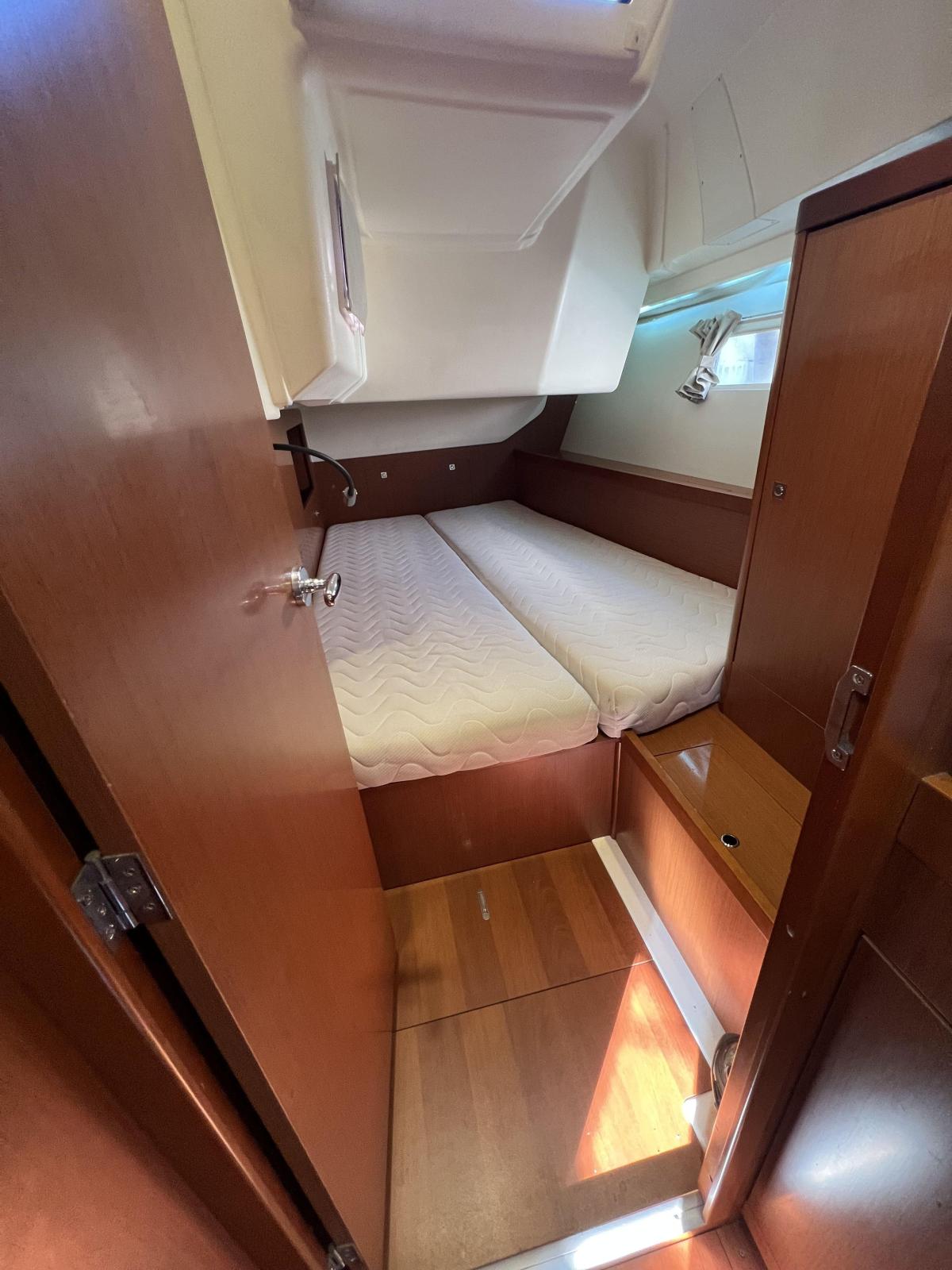 Cabine propriétaire à l'avant avec salle de bain privative, deux cabines à l'arrière, eau chaude.
