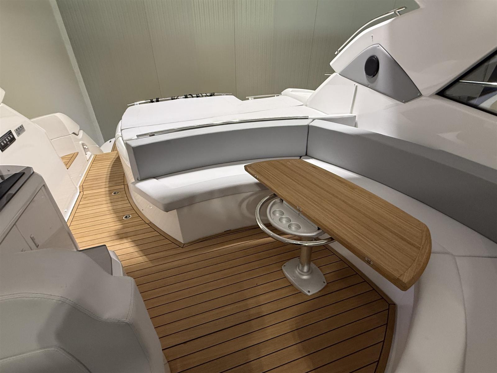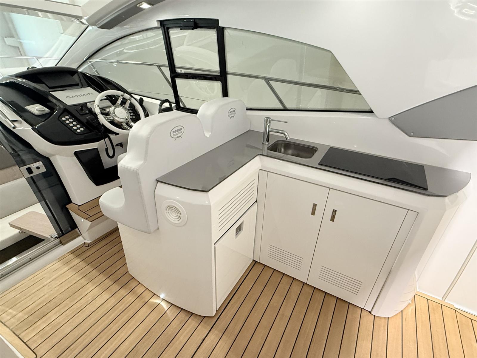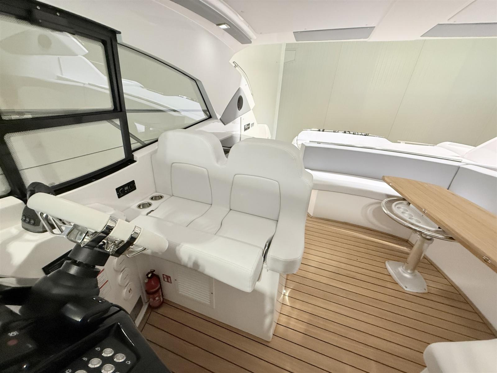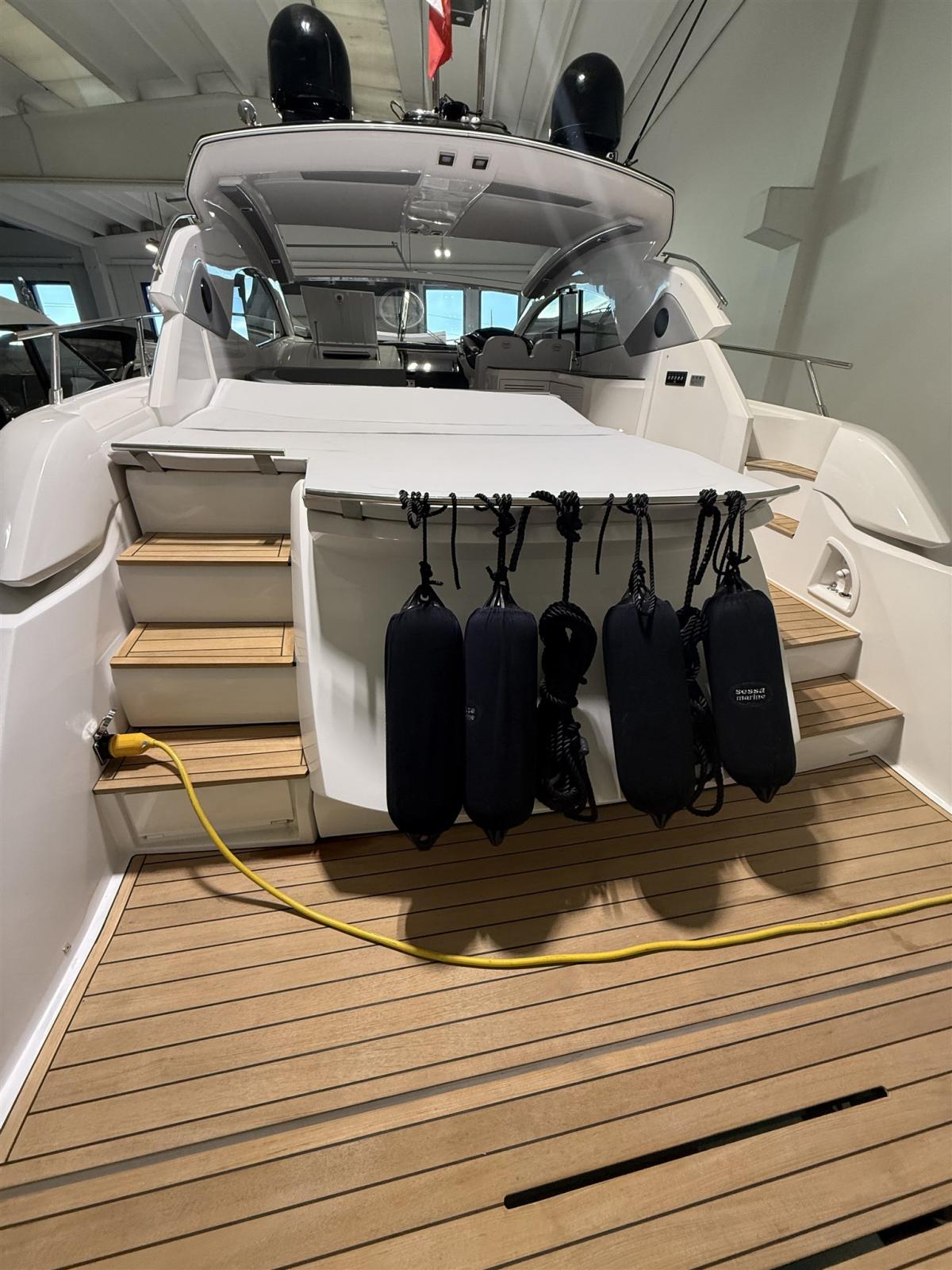 Alarme moteur, Alarme de pompe de cale, Ouverture du compartiment moteur électrique, Eau sous pression, Douche de cockpit, Flaps électriques, Garage à annexe, Hard top, Extincteur(s) fixe(s), Indicateurs de flaps, Lavabo dans le cockpit, Éclairage de courtoisie, Passerelle, Plateforme arrière, Pompe de cale automatique, Cockpit en teck, Prise de quai, Guindeau électrique, Echelle de bain, table de cockpit, Annexe, Corne.