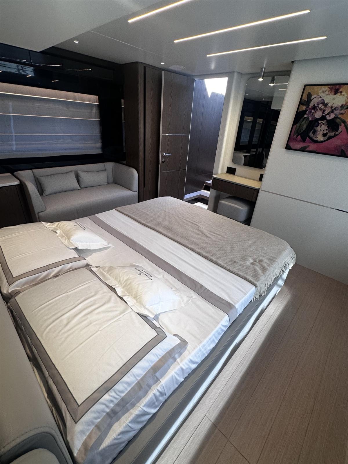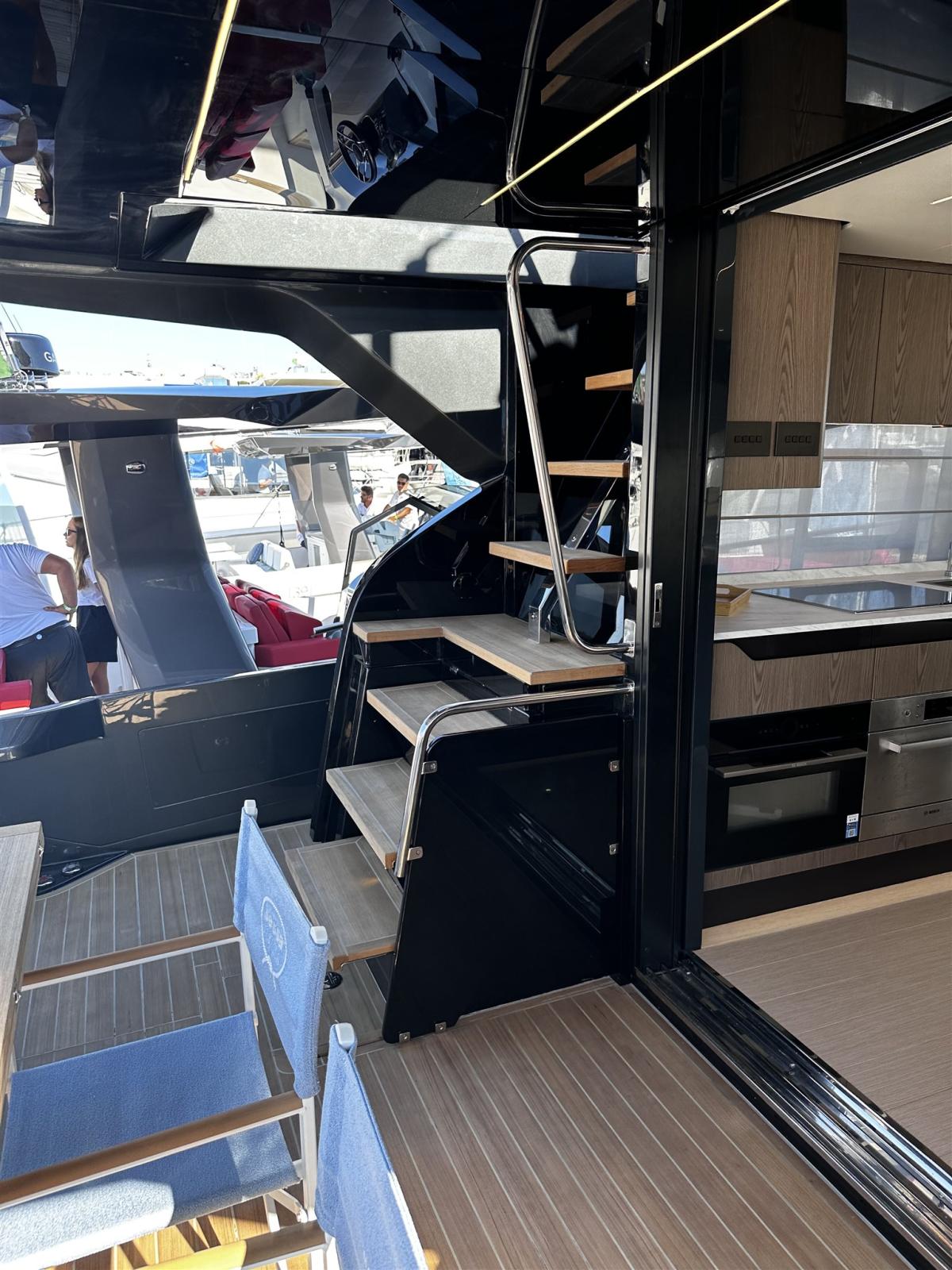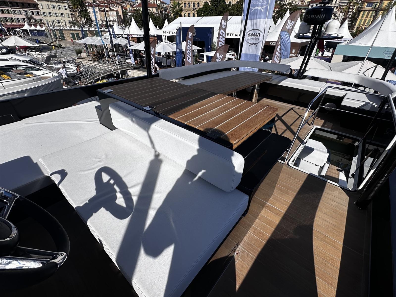 Alarme moteur, Ouverture du compartiment moteur électrique, Auto Dynamic Trim Interceptor, Eau sous pression, Passavant en teck, Couleur spéciale, Douche de cockpit, Flaps électriques, Garage à annexe, Extincteur(s) fixe(s), Indicateurs de flaps, Éclairage de courtoisie, Spots sous-marins, Passerelle, Plateforme arrière, Cockpit en teck, Prise de quai, Guindeau électrique, Echelle de bain, table de cockpit, Corne.