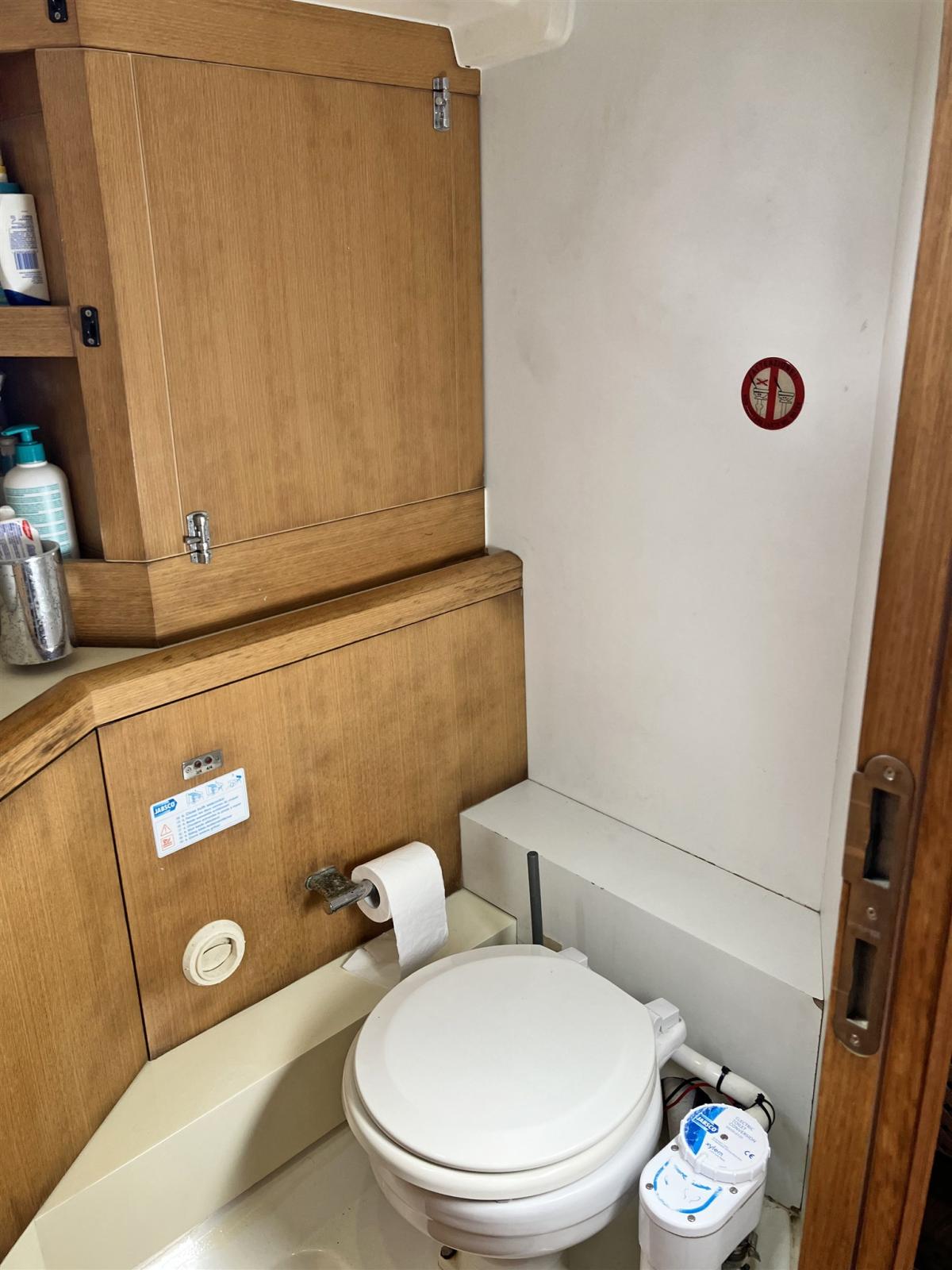 Cabine propriétaire à l’avant avec lit double et salle de bain privée avec lavabo, toilettes électriques et douche