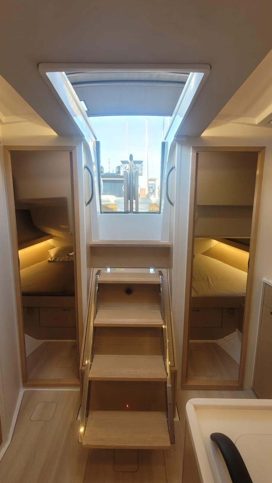 2 cabines à lits jumeaux à l’arrière avec leur propre salle de bain attenante et cabine de douche séparée.