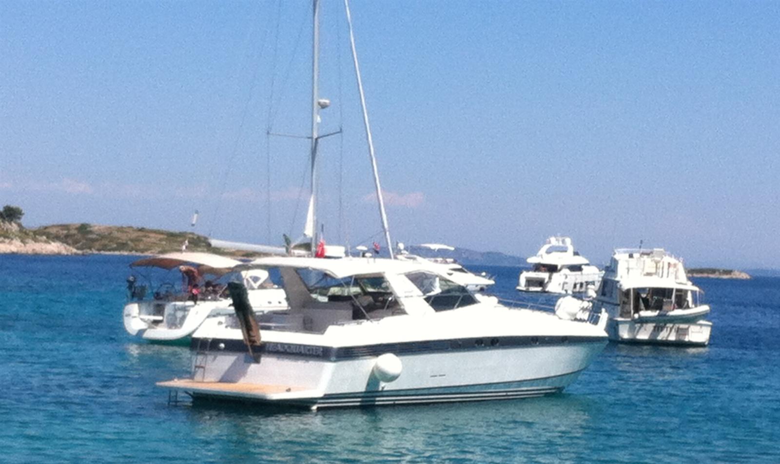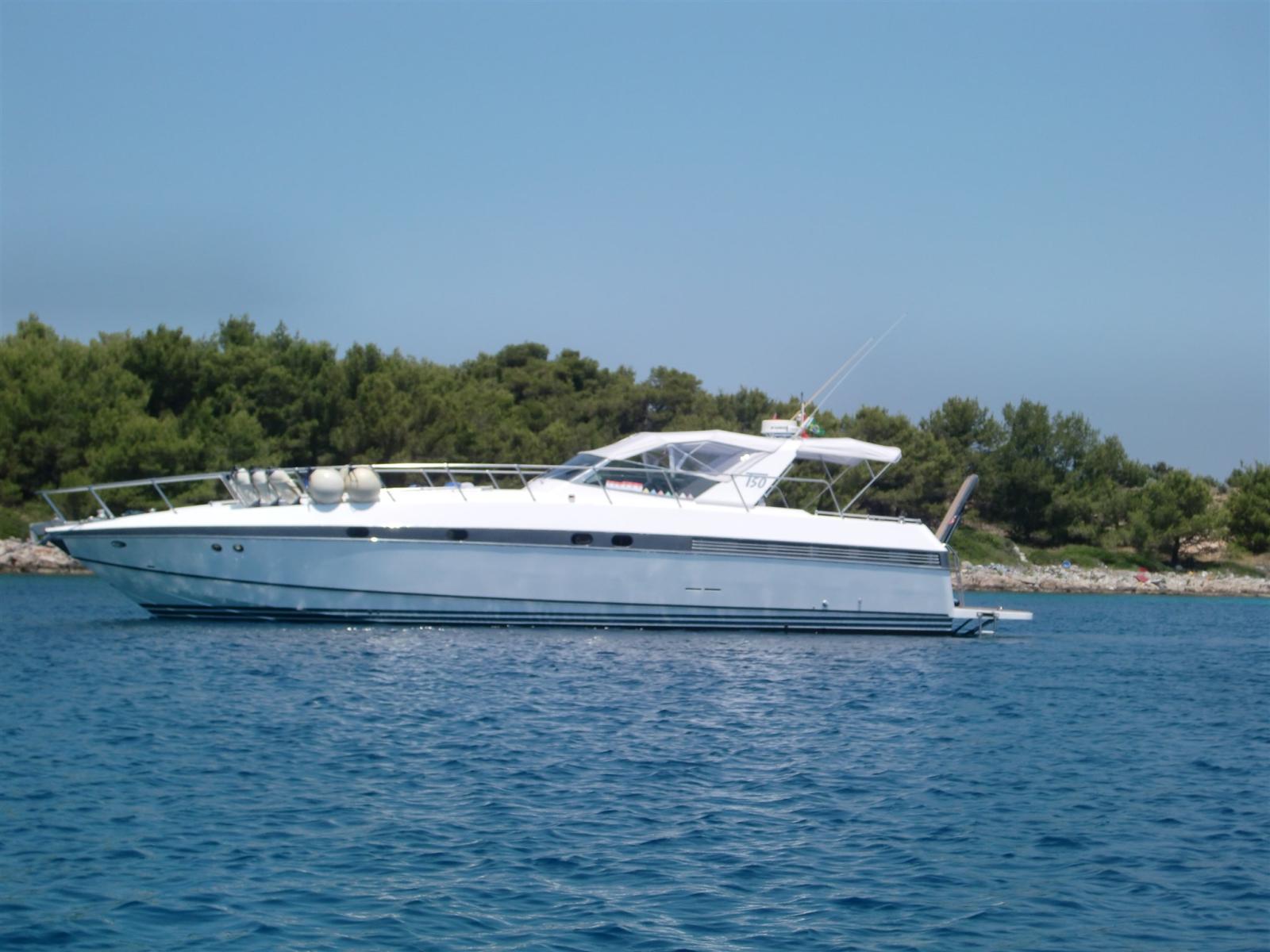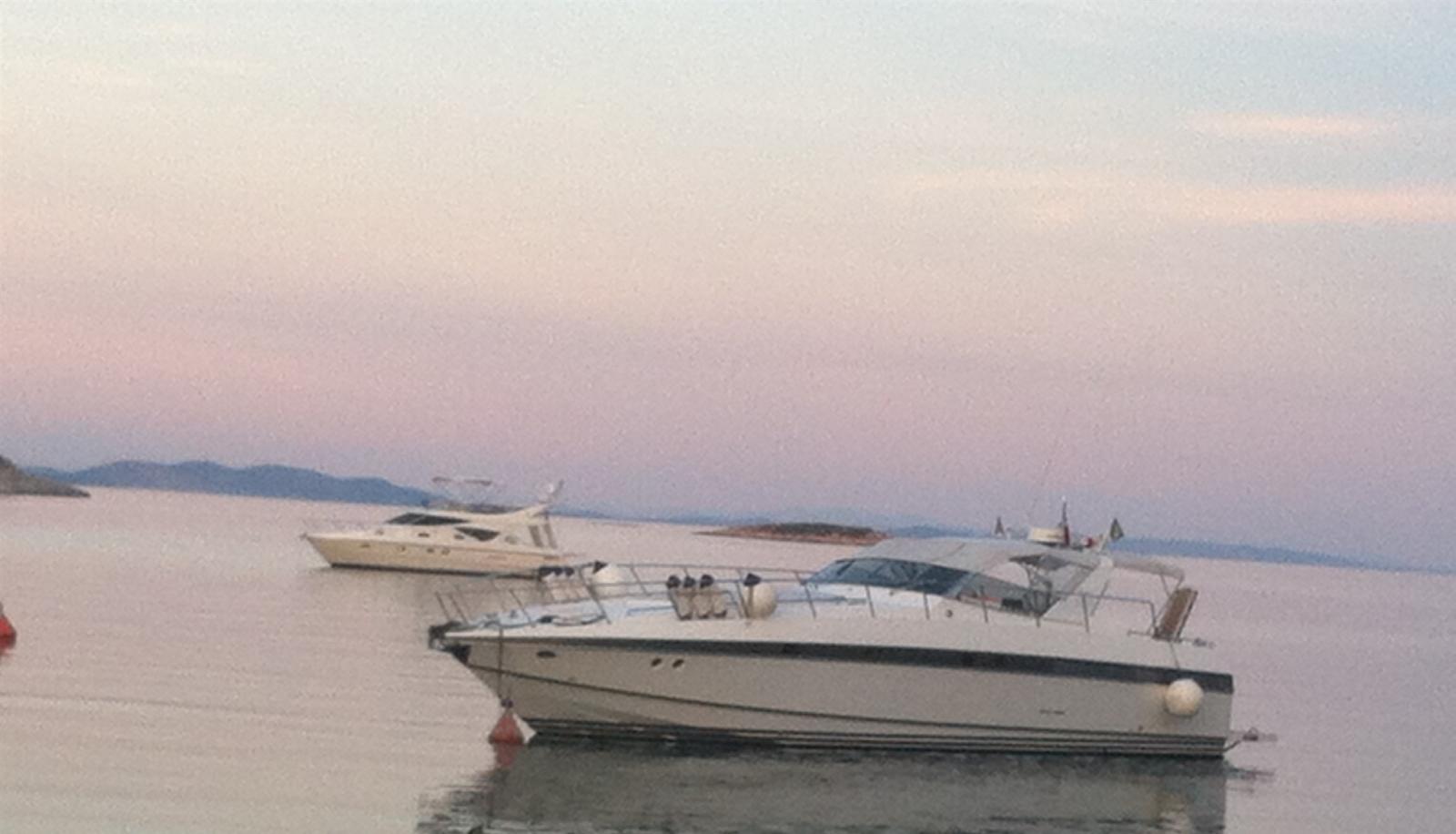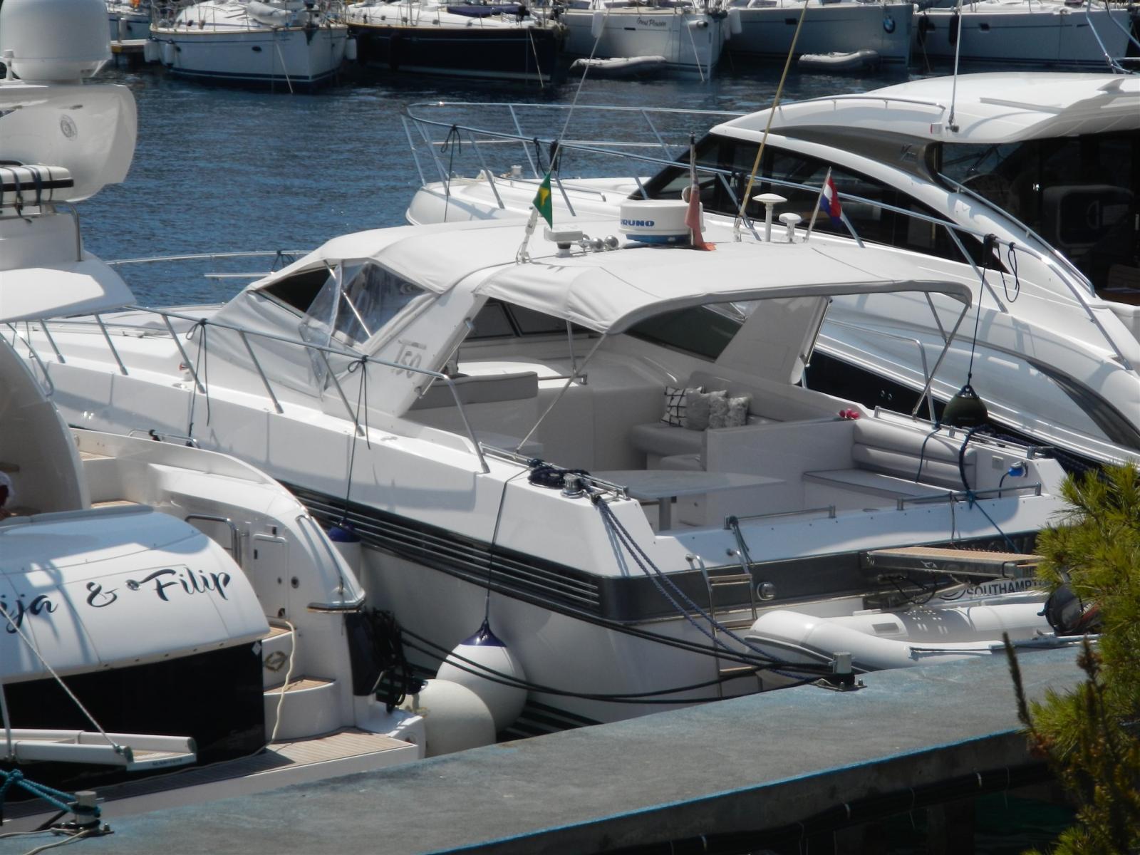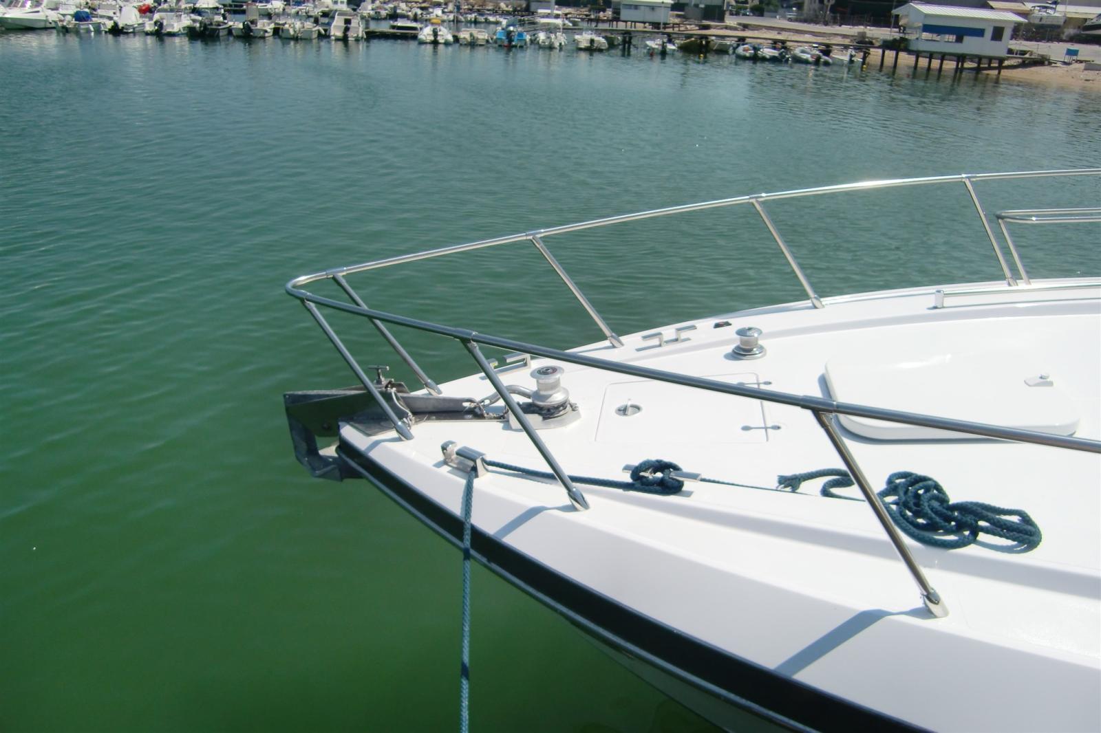 Alarme moteur, Eau sous pression, 4 Batteries (agm), Douche de cockpit, Flaps hydrauliques, Indicateurs de flaps, Passerelle (idraulica), Plateforme arrière (maggiorata), Pompe de cale automatique, Porte latérale, Prise de quai, Connexion eau sous pression à quai, Onduleur, Rollbar, Guindeau électrique, Echelle de bain, table de cockpit, Table pliante de salon, Annexe, Corne (+ fuoribordo Yamaha 9CV), Winch électrique arrière, Winch électrique avant.