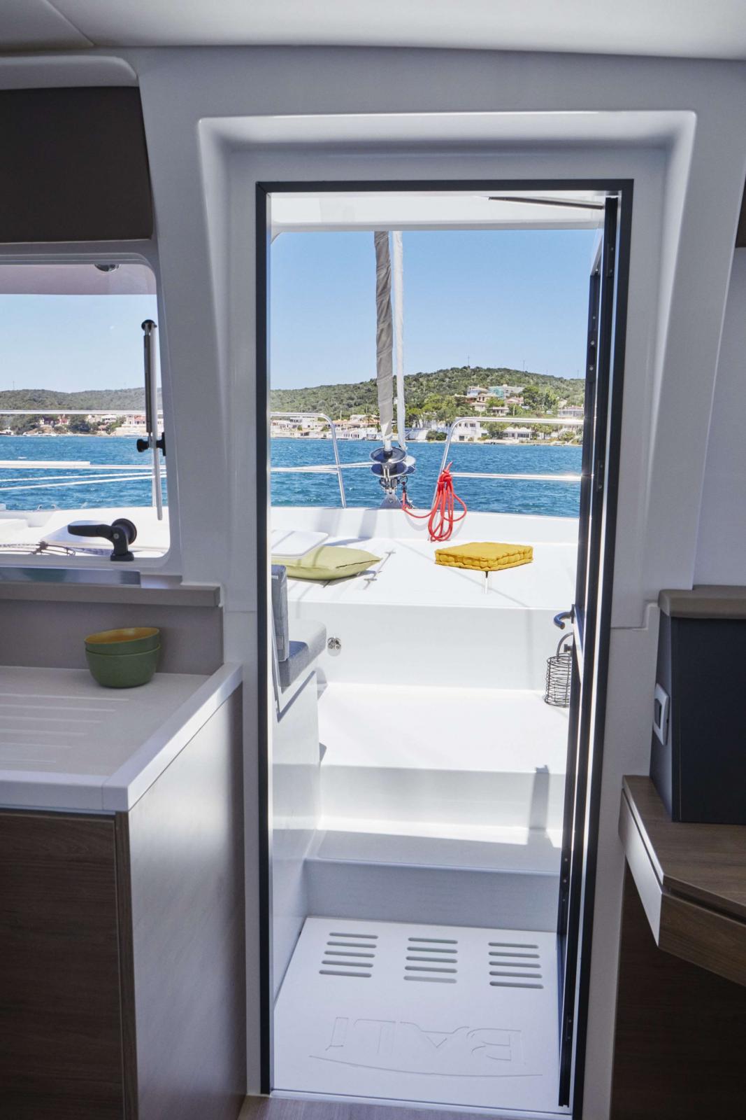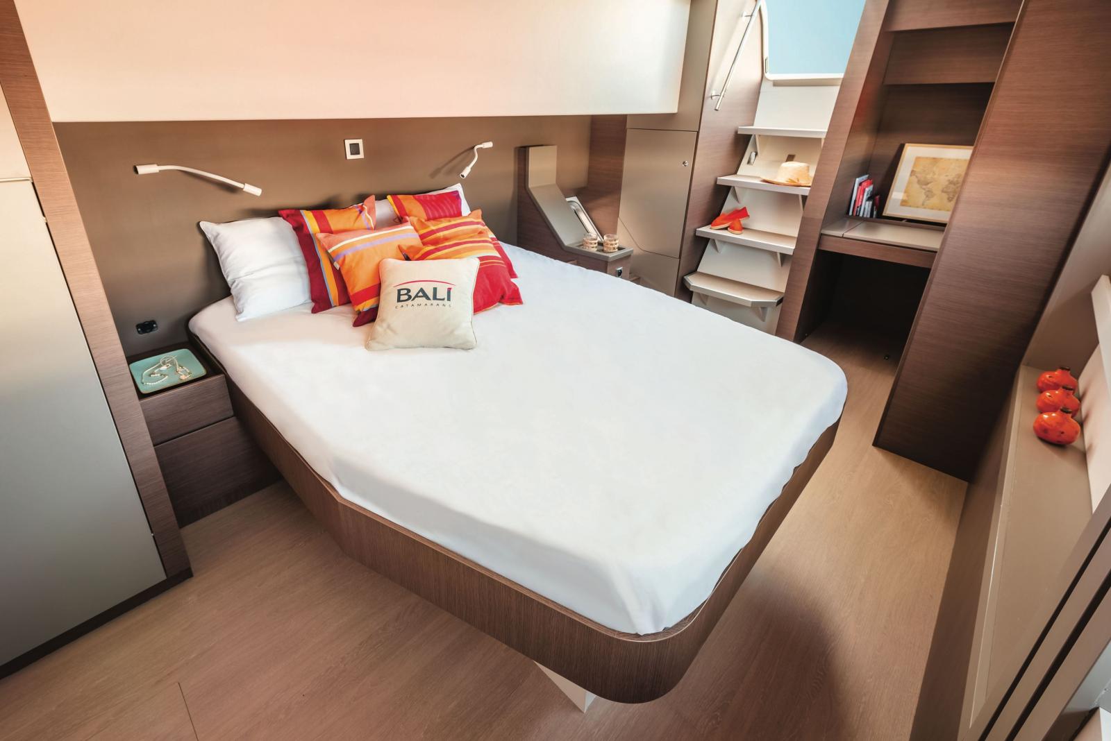 Le BALI 4.8 c’est l’art de vivre à la française. Ce 48 pieds possède tous les atouts de la gamme BALI CATAMARANS : ses étraves fines et droites créant une ligne élégante, ses nombreux rangements, son design contemporain et la « porte BALI ». En navigation comme au mouillage, la circulation du carré au cockpit avant se fait en clin d’œil par la porte étanche. Lors des avitaillements et des sorties, un système de bossoir simple et pratique permet de profiter de l’annexe en toute facilité.
