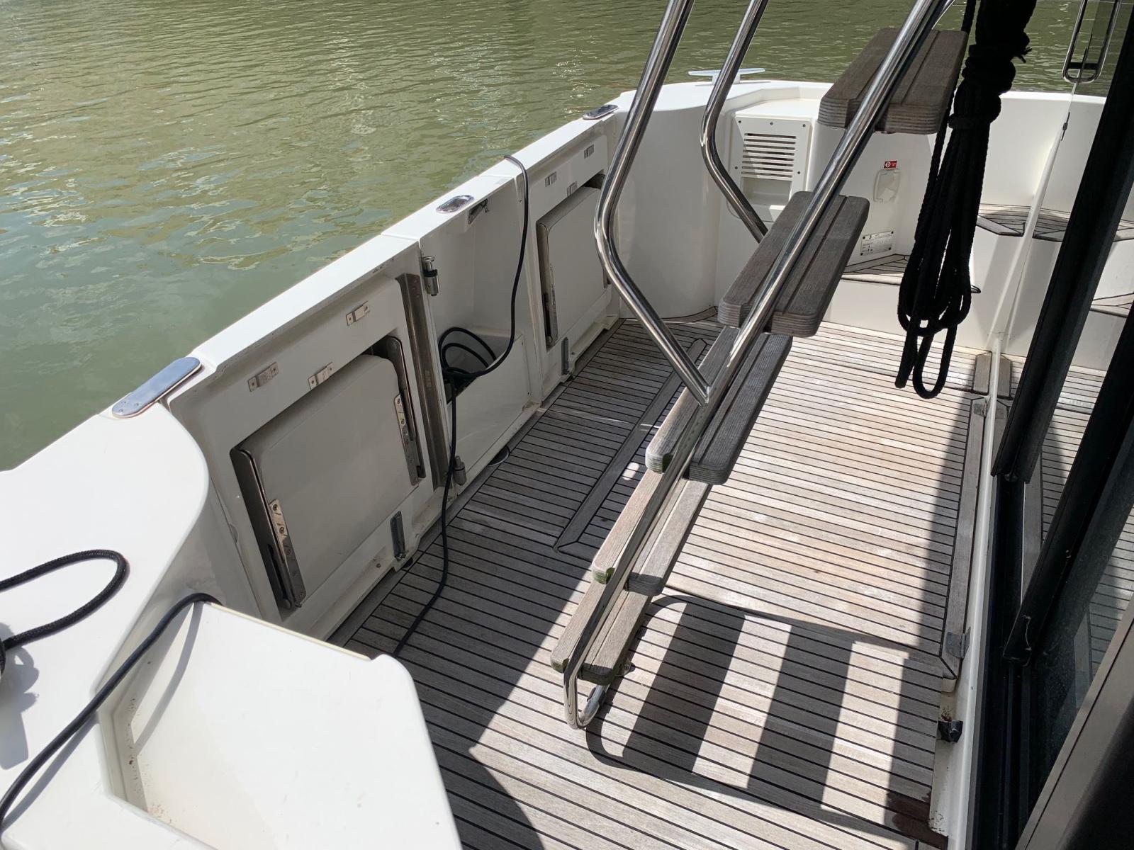 Equipement: Coque Grise - Guindeau électrique - Propulseurs d'étrave et de poupe, 2 Batteries service 115A, Flaps électriques, Convertisseur 12-220V 700VA, Prise eau douce de quai, VHF Raymarine double poste avec AIS Raymarine, Traceurs Raymarine 9 pouces en timonerie et au flybridge, Pilote auto Raymarine, grande plateforme de bain lattée teck et fond de cockpit et passavant tribord latté teck, 2 banquettes de cockpit repliables, Chauffage fuel air pulsé, rideaux intérieurs de timonerie, carré convertible en couchage et 2 poufs coulissants, Bain de soleil avant + housse, Projecteur de pont au flybridge, armement de sécurité côtier 6 personnes, Kit mouillage complet avec amarres et pare-battages.