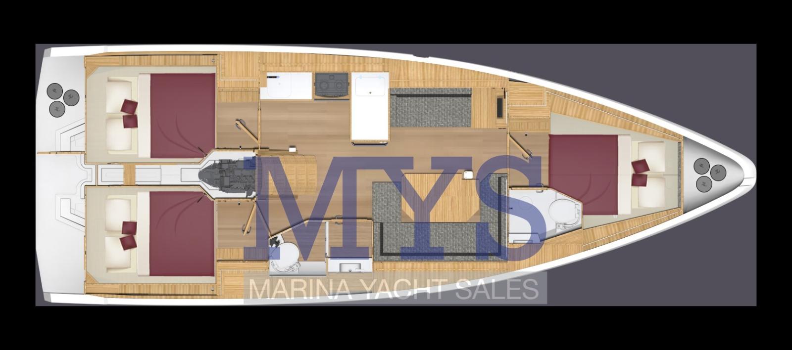 Alarme moteur, Eau sous pression, Douche de cockpit, Double barre à roue, Plateforme arrière, Pompe de cale automatique, Pompe de cale manuelle, Prise de quai, Guindeau électrique, Gréement monotoron, Echelle de bain, table de cockpit, Table pliante de salon.