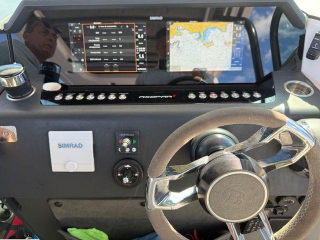 Aménagement épuré : poste de pilotage, panneaux supérieurs du tableau de bord et de la console en finition gris foncé douce au toucher, panneaux de la console centrale en finition noir brillant, panneau de commande en verre avec boutons-poussoirs lumineux, panneau de commande principal avec interrupteurs de batterie télécommandés, volant en cuir avec logo Axopar, trappe d'accès verrouillable à la cabine avant avec poignée en cuir, porte coulissante vers la cabine avant en finition gris foncé douce au toucher, porte-gobelet sur le tableau de bord, prise USB étanche intégrée à la paroi de la console, poche à documents intégrée à la paroi de la console, repose-pieds et support en acier inoxydable avec logo Axopar, plancher abaissé au poste de pilotage, 2 spots LED intégrés au plancher du poste de pilotage
