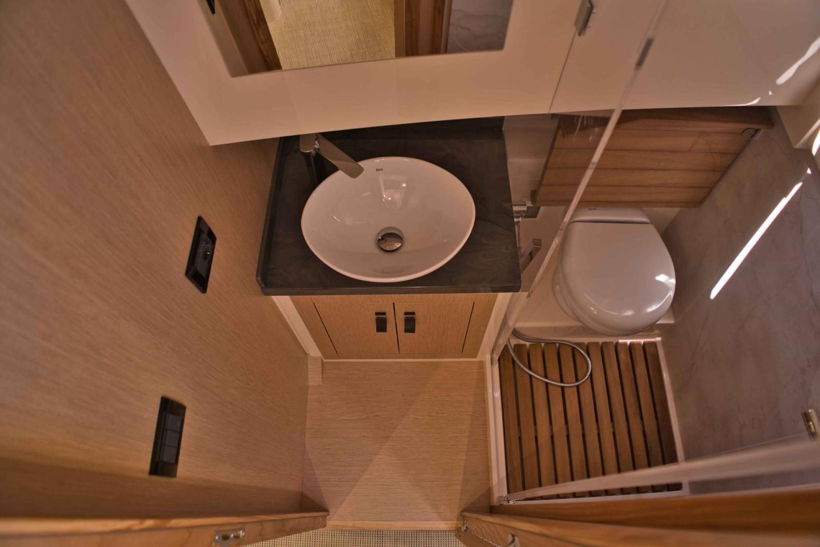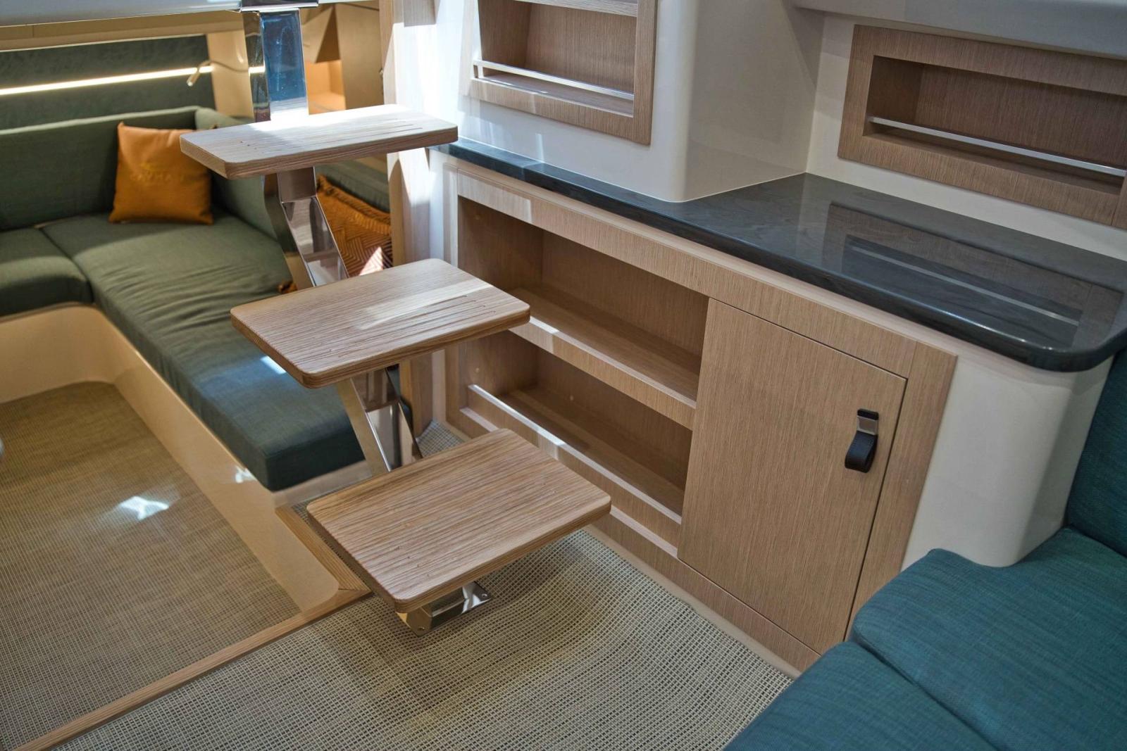 LES INTÉRIEURS, BIEN QUE COMPACTS, SURPRENNENT PAR DES SOLUTIONS INTELLIGENTES ET MODULAIRES AVEC DES CANAPÉS CONVERTIBLES OFFRANT DEUX LITS DOUBLES CONFORTABLES, ALLIANT FONCTIONNALITÉ ET STYLE DANS UN PETIT JOYAU DU DESIGN NAUTIQUE.