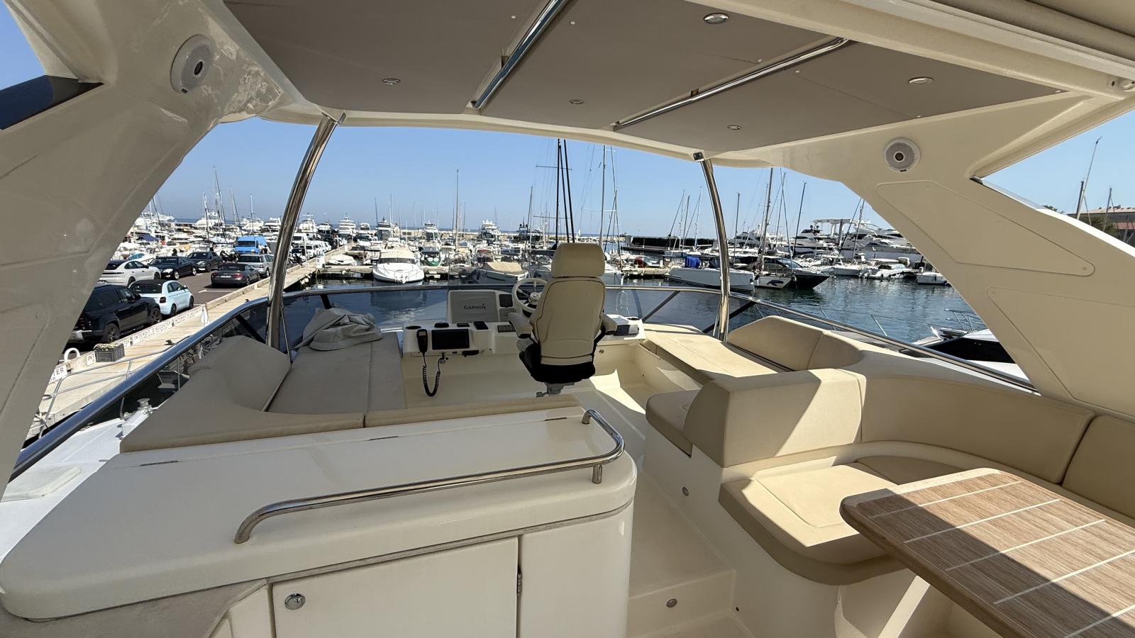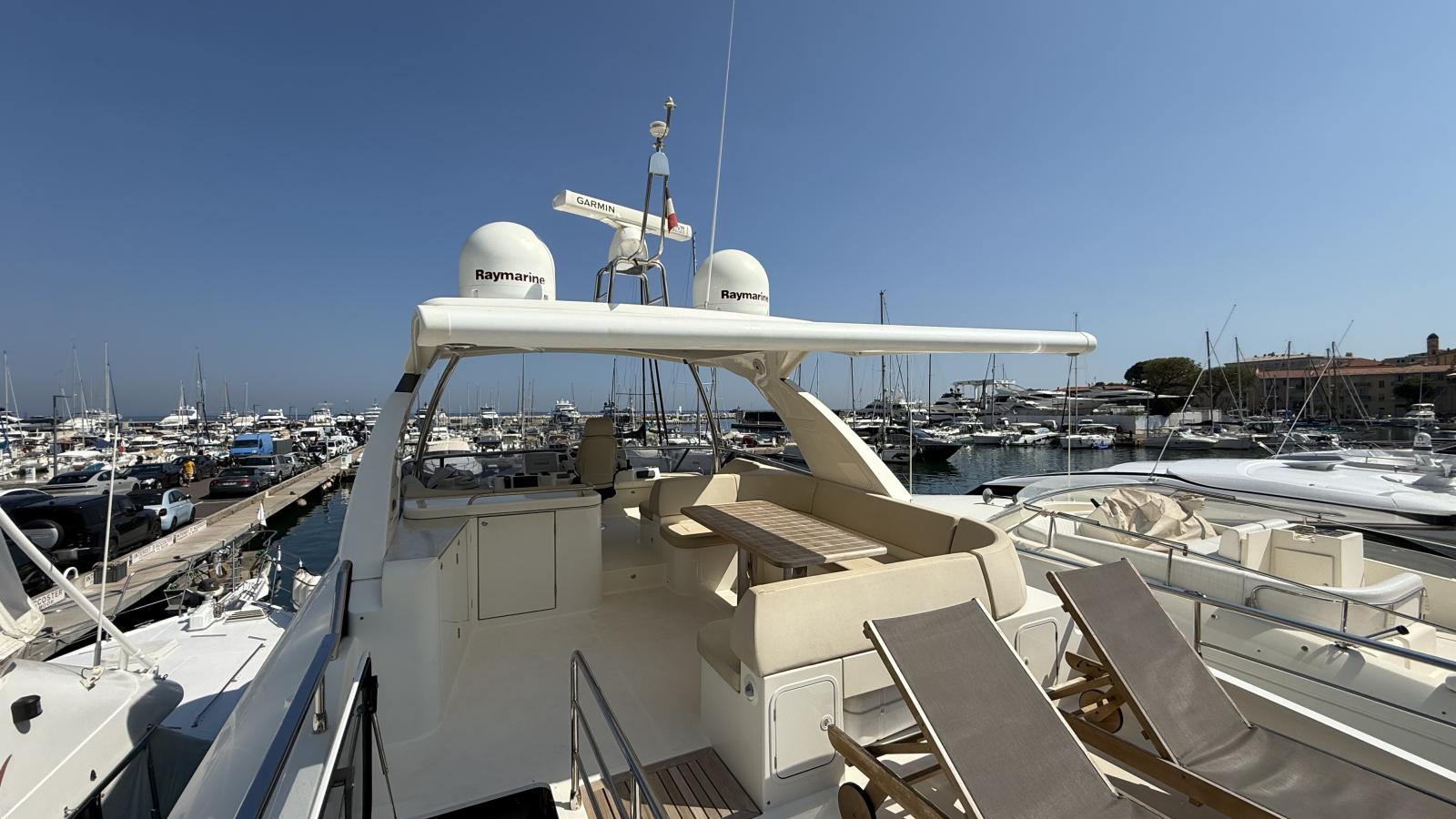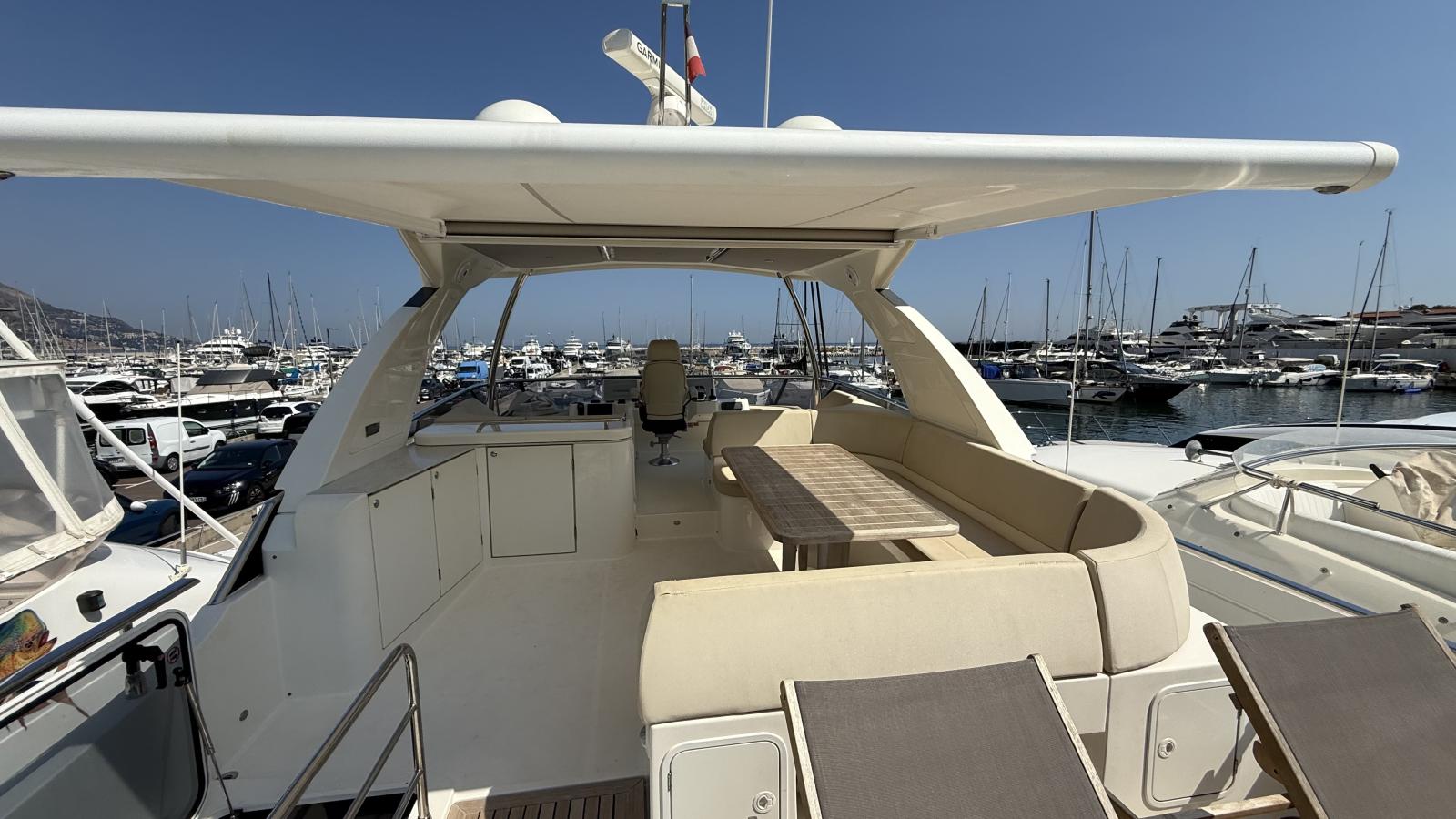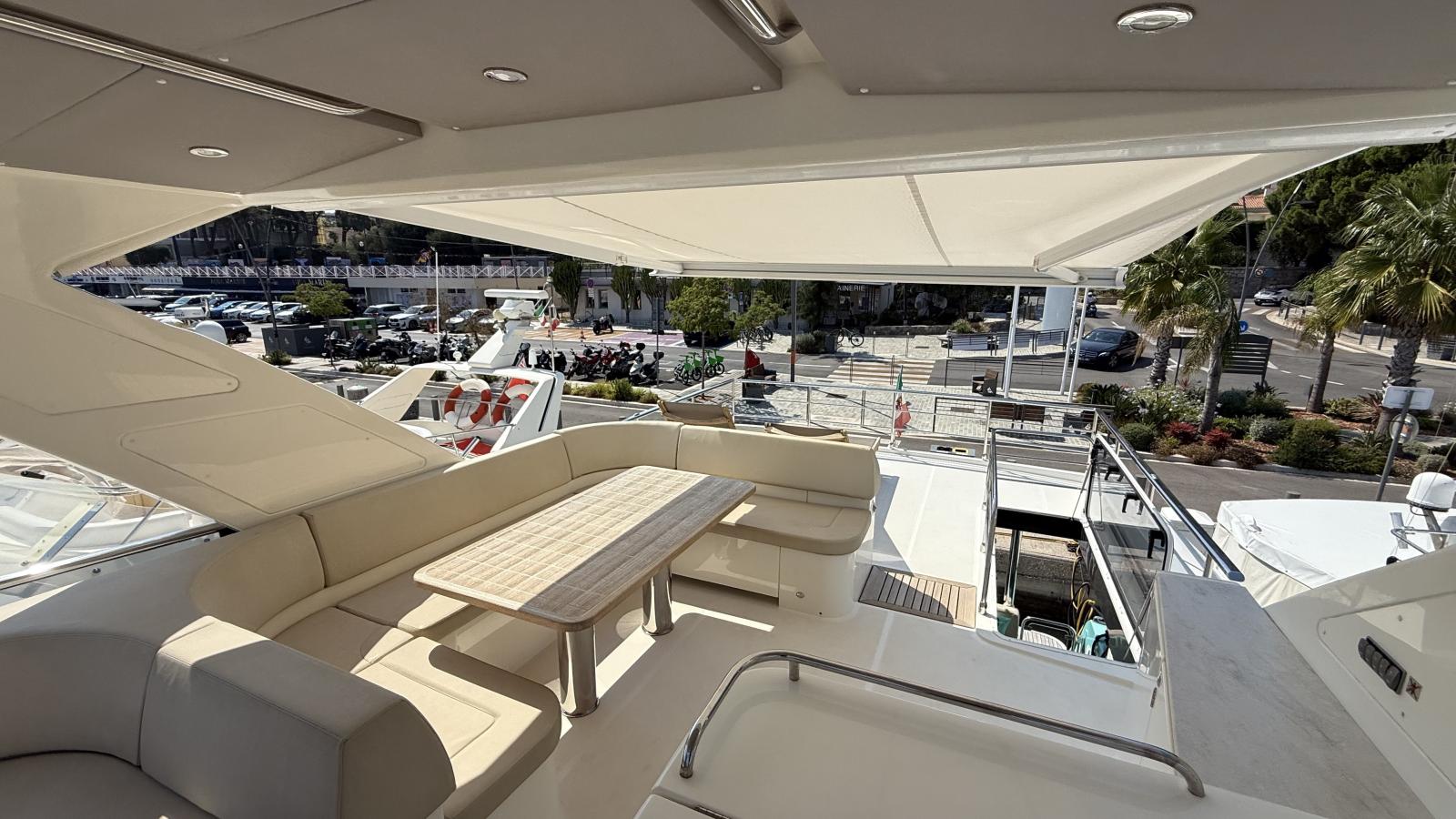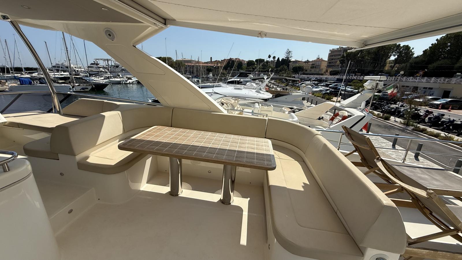 Un flybridge avec un bain de soleil et un coin repas