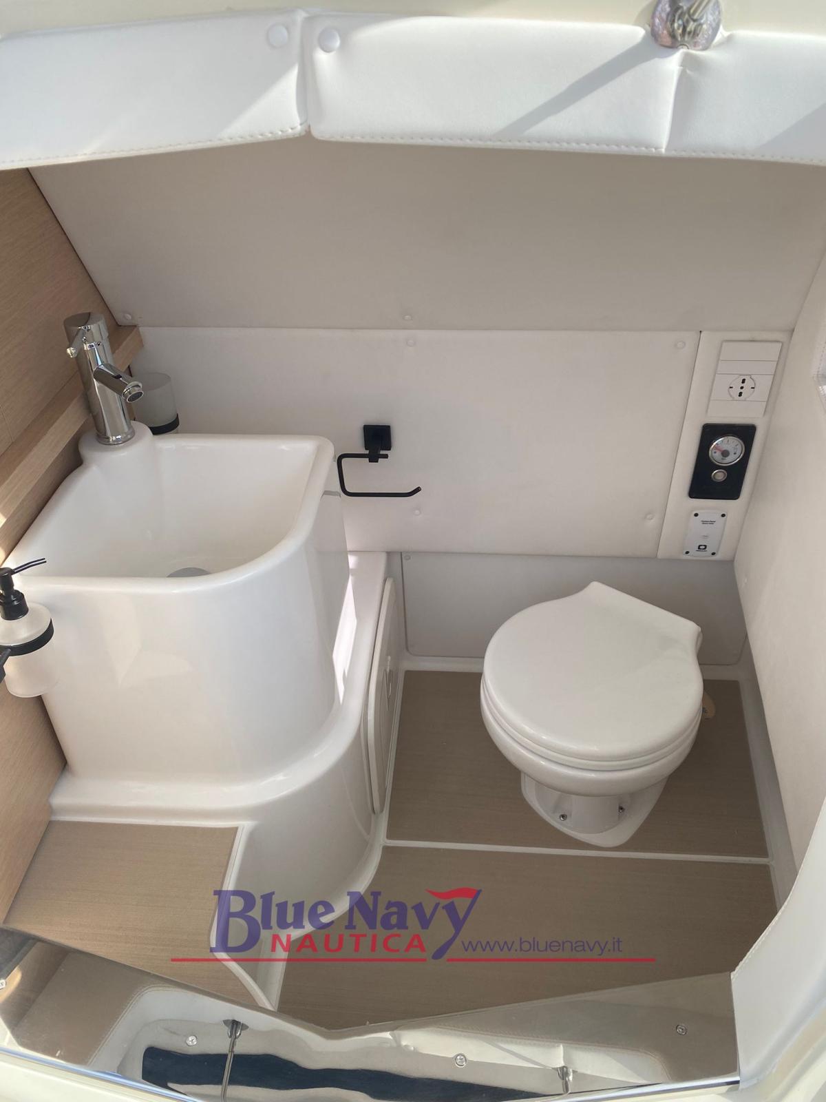 Le dériveur, en plus de l’équipement standard, est équipé des éléments suivants : instrumentation Raymarine Essential (avec GPS 7), kit ligne 220V avec prise à terre et chargeur de batterie, kit de barre anti-sécurité en fibre de verre équipée d’auvent en acier inoxydable, ancre et rouleau améliorés en acier inoxydable, plateformes surdimensionnées avec échelle rétractable, table de cockpit en teck amovible avec coussin supplémentaire, chargeur sans fil pour smartphone dans la console, Kit de toilettes avec toilettes, hublot et système d’eau noire.