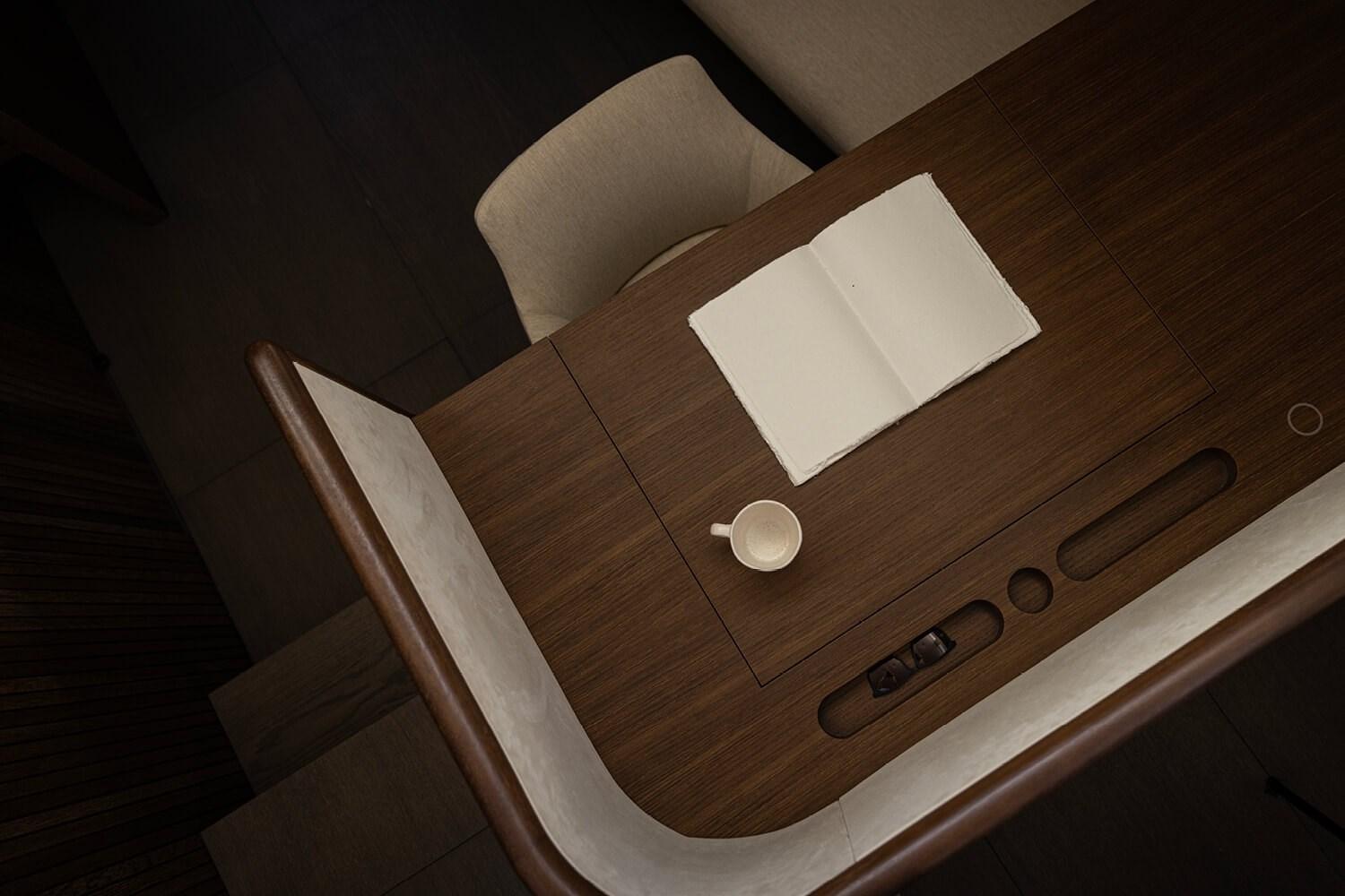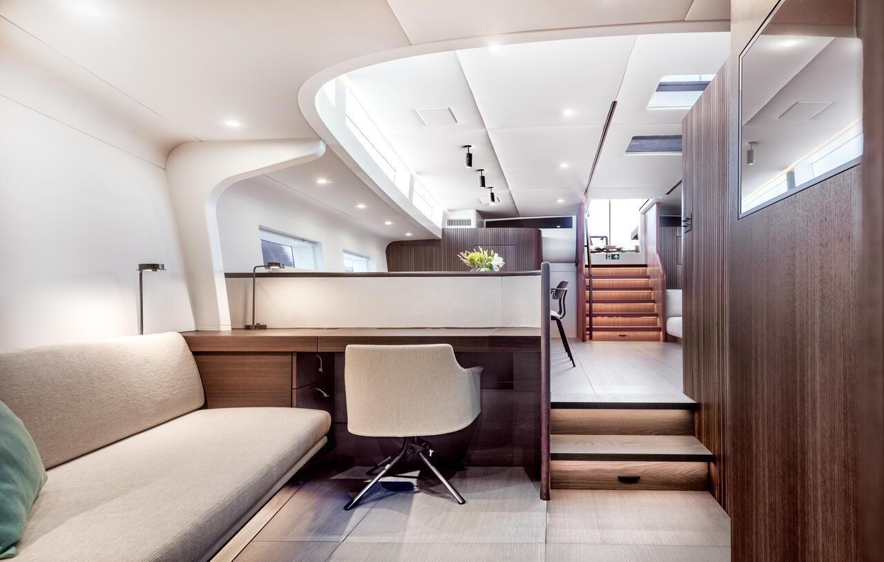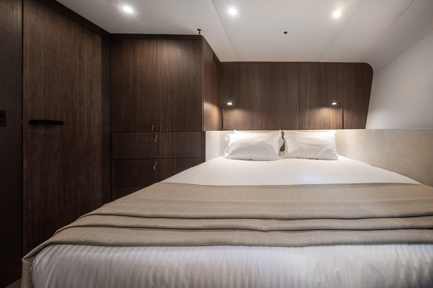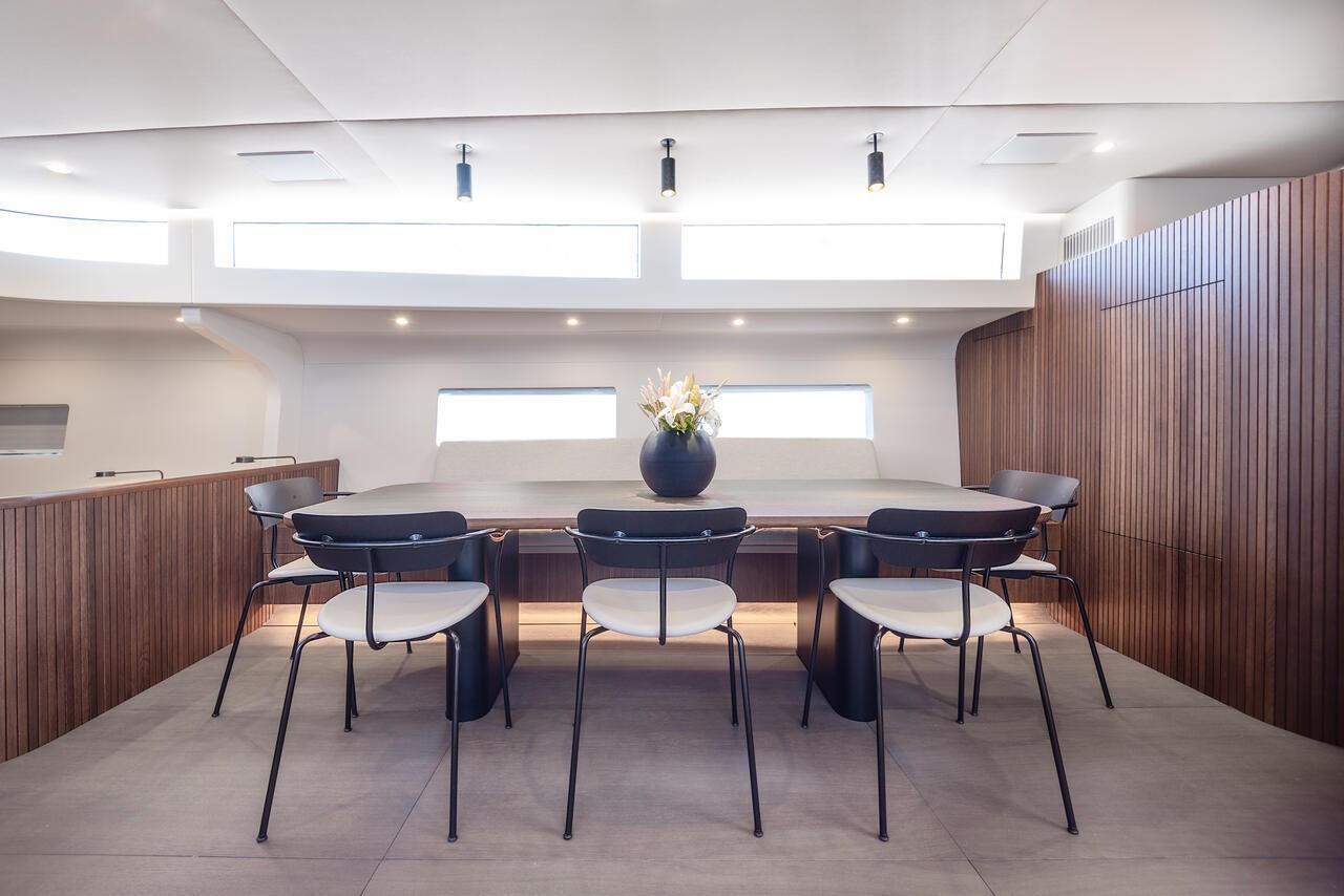 Le pont est équipé d’un gréement carbone Axxon, de systèmes d’enroulement hydrauliques et d’instrumentation B&G H5000 avec écran Nemesis. À bord se trouvent une unité de climatisation de 100 000 BTU, une machine à eau Schenker ZEN 150, un générateur Fischer Panda 25i PMS et 30 panneaux solaires intégrés sur le bimini pour une plus grande autonomie.