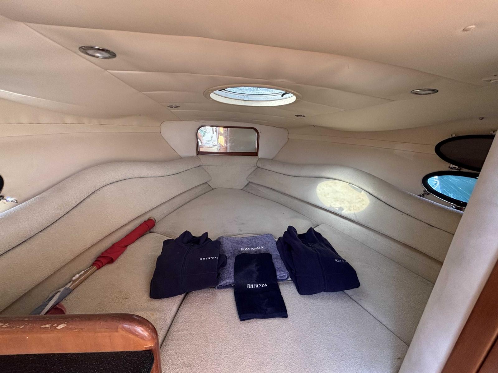 Cabine confortable permettant de dormir à bord, avec WC et rangements.