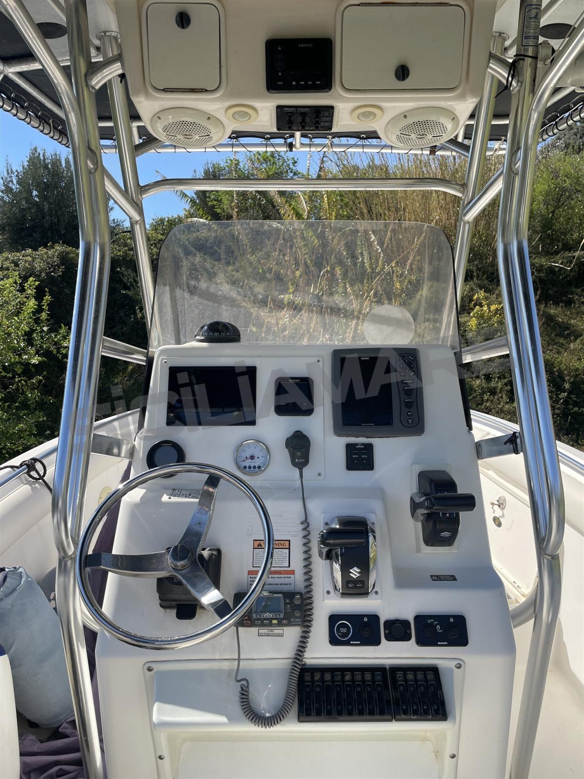 DIRECTION HYDRAULIQUE - GOUVERNAIL EN ACIER - KIT DE PANNEAUX SOLAIRES, MINUTERIE DE POMPE DE RÉSERVOIR VIVANT - AQUARIUMS - PORTE-CANNES (4) AVEC DRAINAGE - 6 BOÎTES LUMINEUSES SOUS T-TOP TOUCH - KIT 4 FEUX DE COCKPIT, FEUX ARRIÈRE (2 PIÈCES). COUVERCLE MOTEUR. MOTEUR AUXILIAIRE SUZUKI DE 20 CH (TRIM ET ALLUMAGE ÉLECTRIQUE) JUIN 2024 30 HEURES DE MOTEUR. PIÈCE SÉPARÉE AMÉNAGÉE POUR LES TOILETTES.