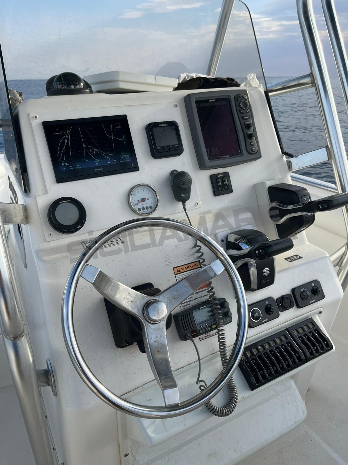 Commande électrique, Sondeur pêche (KODEN CVS 128 TRASDUTTORE DA 1Kw), Plotter GPS (GARMIN 8409XSV TRASD. GT 51 M-TM), Radio VHF (Cobra).