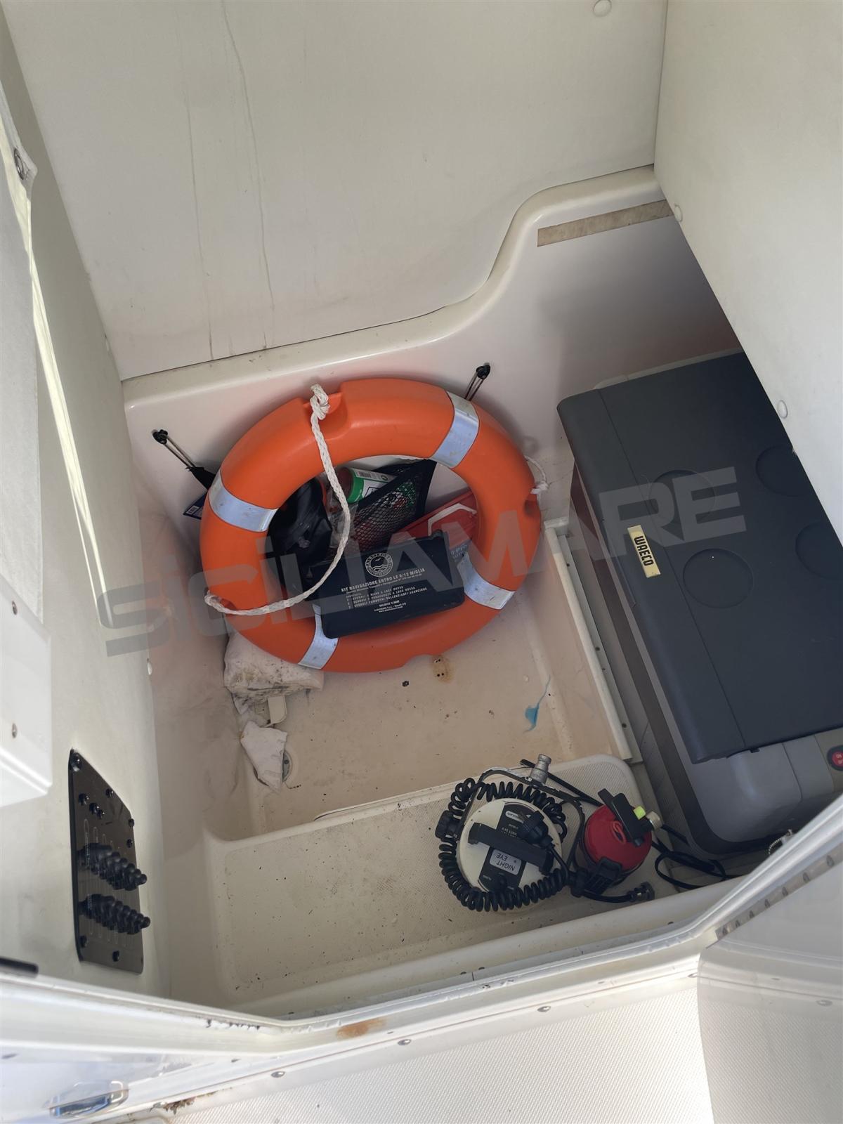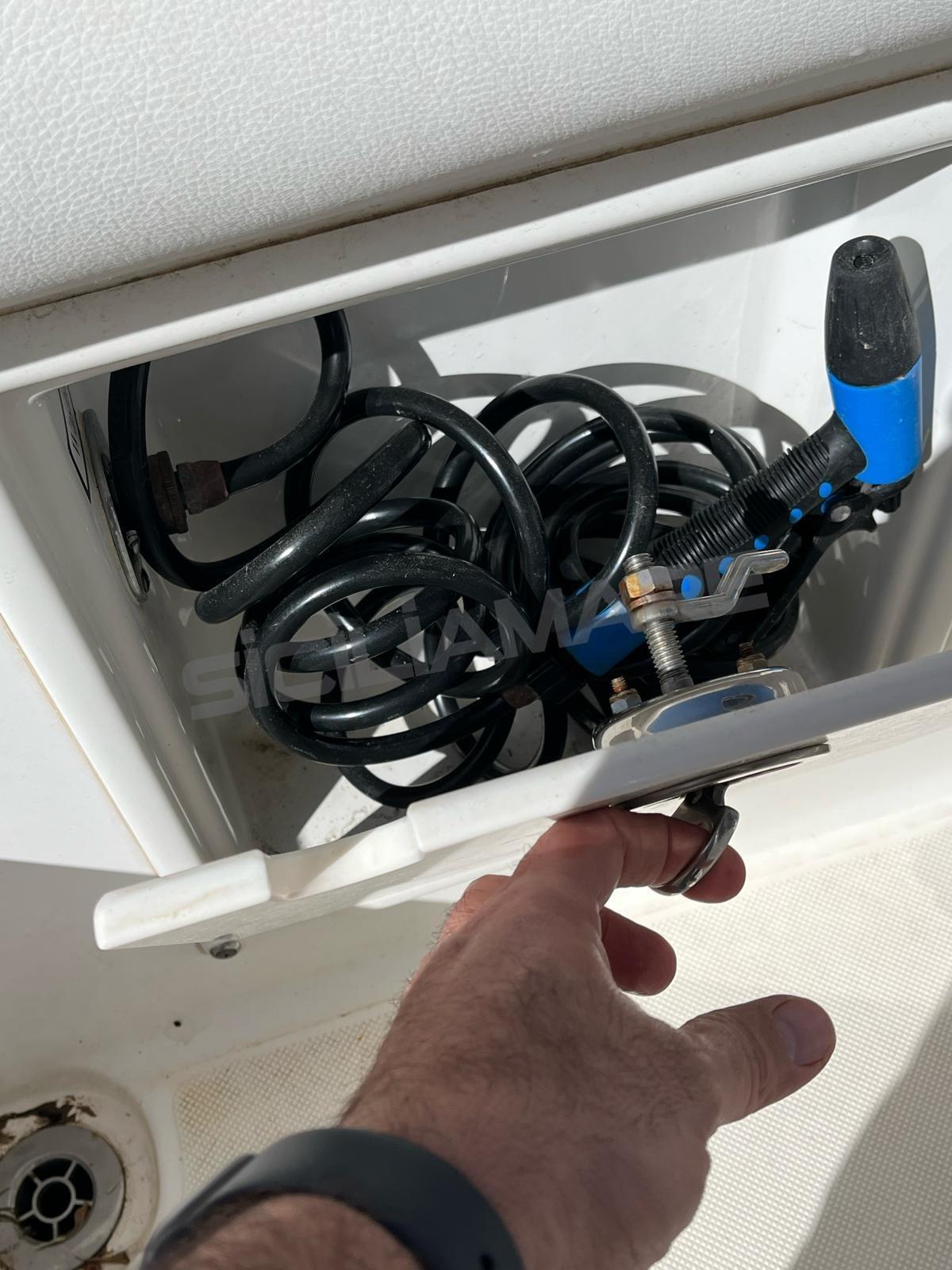 Alarme moteur, Eau sous pression, 3 Batteries (2023), Câble d’alimentation à quai, Douche de cockpit, Phares fixes arrière, Flaps électriques, Indicateurs de flaps, Lavabo dans le cockpit, Éclairage de courtoisie, Panneau solaire, Pompe de cale automatique, Pompe à Eau de Mer, Prise de quai, Guindeau électrique, T-Top (con box strumentazione).