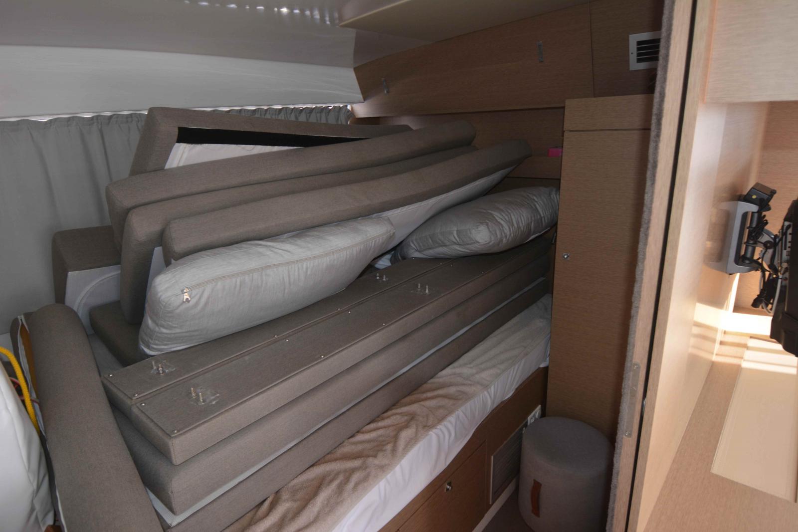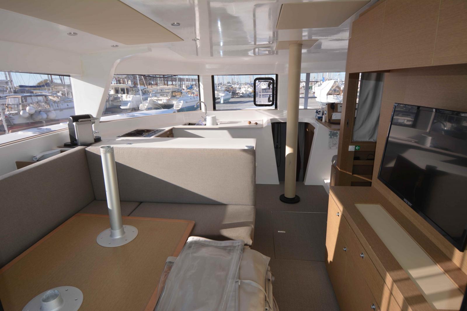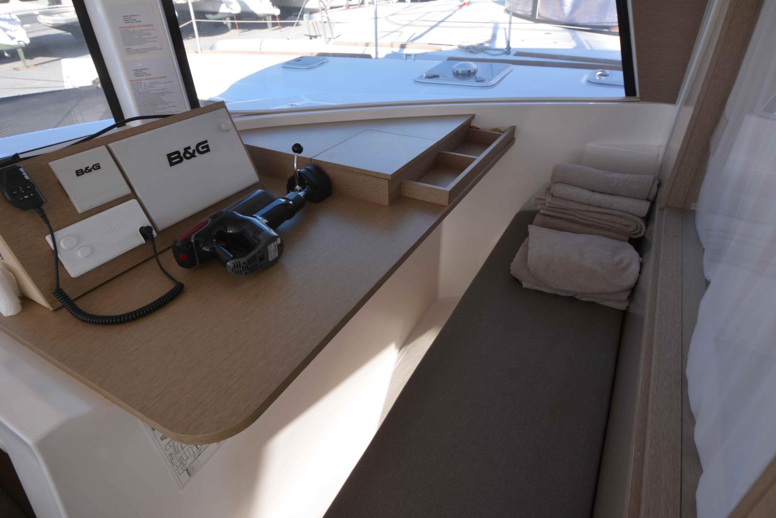 Les espaces de vie sont dignes d'un yacht bien plus grand : salon spacieux et lumineux, cabines confortables, flybridge panoramique, cockpit généreux. La coque centrale abrite les espaces de vie, tandis que les flotteurs offrent un rangement considérable.