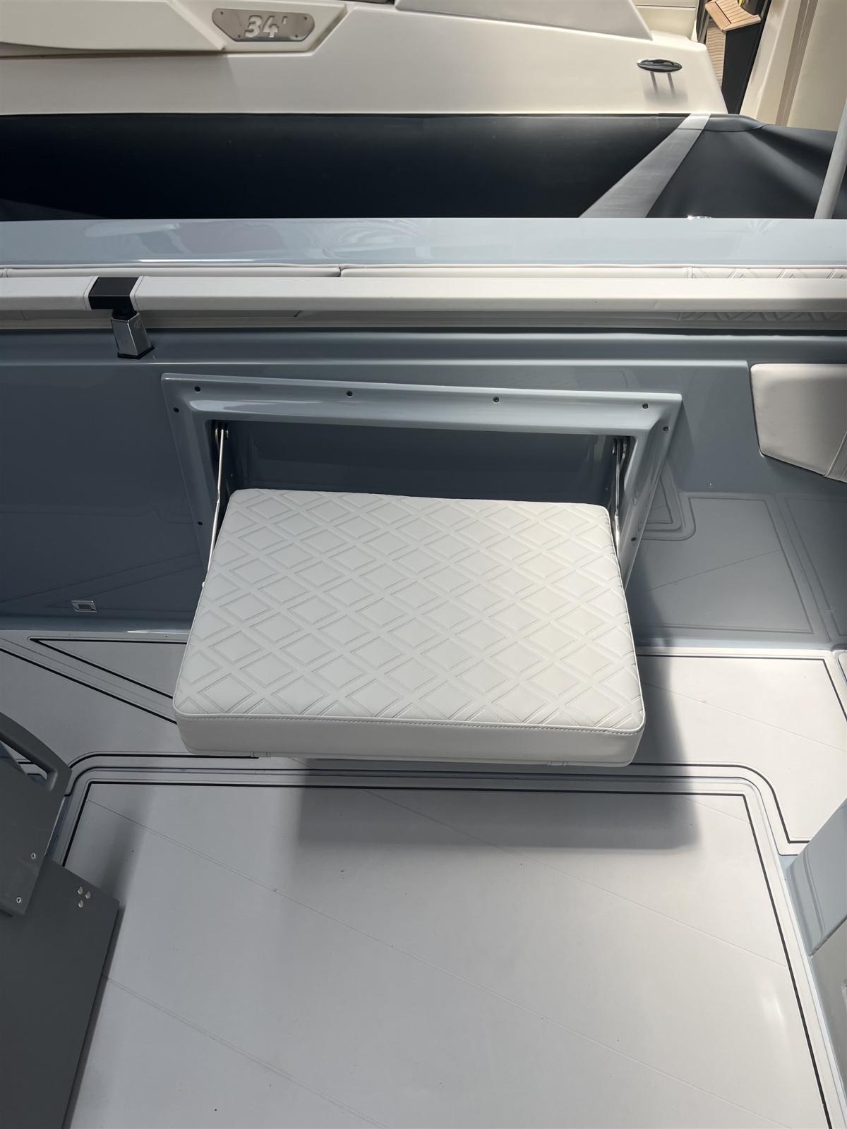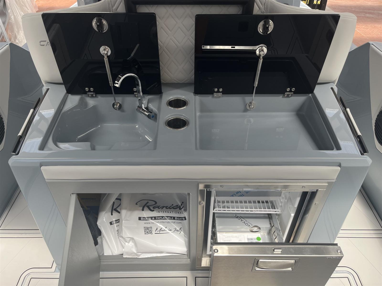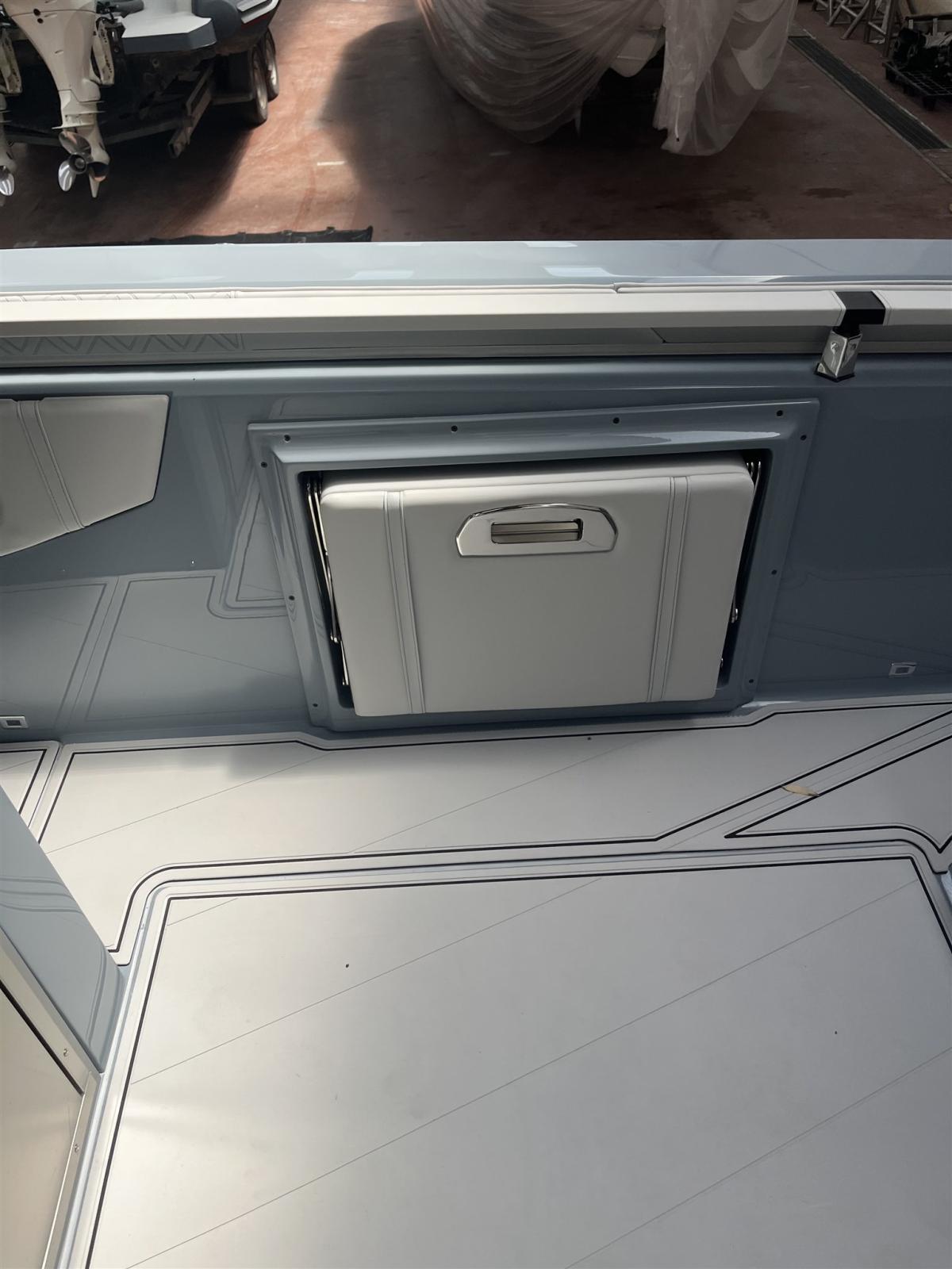 Réfrigérateur Est, radio stéréo HERTZ 4 + 2 tours, douche, LED Est, magnétoscope FLY TOP avec structure en acier inoxydable avec auvent et poteaux en carbone, SEA Deck sur le pont, tubulaires bicolores. Table arrière, Plates-formes allongées, Sièges rabattables dans le cockpit,