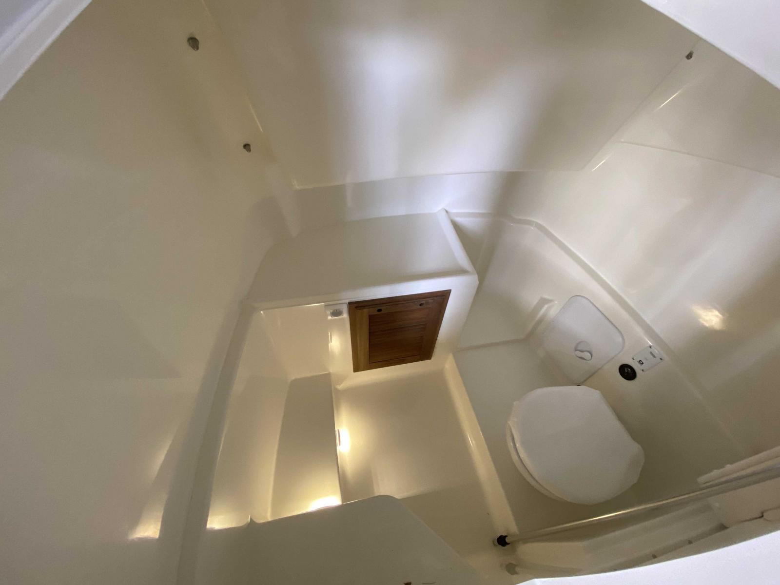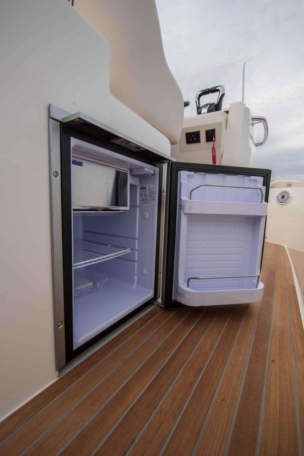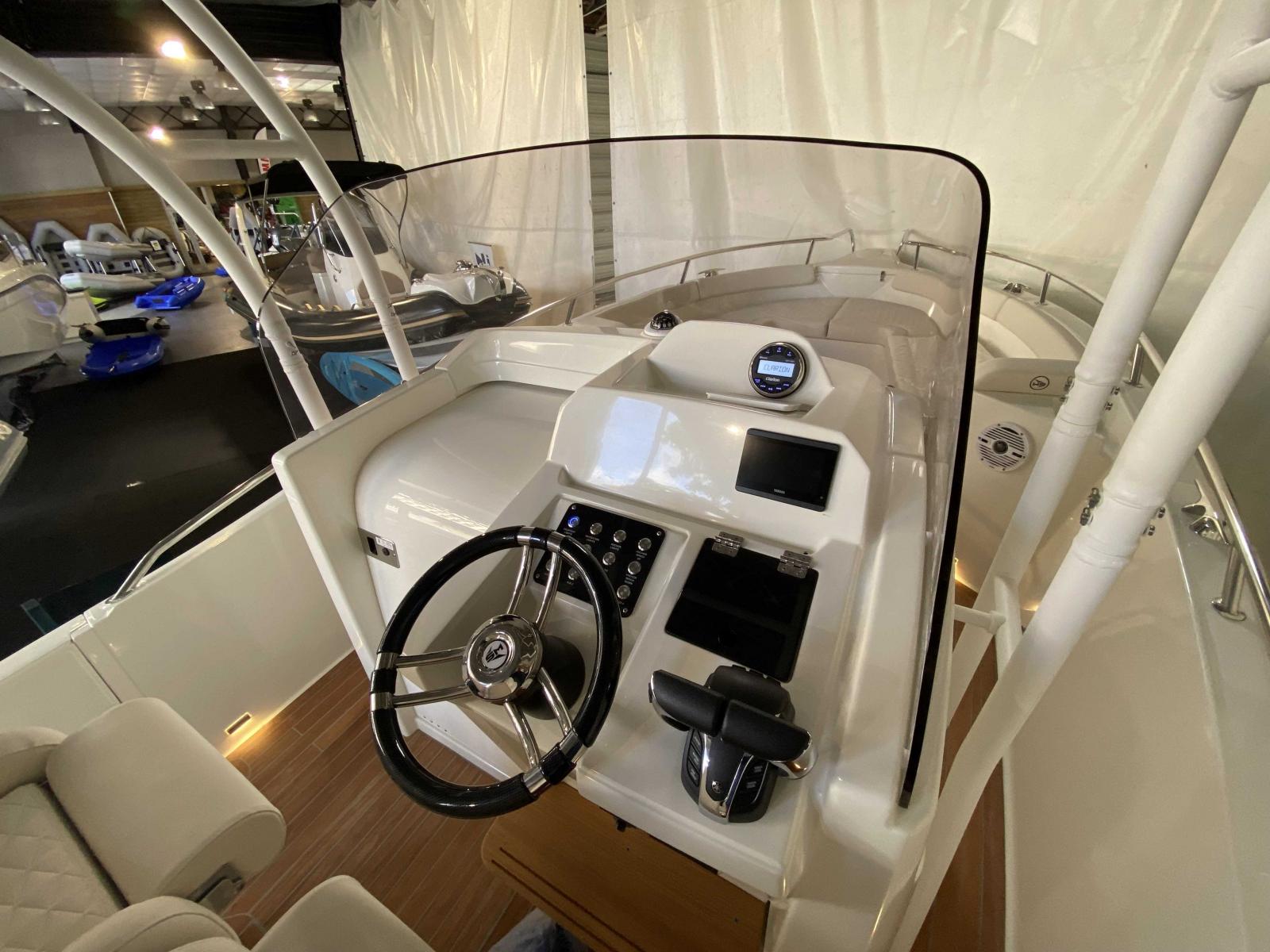Carré dinette sur le cockpit, leaning post avec évier, carré avant transformable en bain de soleil, pavois ouvrant à babord, grandes plateformes arrières pour un accès à la mer confortable, le White Shark 280